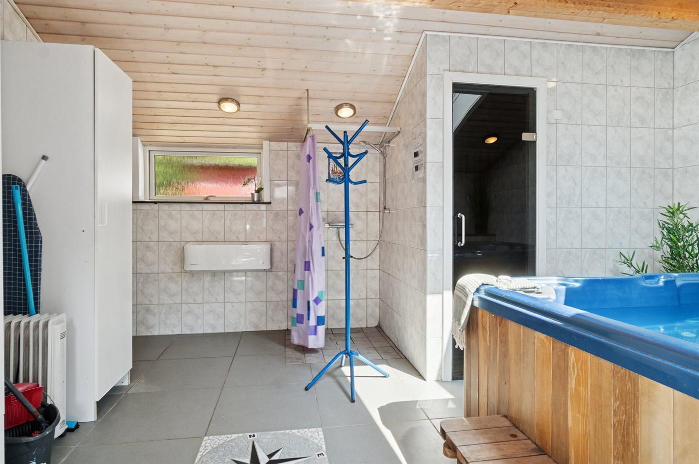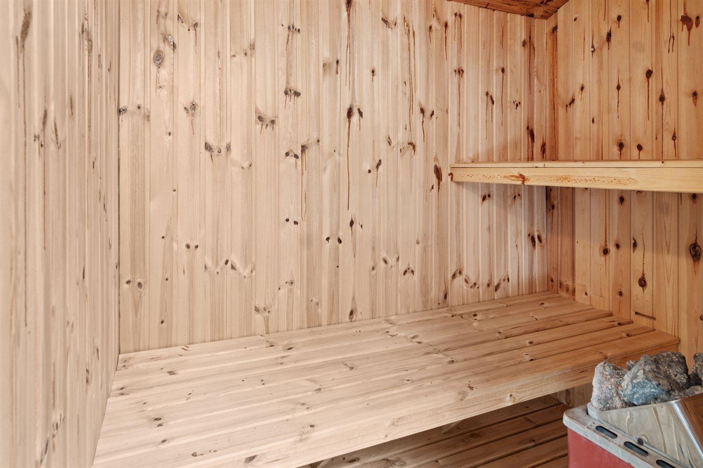 Der er 2 badeværelser med bruseniche og 3 toiletter, heraf 1 gæstetoilet I saunaen er der mulighed for afslapning.
