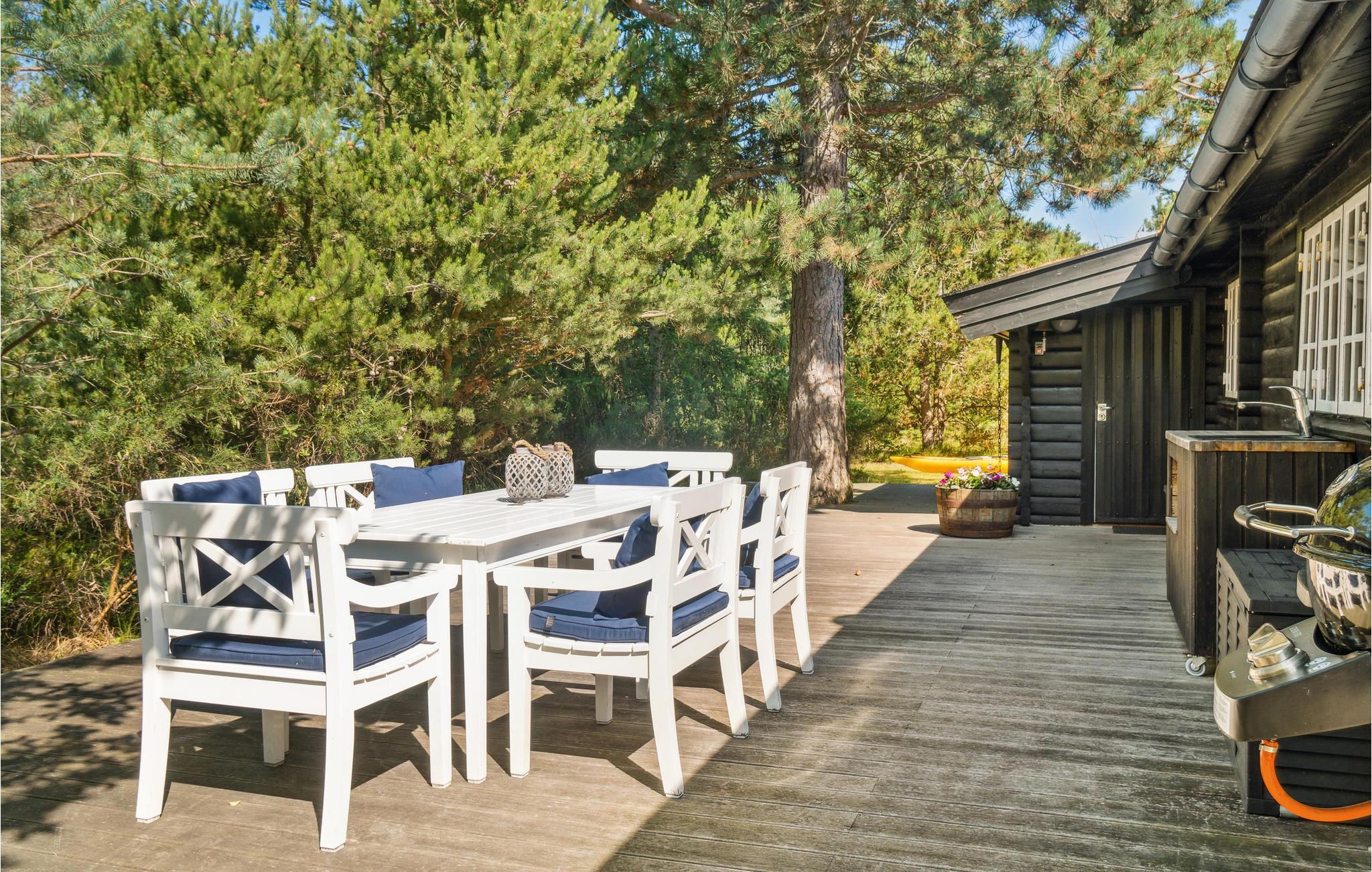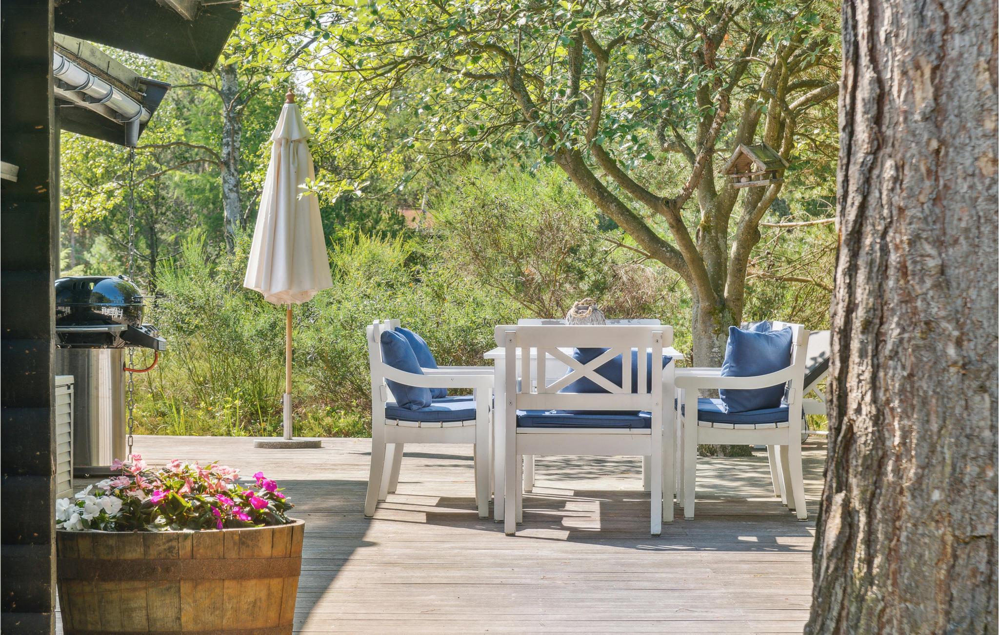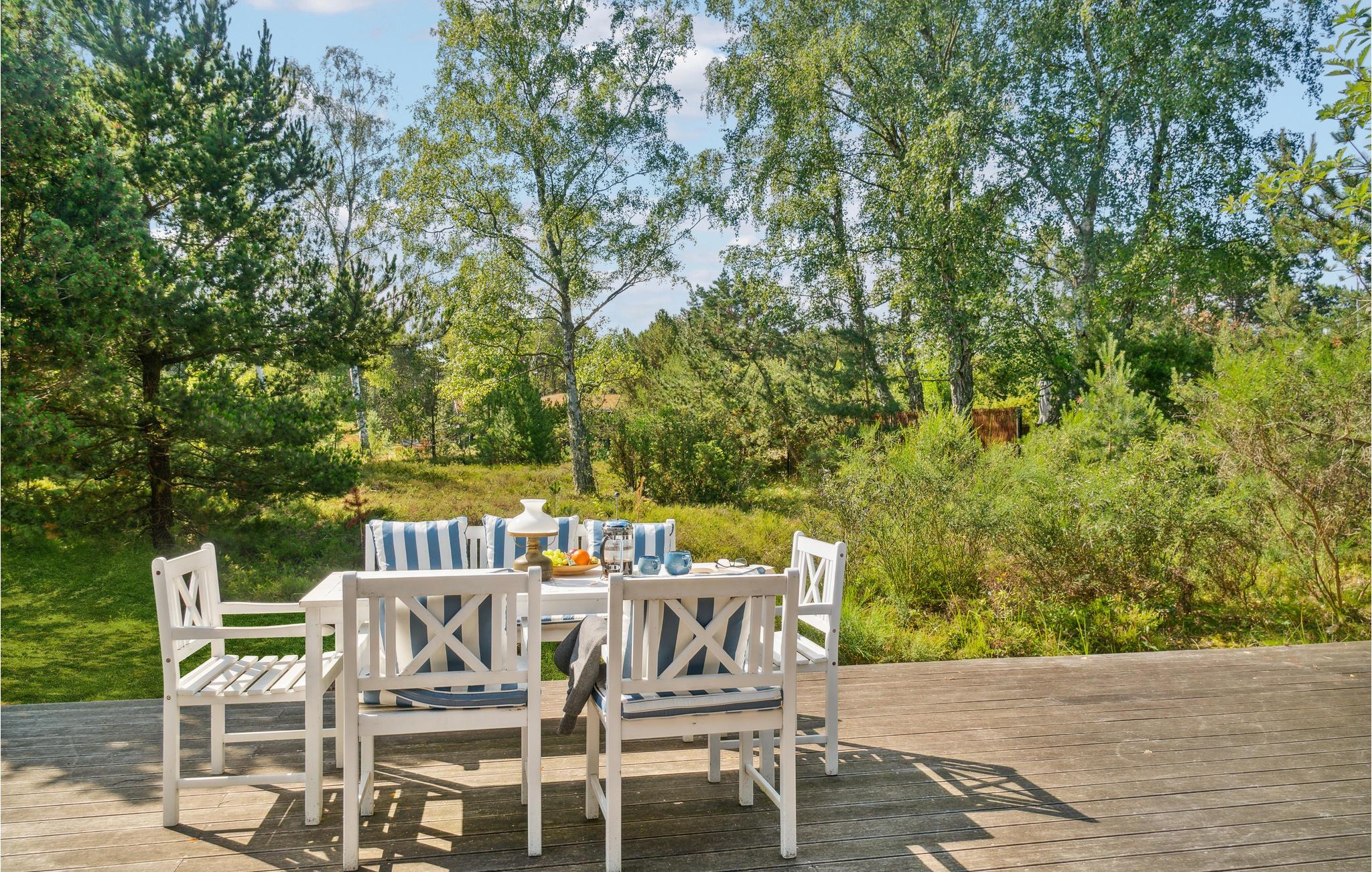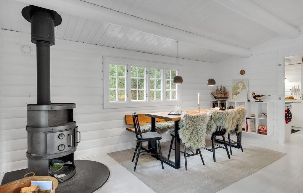 Søger I ro og privatliv, finder I det her i dette hyggelige feriehus på en skovklædt naturgrund! Indenfor bliver I mødt af lyse farver, der emmer af en indbydende og hyggelig atmosfære. Hyg jer sammen i sofaen, fyr op i brændeovnen på kølige aftener, eller spil et brætspil ved spisebordet. På den store træterrasse kan I solbade eller nyde jeres grillretter og lægge planer for de kommende feriedage.