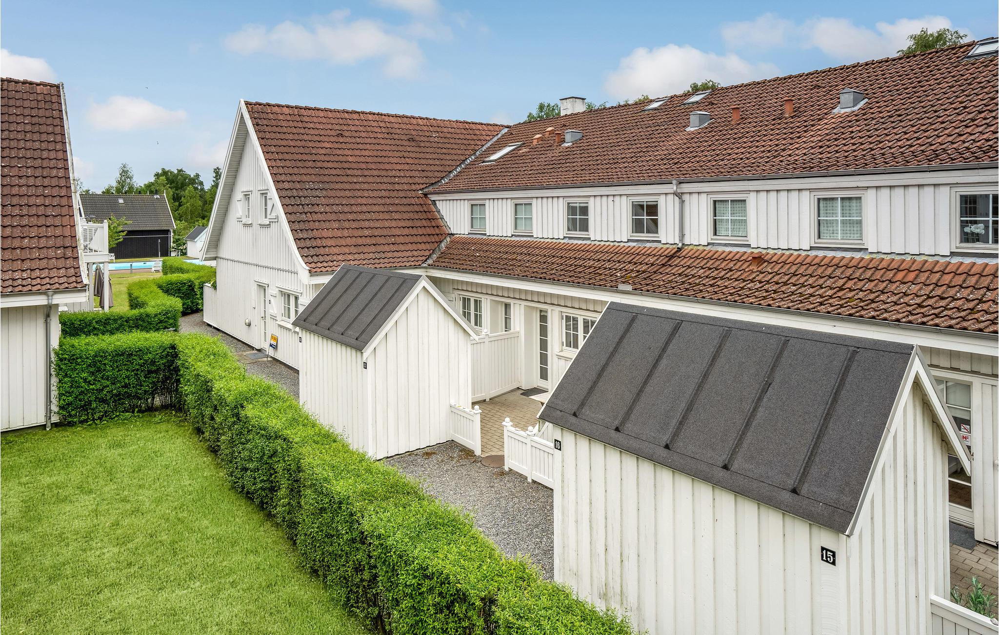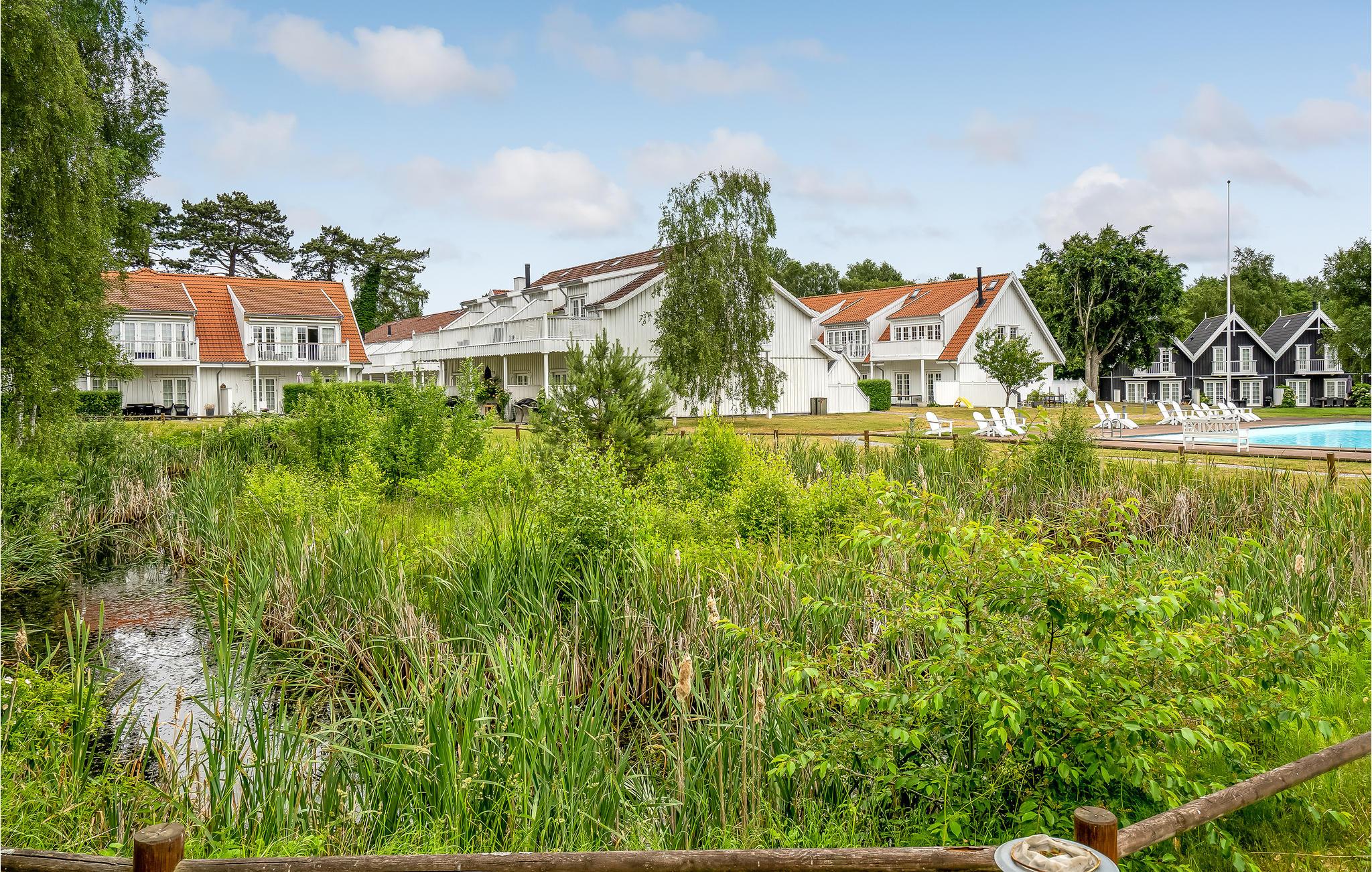 Hyggelig ferielejlighed i træ med sauna, boblebad og adgang til fælles pool nær strand og natur.