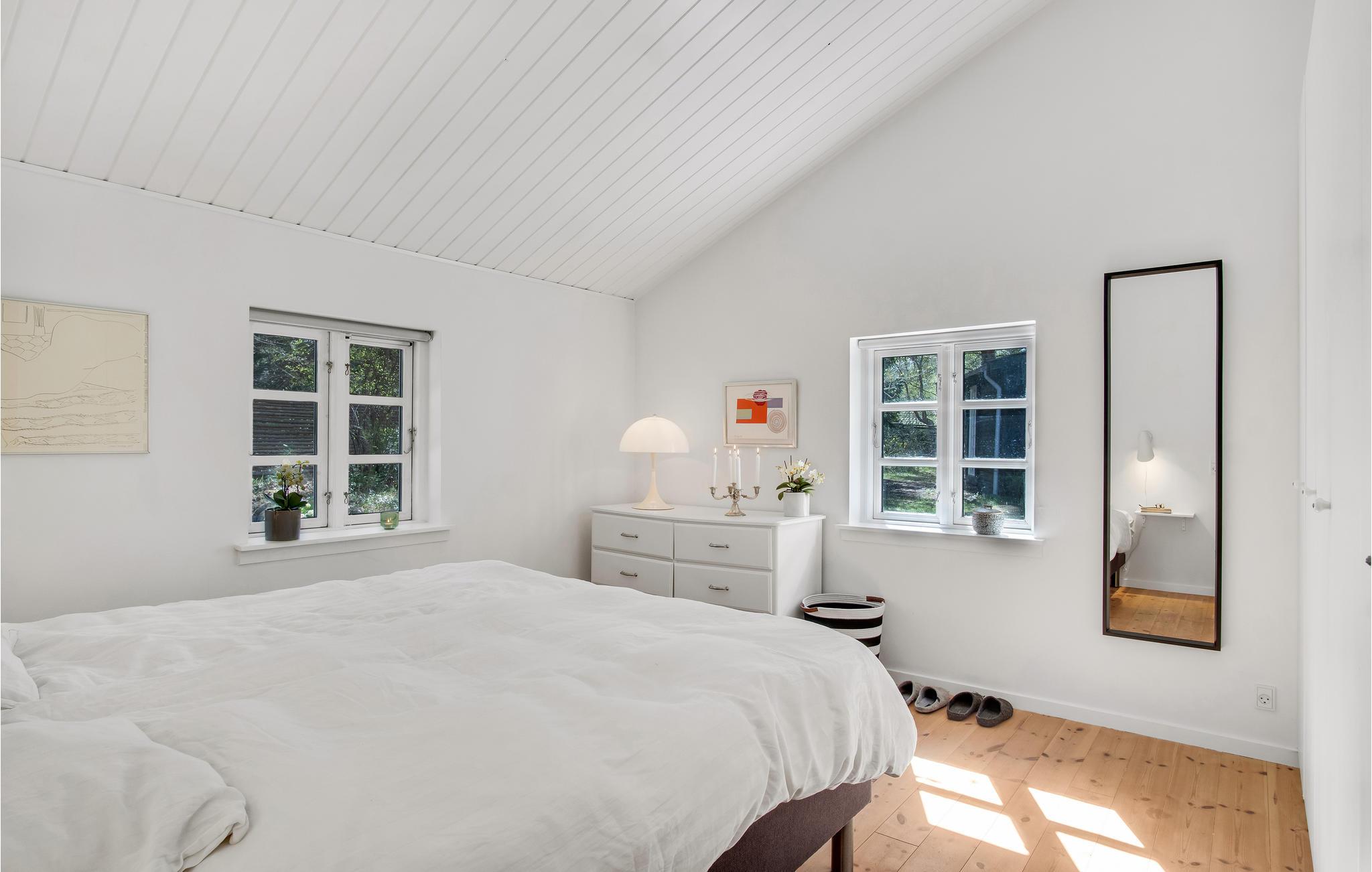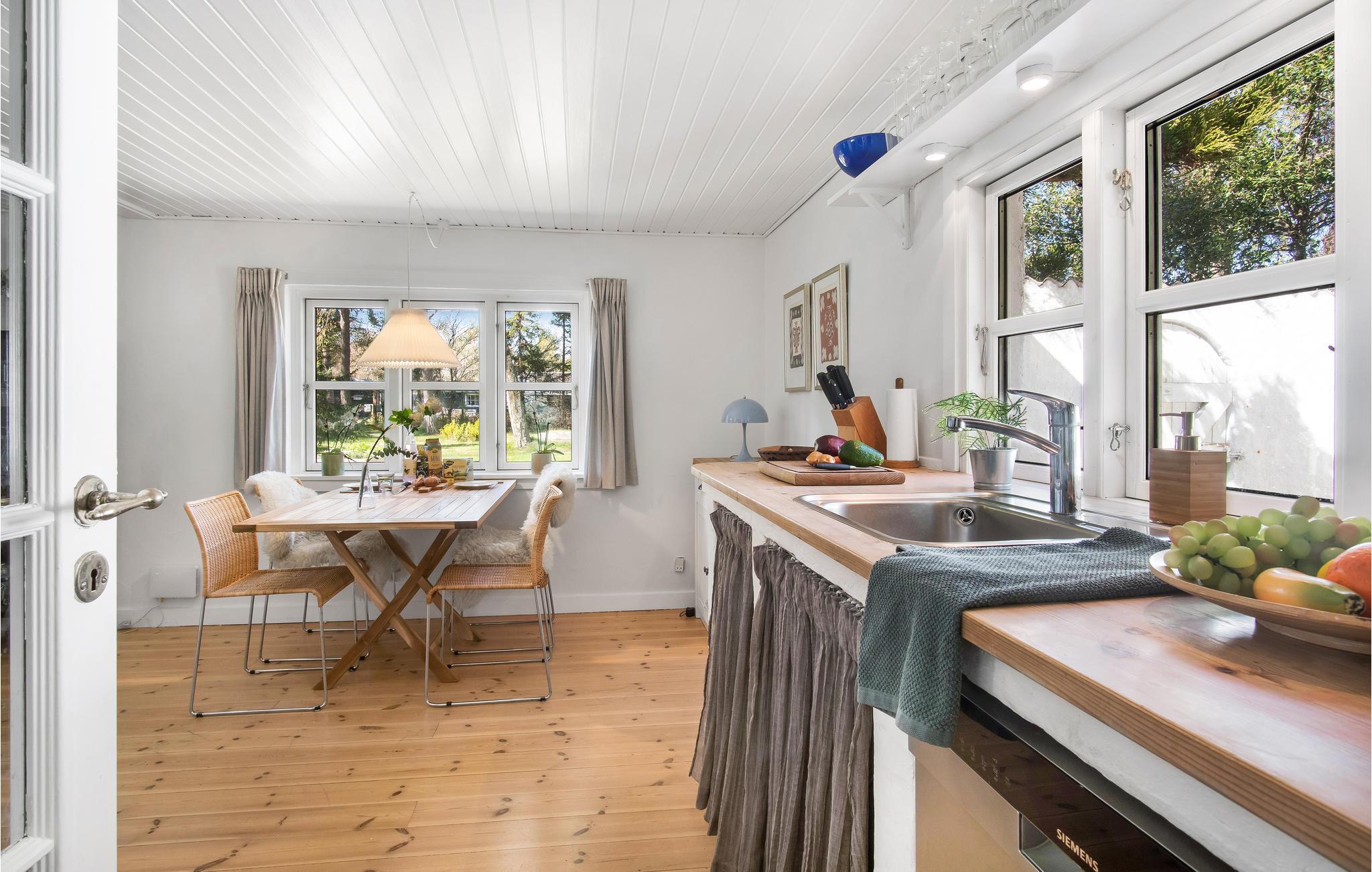 Alt ånder fred og idyl på denne skønne grund, som ligger i et dejligt sommerhusområde nord for Nykøbing. Her slår I dørene op til et charmerende hus med moderne møbler og flotte istandsættelser, der passer godt med oprindelige detaljer som trægulvene og sprossevinduerne. Huset har en rolig atmosfære, så her man kommer helt automatisk ned i tempo. I vintersæsonen kan I fylde dagene med raske gåture og vende hjem til hygge i stuen med brætspil og ild i brændeovnen. Der er også gode rammer til at samles udendørs. Vælg en af ??de to terrasser og dæk op til dagens måltider i fuld solskin.
