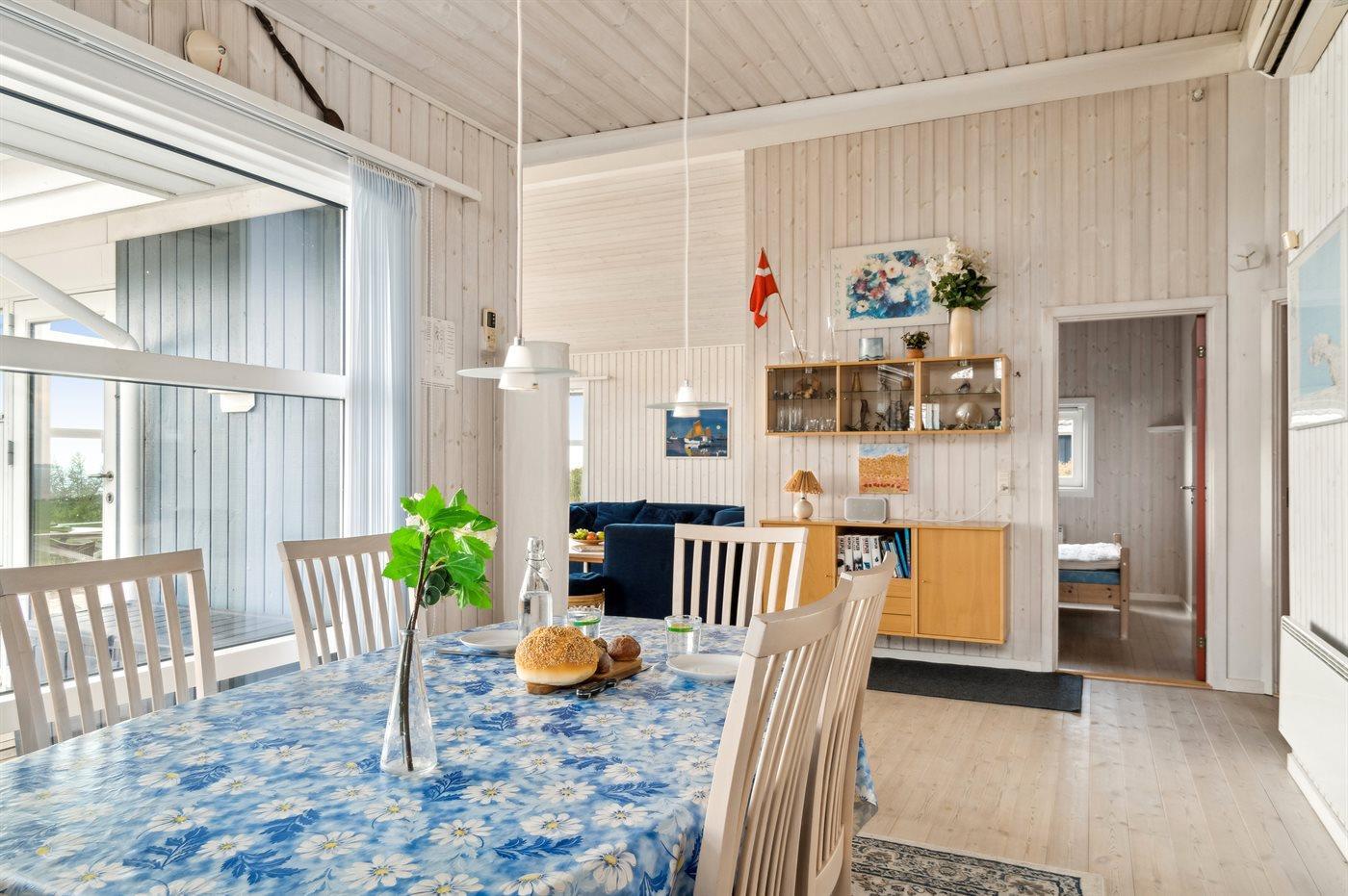 Huset består af køkken, spiseplads og stue ud i et med udgang til det store terrasseområde. Der er 3 soveværelser med hver 2 sovepladser samt en hems med i alt 4 sovepladser på madrasser. Der er 2 badeværelser, som begge er med bruseniche og gulvvarme. Der desuden vaskemaskine. Huset er lyst og rummeligt takket være de store vinduesarealer og den høje loftshøjde med loft til kip. Huset opvarmes energivenligt med luft-til-luft varmepumpe, og der er tillige brændeovn.