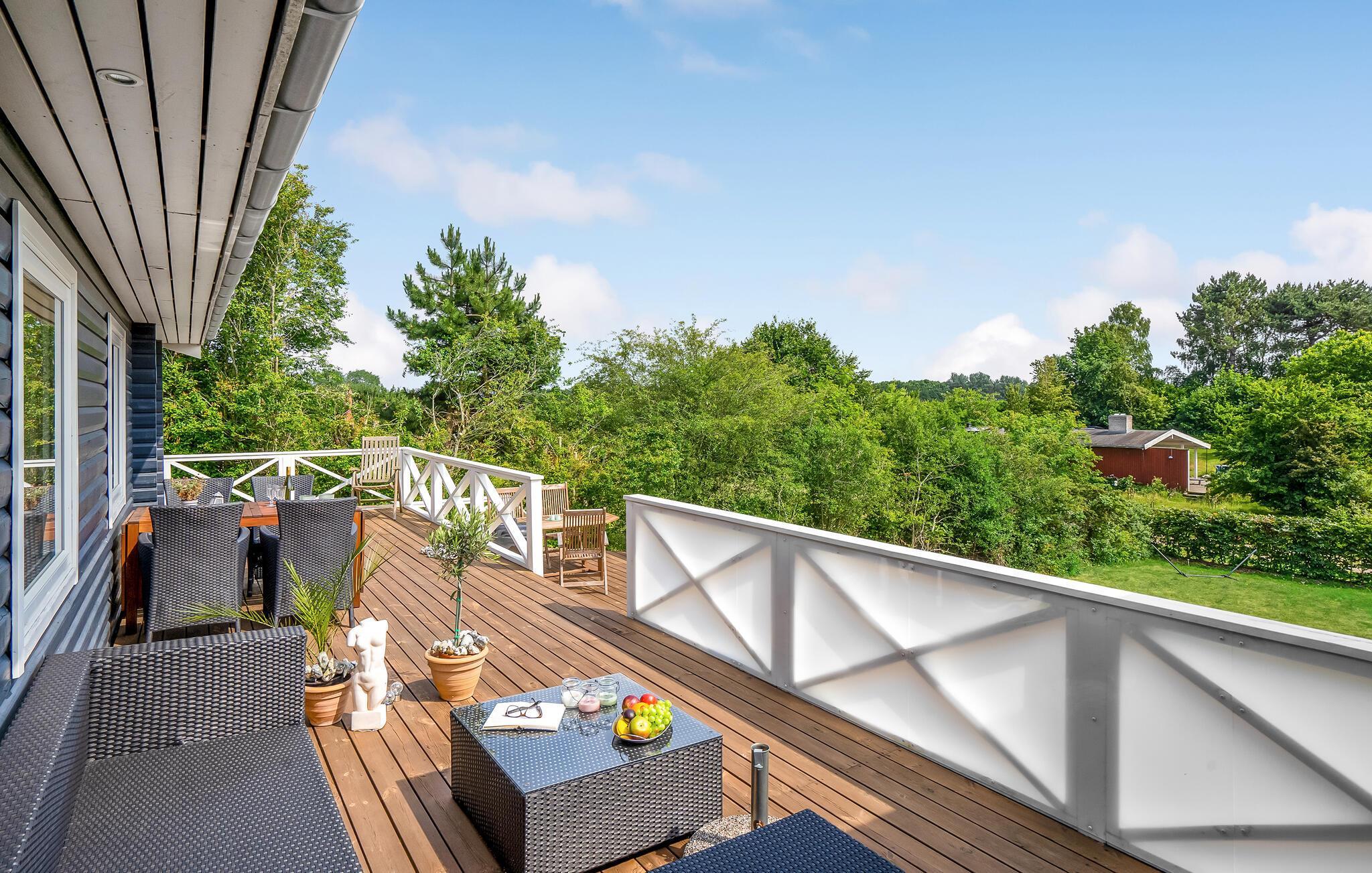 Lyst, hyggeligt sommerhus på høj grund nær stranden med udespa og stor terrasse.