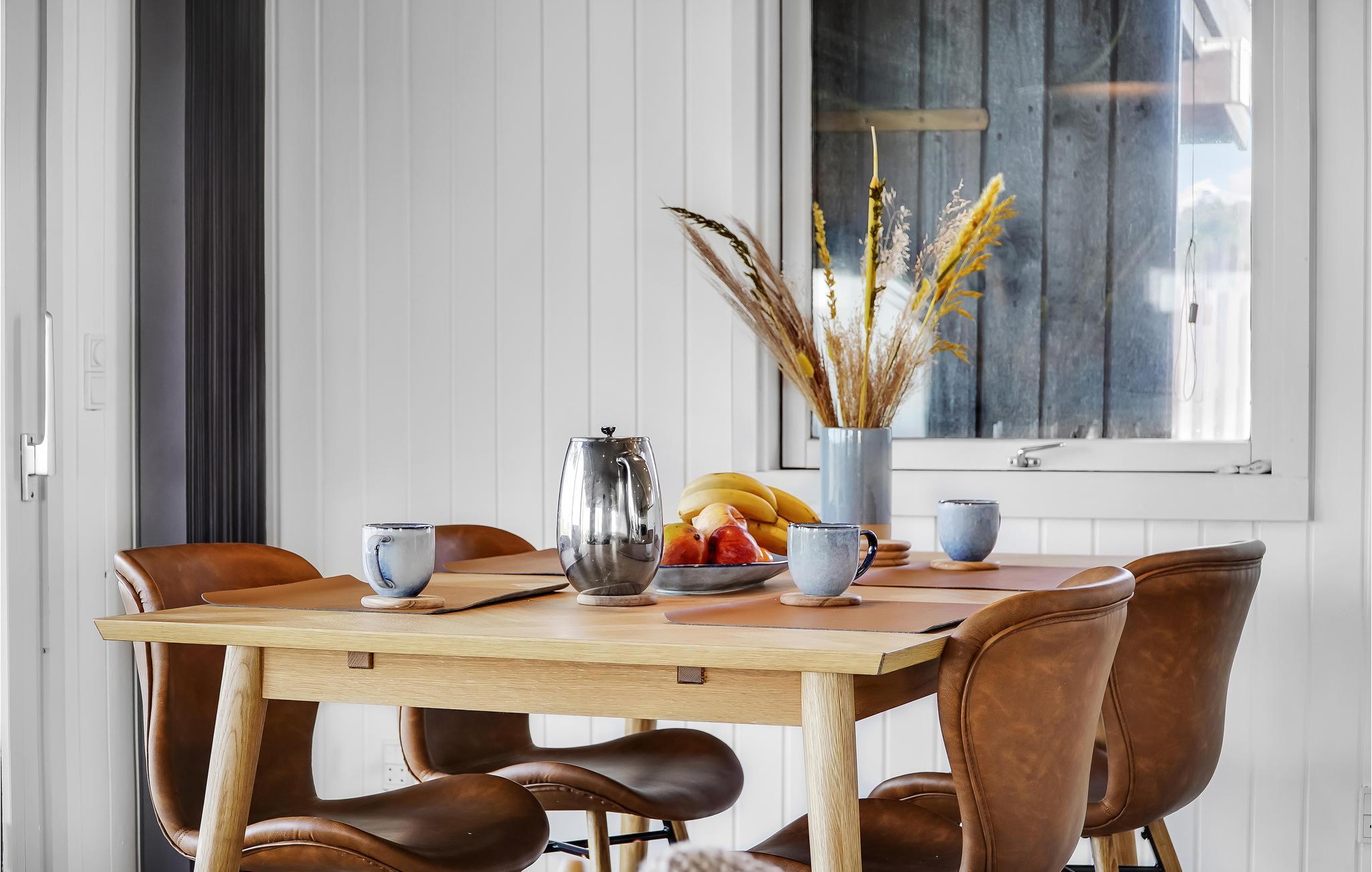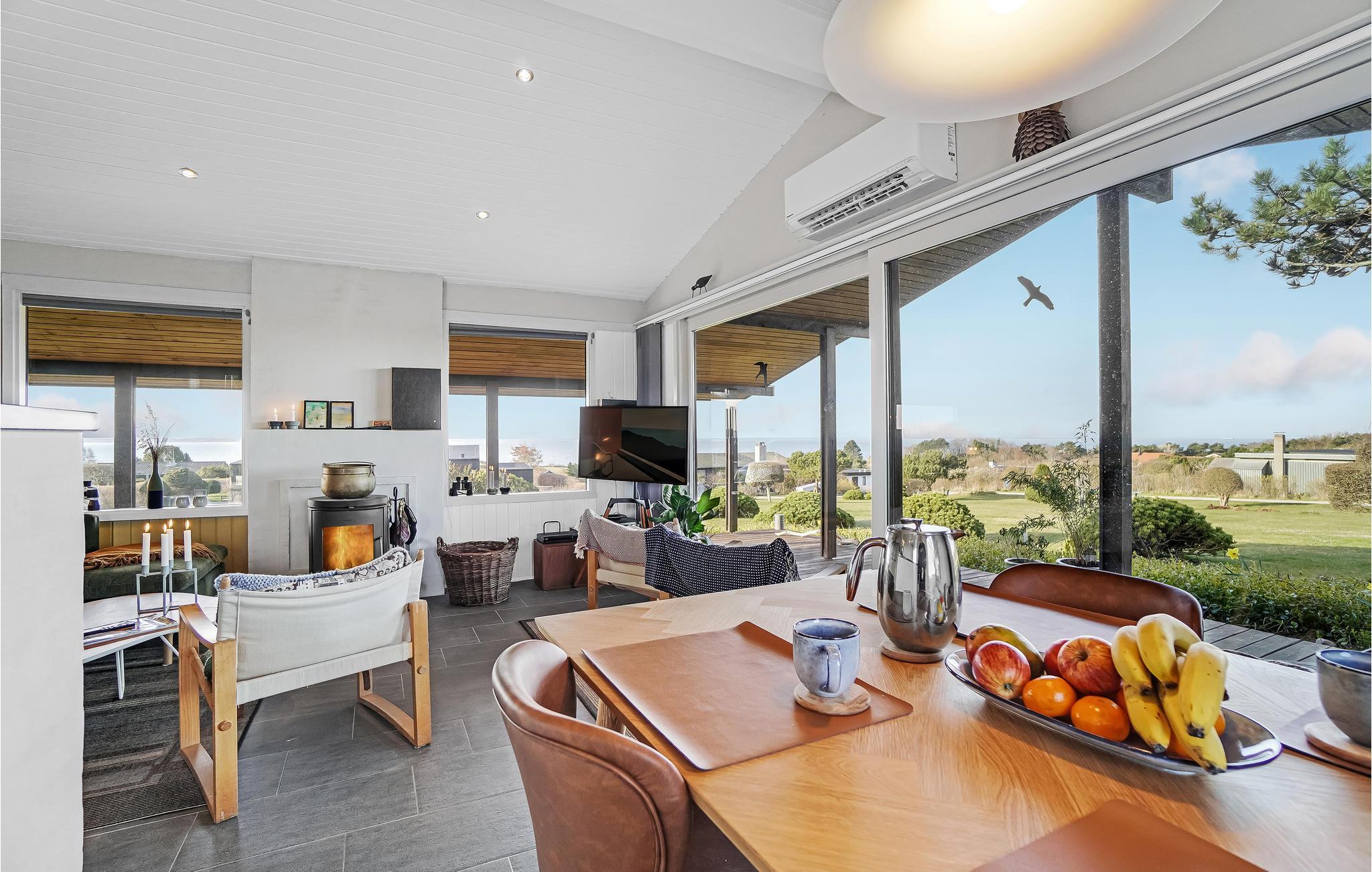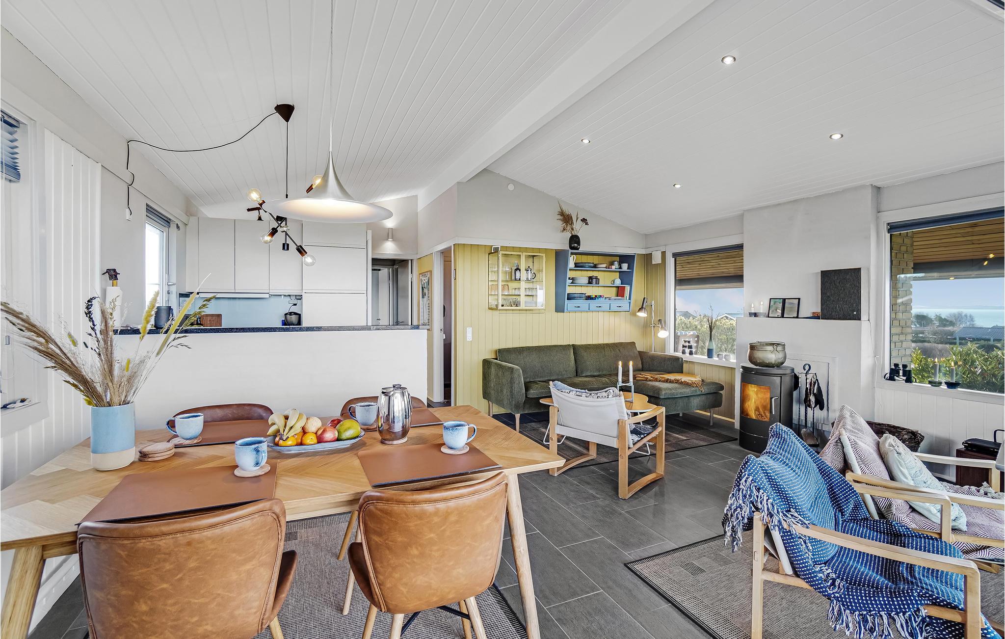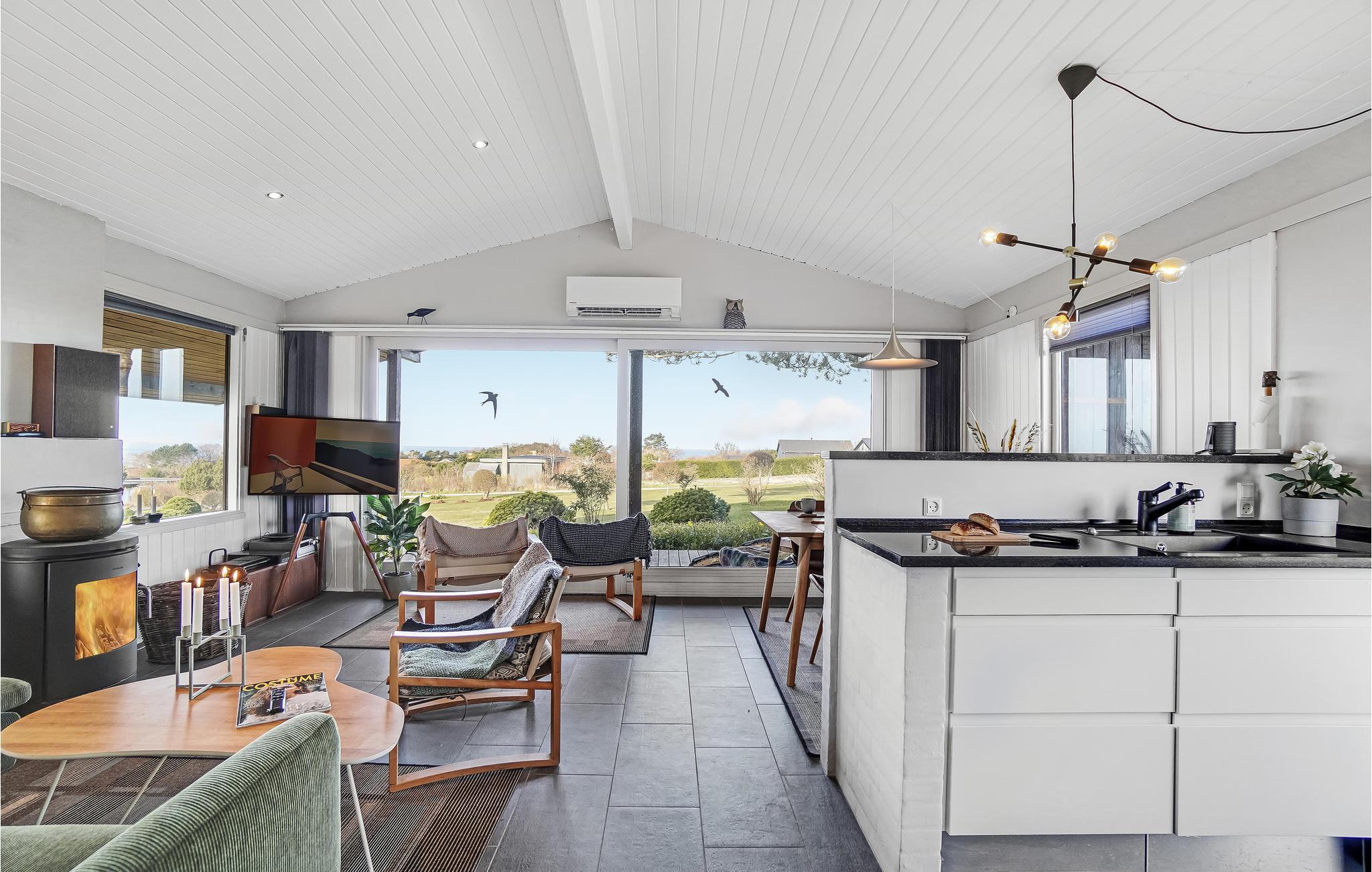 Velkommen til dette utroligt charmerende feriehus. Indvendigt kan I se frem til store, åbne rum med smagfuld indretning og store vinduespartier, der giver et dejligt lysindfald og et flot udsyn til haven og havet i baggrunden. Husets hjerte er den kombinerede spise- og opholdsstue med køkken, som bliver samlingspunktet for mange gode stunder. Her kan I tilberede og nyde lækre feriemåltider, sidde og hyggesnakke i sofaen, spille kort, brætspil eller Playstation 3 og streame jeres yndlingsfilm- og serier på fladskærmen med Chromecast.