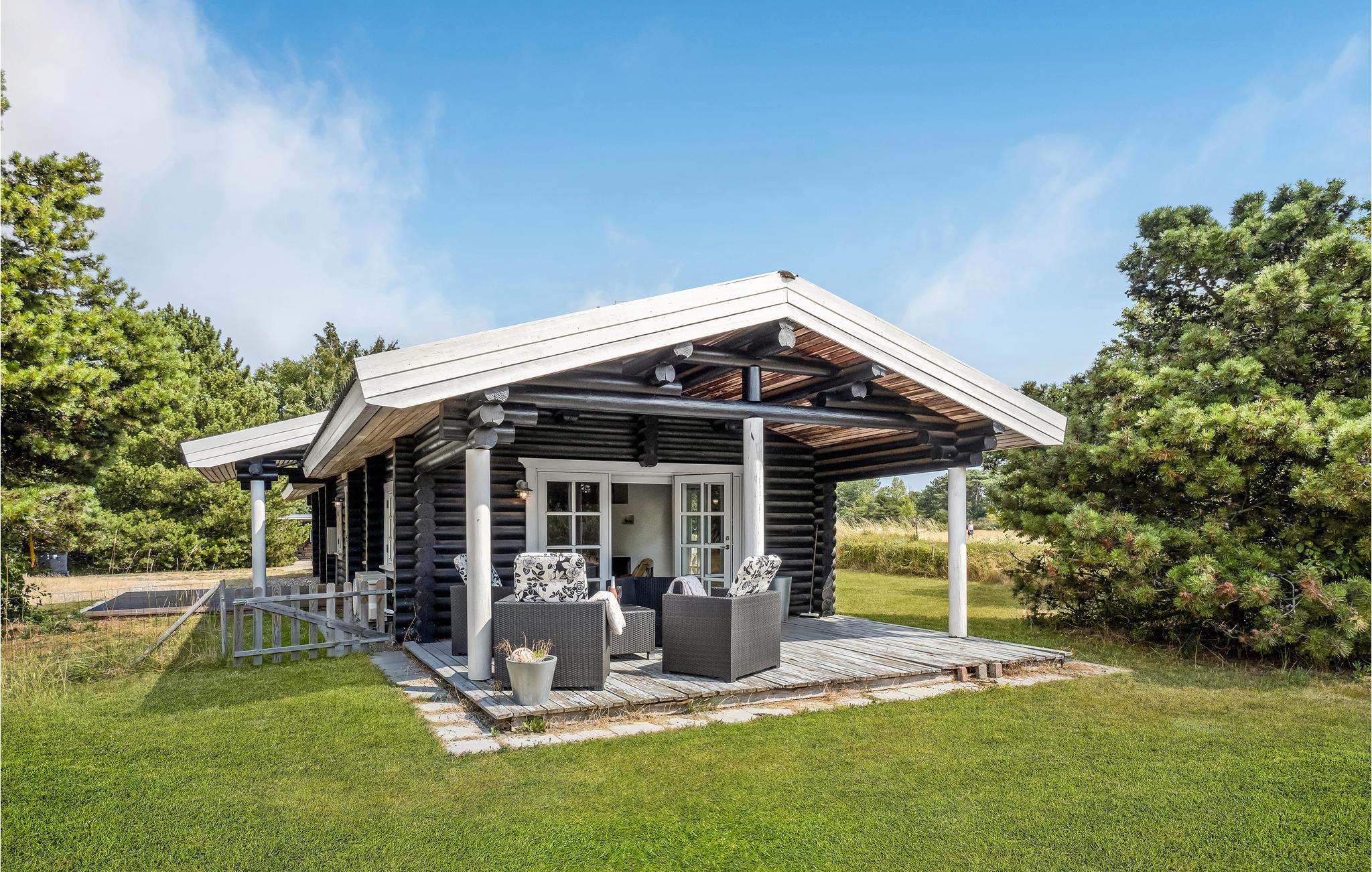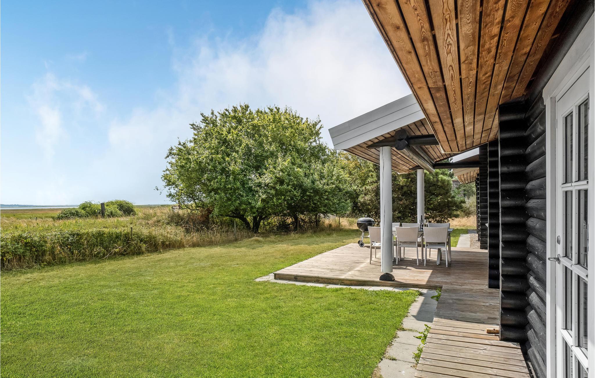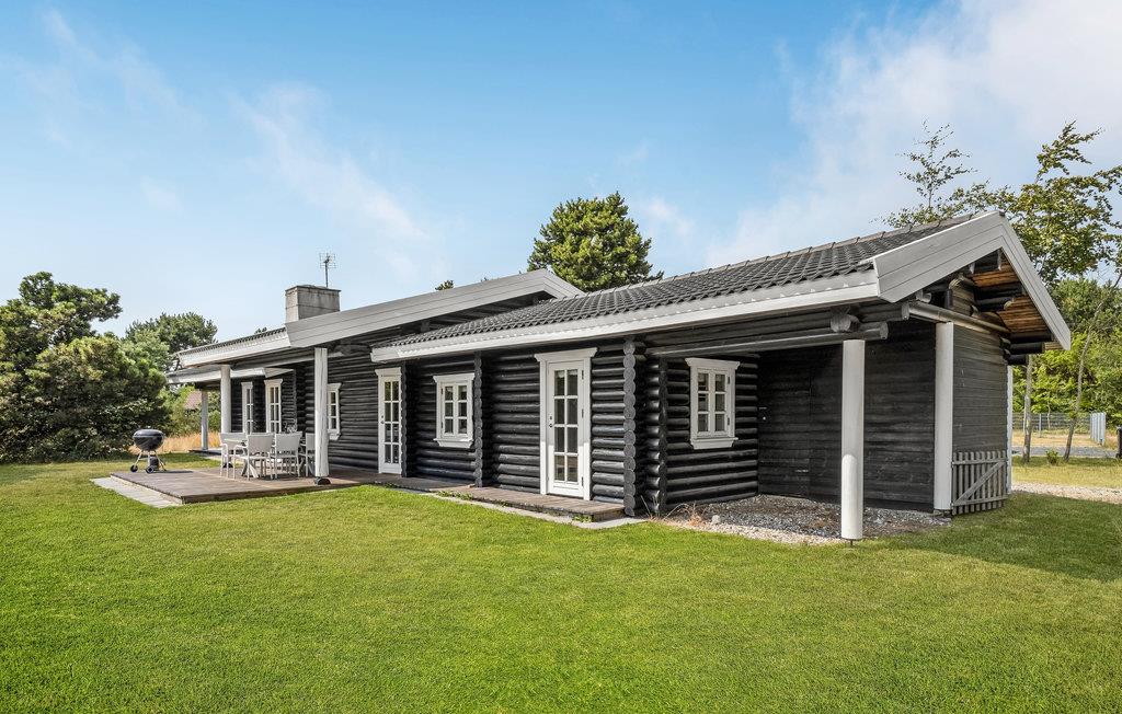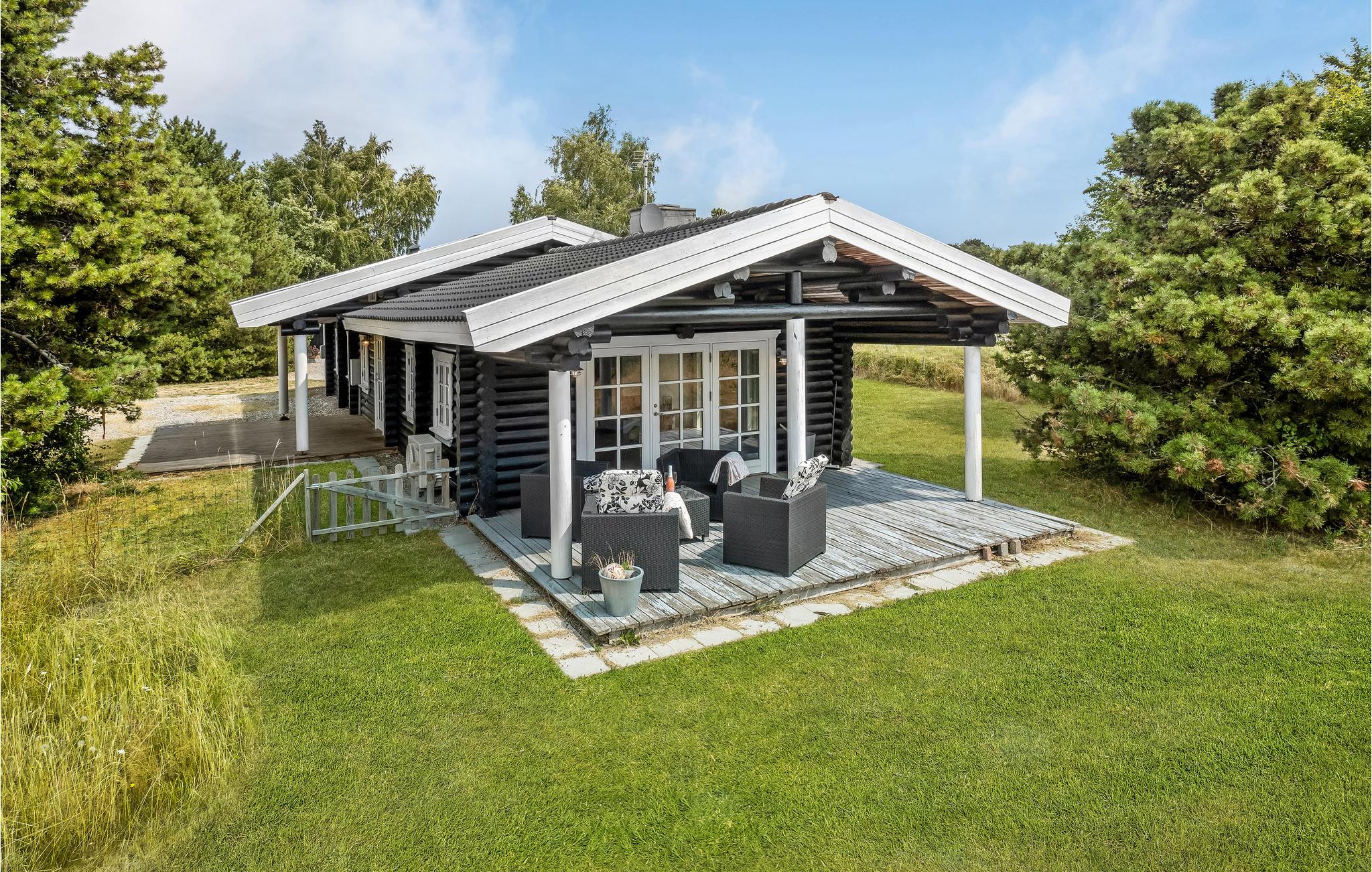 Hyggelig bjælkehytte på Reersø med spabad, pejs, havudsigt og stor naturgrund nær stranden.