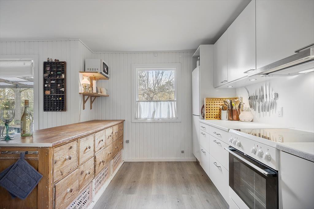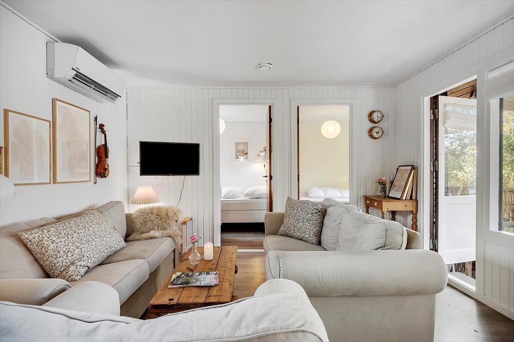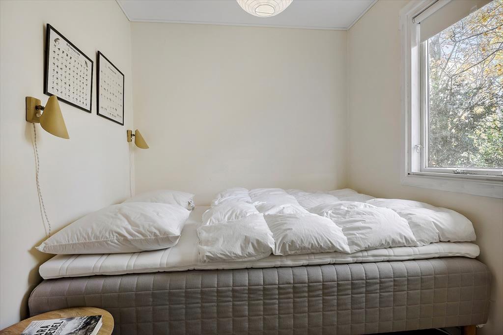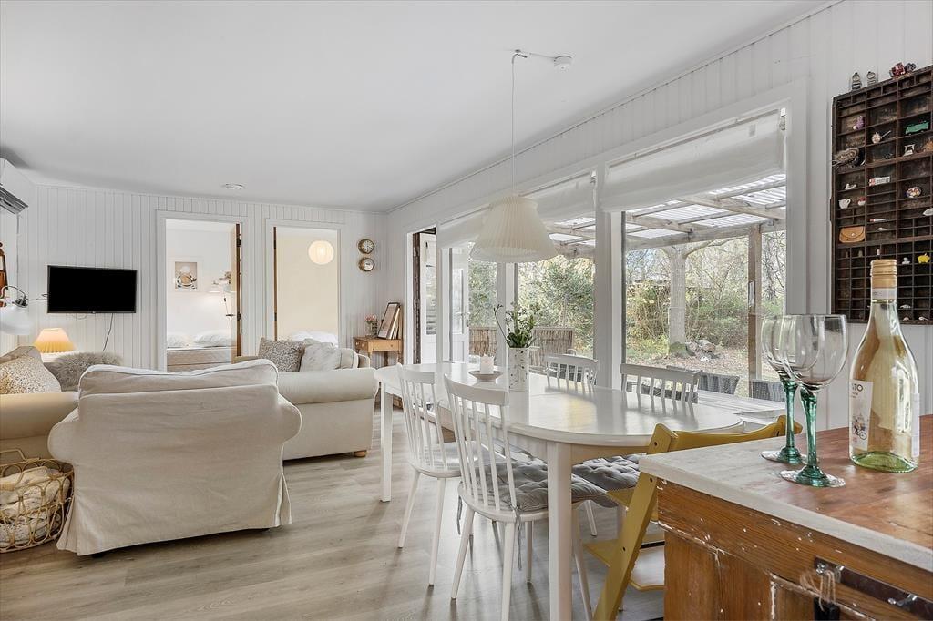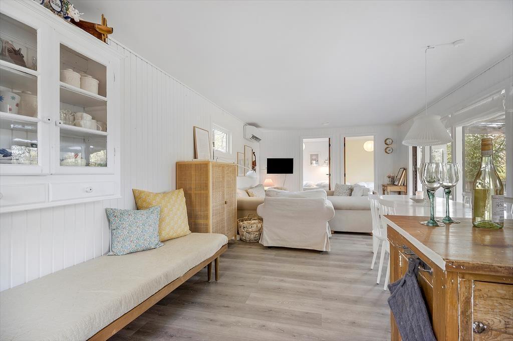 Velkommen indenfor: Huset er indrettet i lys og komfortabel sommerhusstil, der giver huset sin helt egen charme. Giv jer god tid til familievenlige aktiviteter i den hyggelige lyse stue med det åbne køkken, hvor familien kan samles om måltiderne eller spille et hyggeligt brætspil om aftenen. Huset har et mindre toilet med bruser bag toiletdøren og to soverum, begge soverum er med dobbeltsenge og det ene værelse har en fin tremmeseng. Huset er derfor yderst velegnet til den lille familie eller et par.