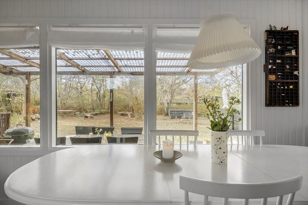 Nyd livet udenfor: Træd ud i de dejlige omgivelser, læs en god bog på den overdækkede terrasse eller tag en lur i hængekøjen. I haven er der flere muligheder for udendørs leg, boldspil og hygge med sansegynge, træbænke og pallemøbler. Tag på en lille tur fra sommerhuset, gå ca. 250 meter og få en frisk dukkert ved stranden eller udforsk det skønne område på en længere gåtur. Slut sommerdagene af med manér med at grille under åben himmel og lad udendørsoplevelsen udfolde sig.