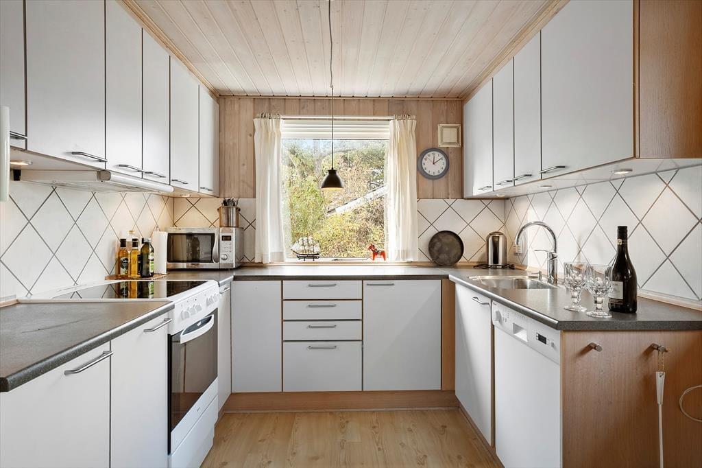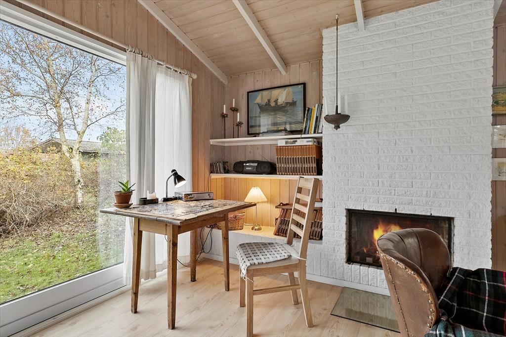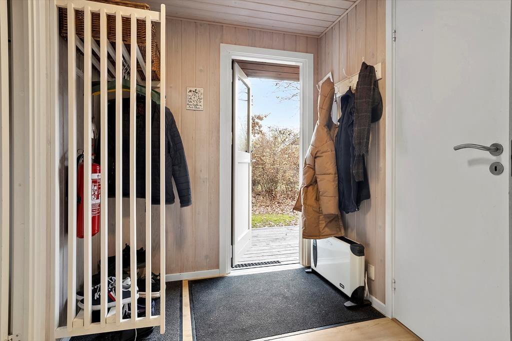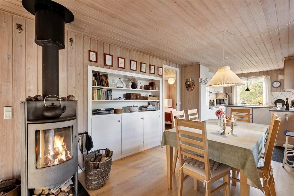 Velkommen indenfor: Indendørs finder du en rummelig indgang med god garderobeplads, der fører dig videre til badeværelset med brus, god skabsplads og vaskemaskine. Stuen er i kombination med et åbent køkken, der sammen med spisepladsen, er perfekt til fælles hygge. Huset har 3 komfortable soveværelser, det ene med dobbeltseng, et med 2 enkeltsenge og det sidste med 4 køjepladser. Sommerhusets indretning skaber en dejlig rolig og hyggelig atmosfære. Læs en spændende bog fra husets bogreol, nyd udsigten fra stuen ud mod haven og havet. Tænd gerne op i brændeovnen eller i pejsen på de køligere dage, og lad roen og sommerhusstemningen sænke sig.