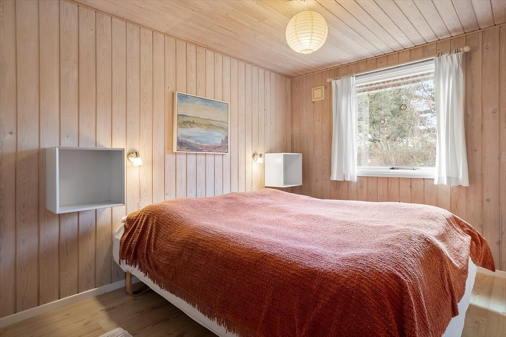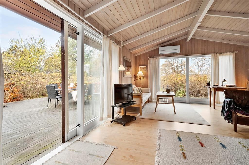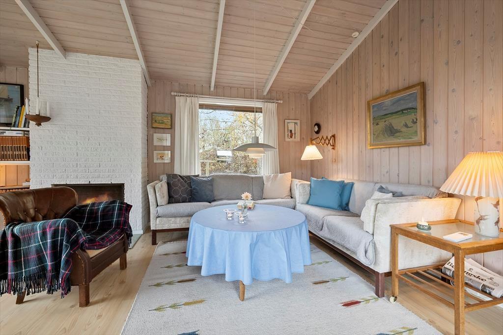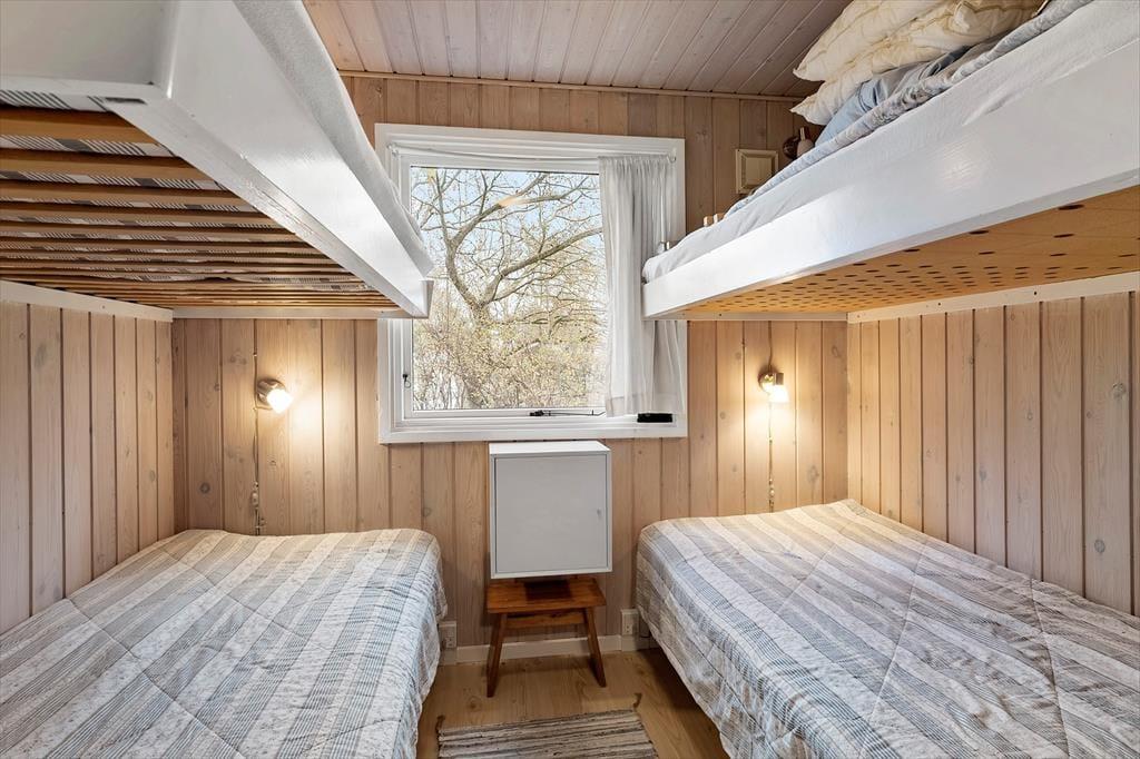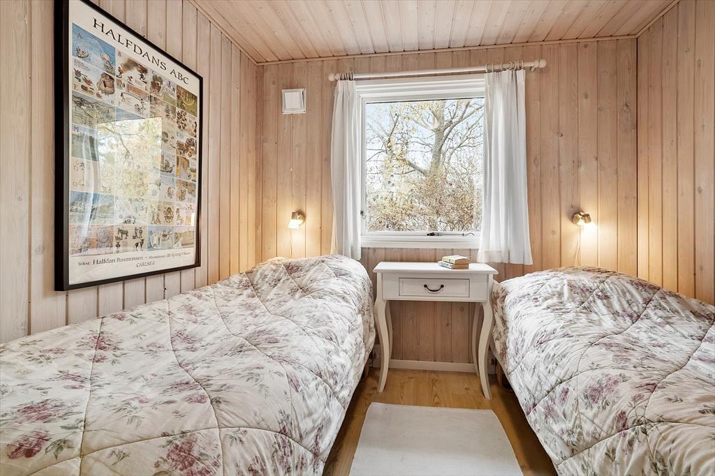 Velkommen indenfor: Indendørs finder du en rummelig indgang med god garderobeplads, der fører dig videre til badeværelset med brus, god skabsplads og vaskemaskine. Stuen er i kombination med et åbent køkken, der sammen med spisepladsen, er perfekt til fælles hygge. Huset har 3 komfortable soveværelser, det ene med dobbeltseng, et med 2 enkeltsenge og det sidste med 4 køjepladser. Sommerhusets indretning skaber en dejlig rolig og hyggelig atmosfære. Læs en spændende bog fra husets bogreol, nyd udsigten fra stuen ud mod haven og havet. Tænd gerne op i brændeovnen eller i pejsen på de køligere dage, og lad roen og sommerhusstemningen sænke sig.