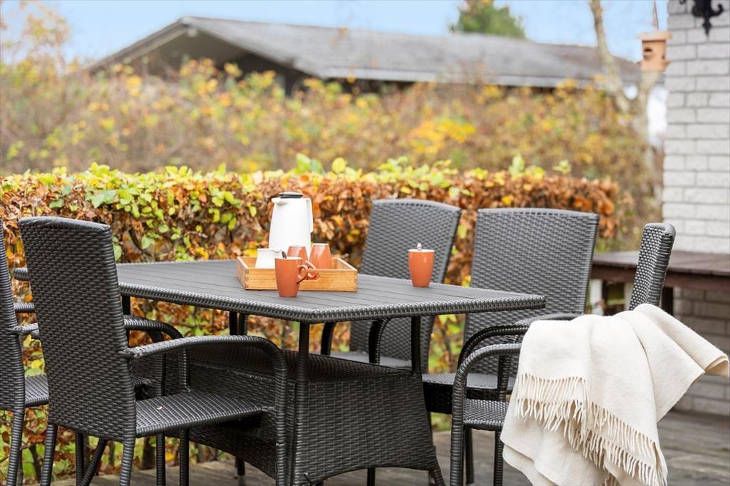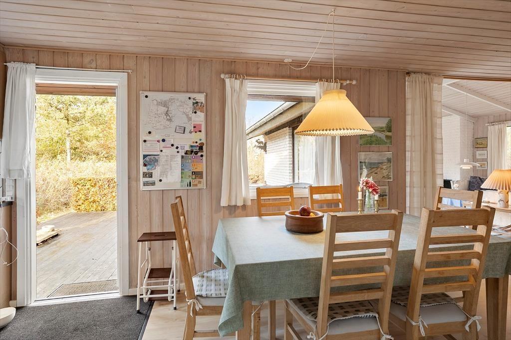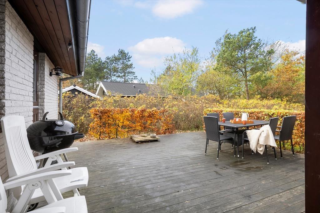Nyd livet udenfor: Huset er beliggende i rolige omgivelser for enden af vejen. Træd ud på det hyggelige terrasseområde fra udgangen i stuen og køkkenet. Her kan du nyde solen eller slappe af med en god kop kaffe. Desuden kan du nyde haven, hvor der er god plads til aktiviteter og om sommeren kan du smage hindbær fra havens buske. Tag en frisk dukkert ved stranden eller en dejlig strandtur med børnene. Om aftenen kan du tilberede en dejlig middag på grillen, og lade feriestemningen brede sig.