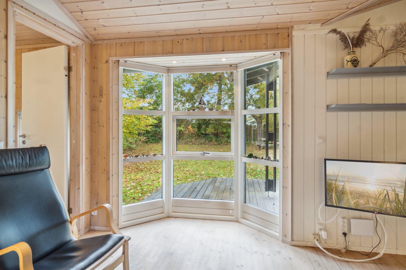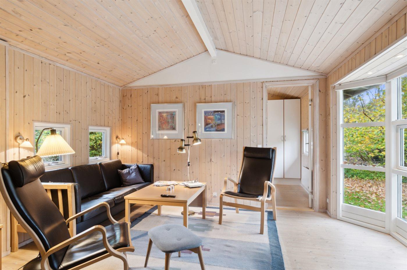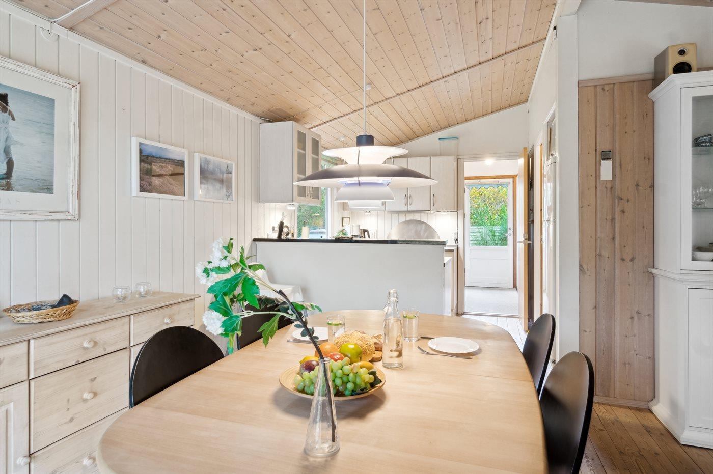 Det hyggelige køkkenalrum og stuen er ud i et, og herfra er der udgang til den sydvendte terrasse, hvor en del er overdækket. På modsatte side af huset er ligeledes en dejlig terrasse. Der er 3 soveværelser med hver 2 sovepladser samt et badeværelse med bruseniche og gulvvarme.
