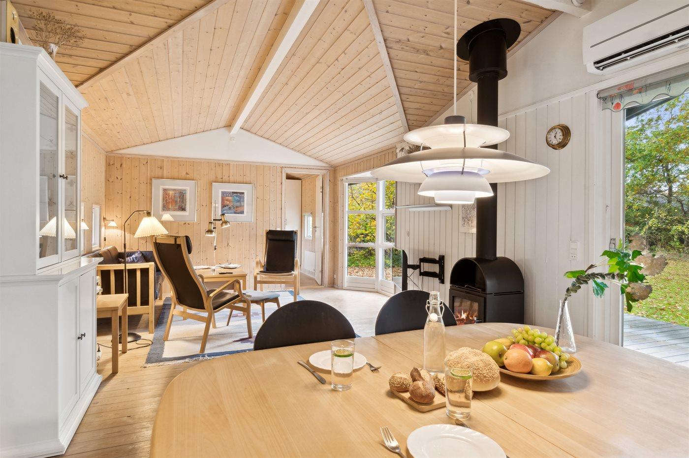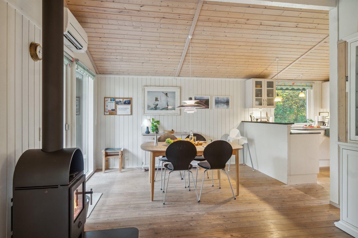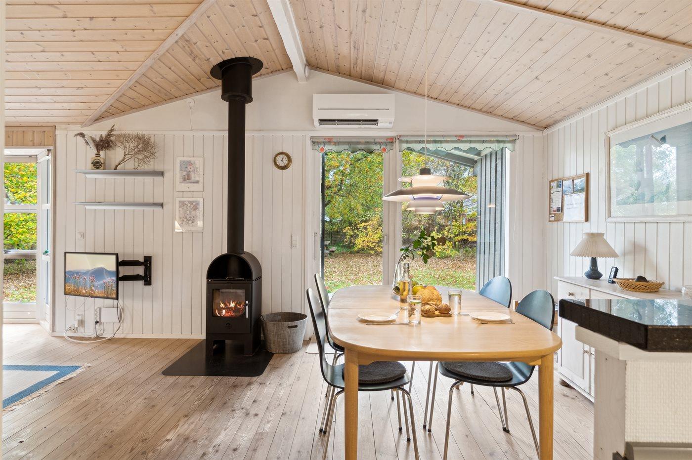 Huset opvarmes energivenligt med luft-til-luft varmepumpe, og der er brændeovn til de hyggelige stunder.