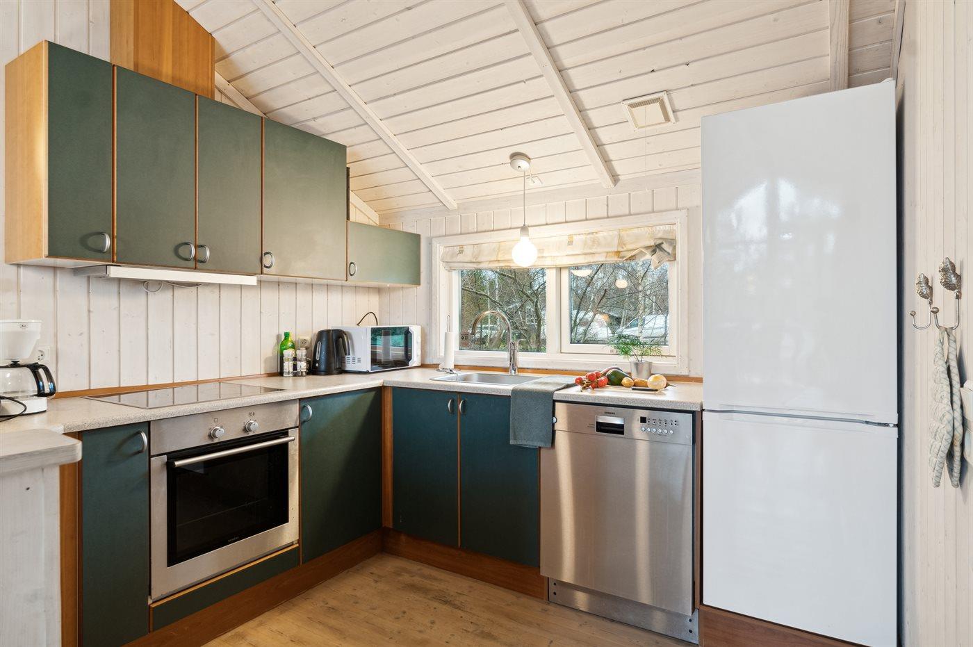 Køkkenet er udstyret med 1 køleskab. Der er 4 keramiske kogeplader, varmluftovn, mikrobølgeovn samt opvaskemaskine.