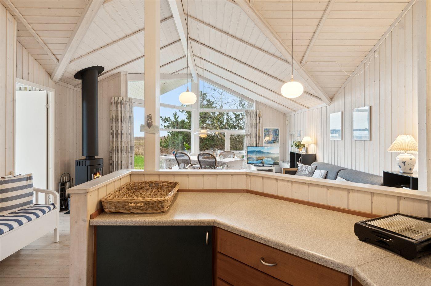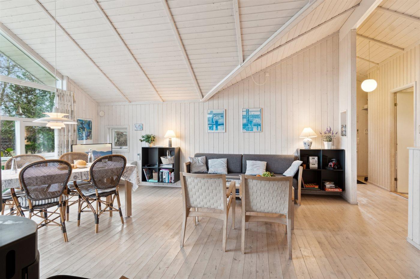 Det dejlige køkkenalrum i åben forbindelse med stuen og med udgang til den sydvendte træterrasse udgør det naturlige samlingssted for hygge og afslapning med venner og familie. Der er også en skøn træterrasse mod vest.