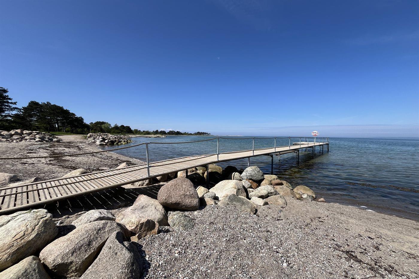 Fra huset er der kun 500 meter til nærmeste børnevenlige sandstrand. 600 meter fra huset er den fineste børnevenlige sandstrand med badebro.