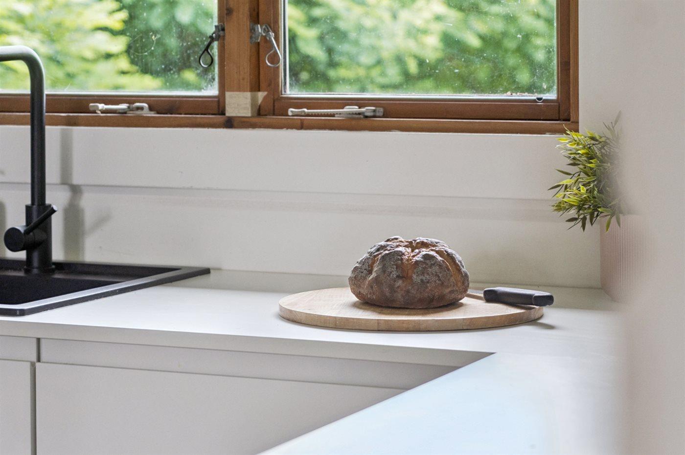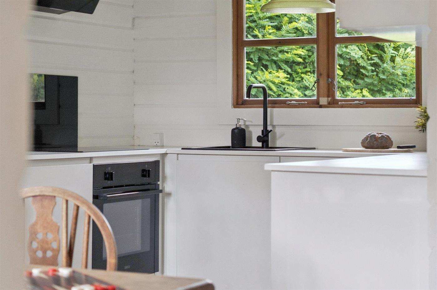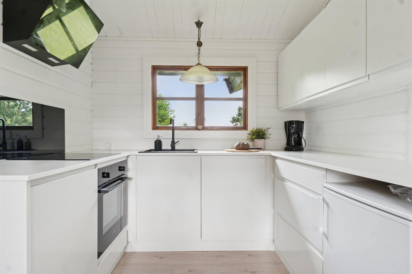 Køkkenet er udstyret med 1 køleskab. Der er 4 induktionskogeplader, varmluftovn samt opvaskemaskine.