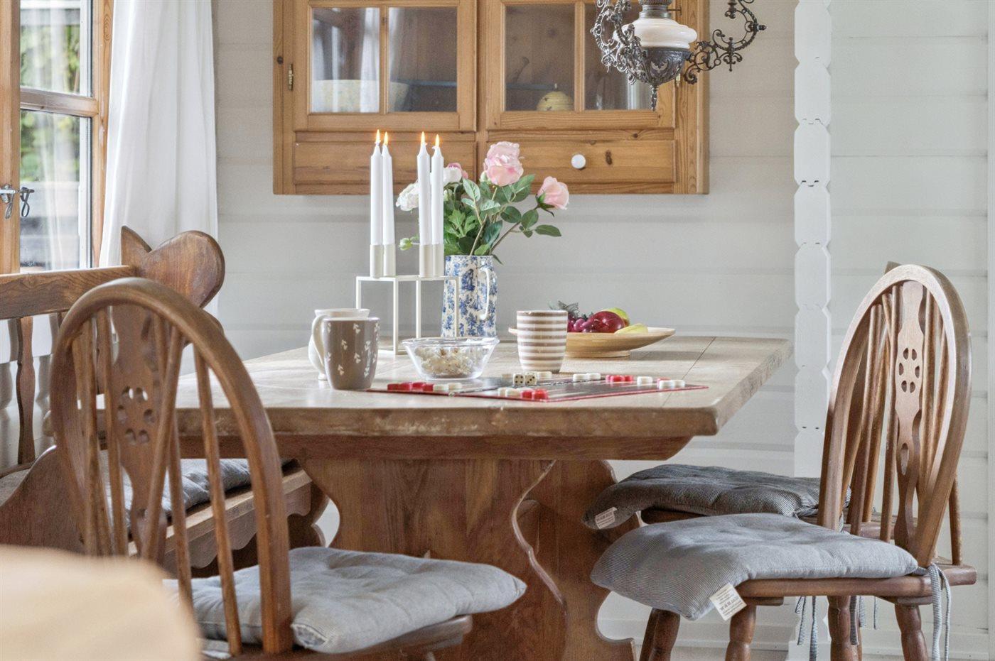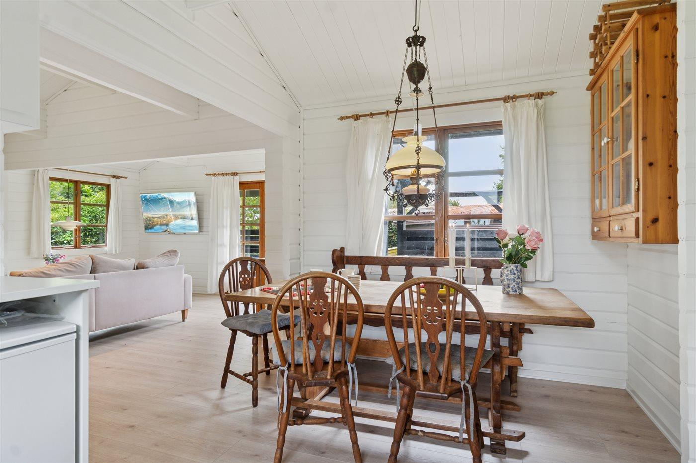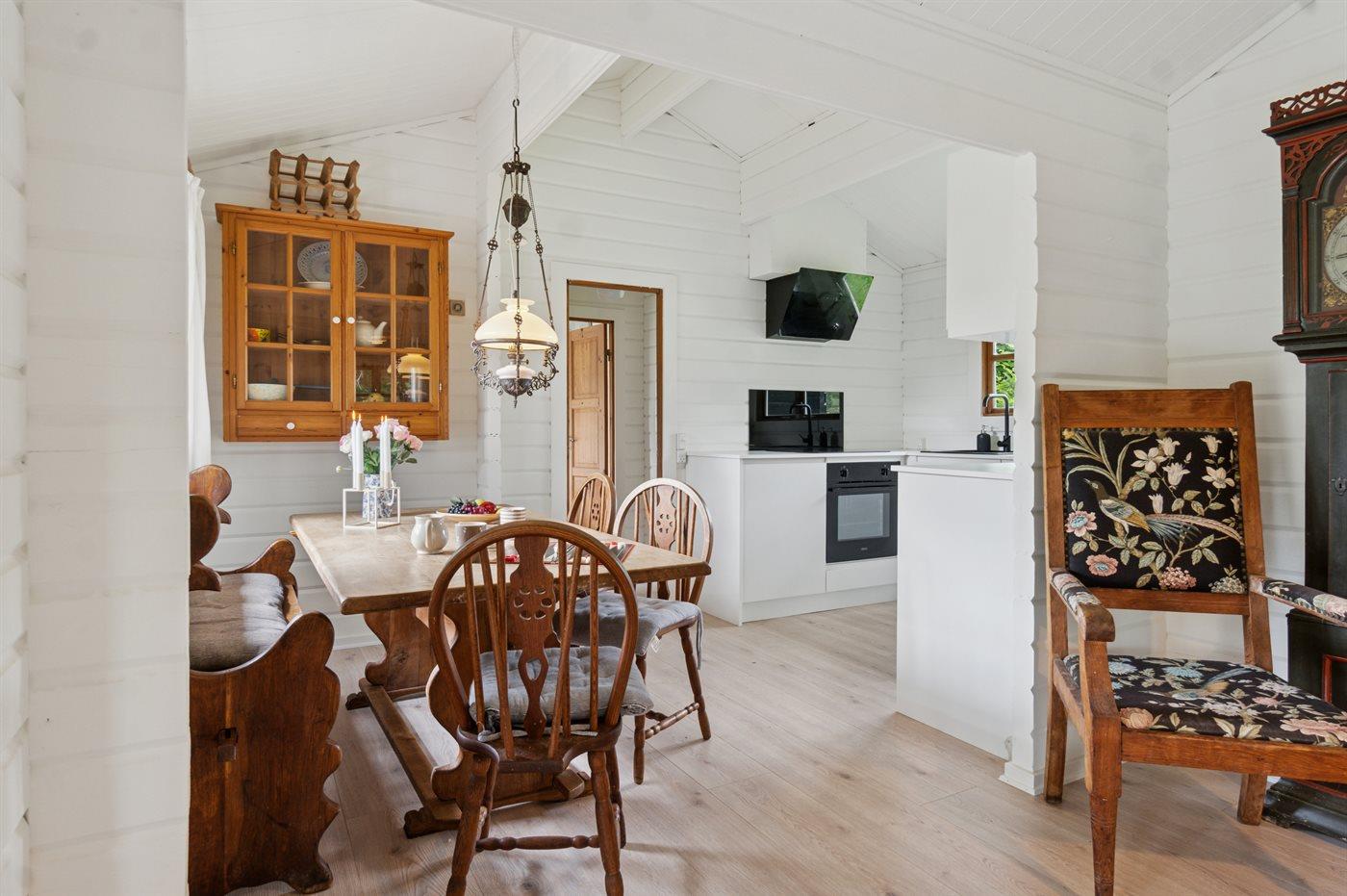 Sommerhusets hyggelige køkkenalrum med et nyt og moderne køkken er i åben forbindelse med stuen, og herfra er der udgang til den sydvendte terrasse, hvor en del er overdækket.