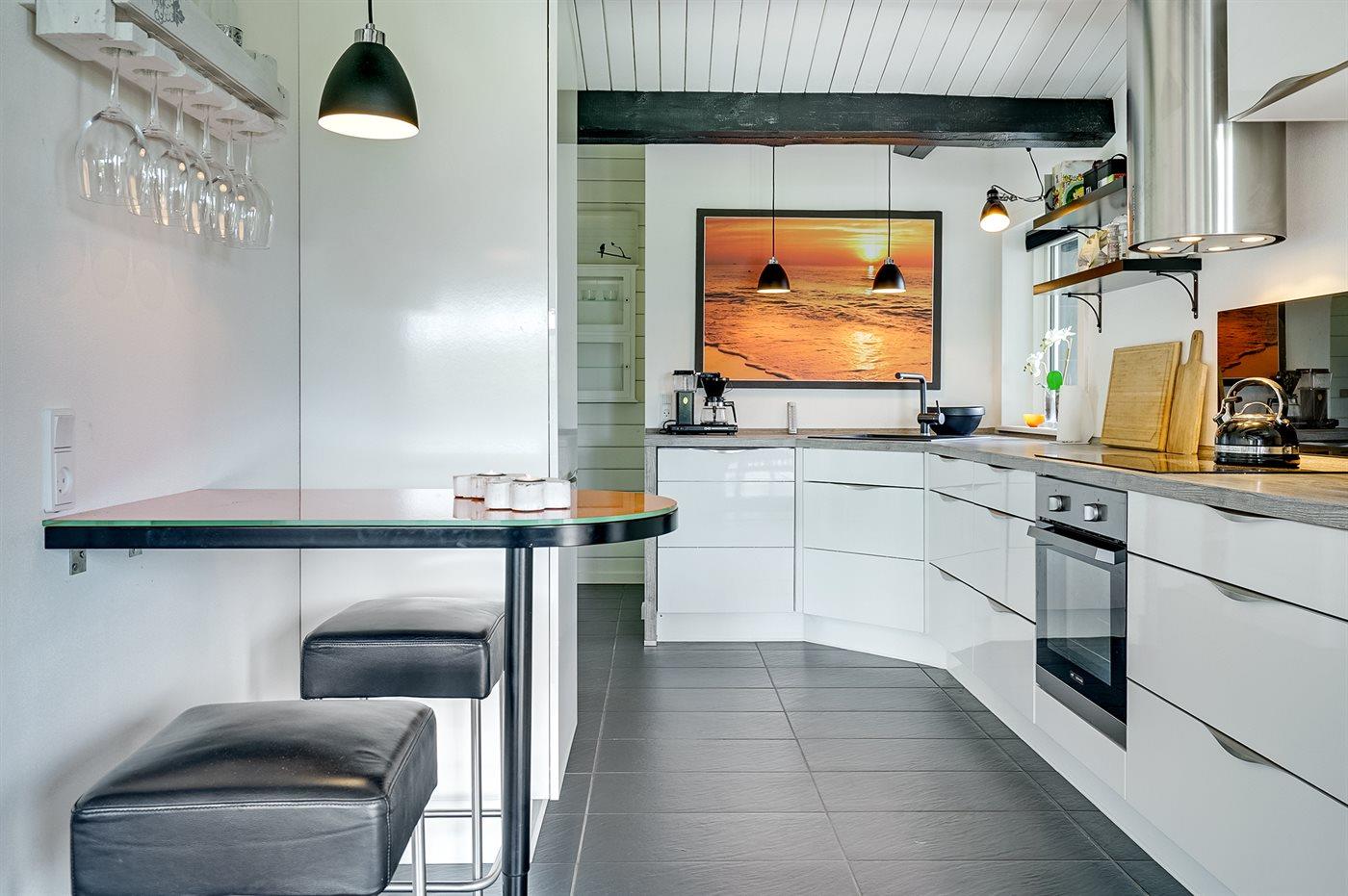 Køkkenet er udstyret med 1 køleskab. Der er 4 keramiske kogeplader, varmluftovn, mikrobølgeovn samt opvaskemaskine Der er gulvvarme i køkkenet.
