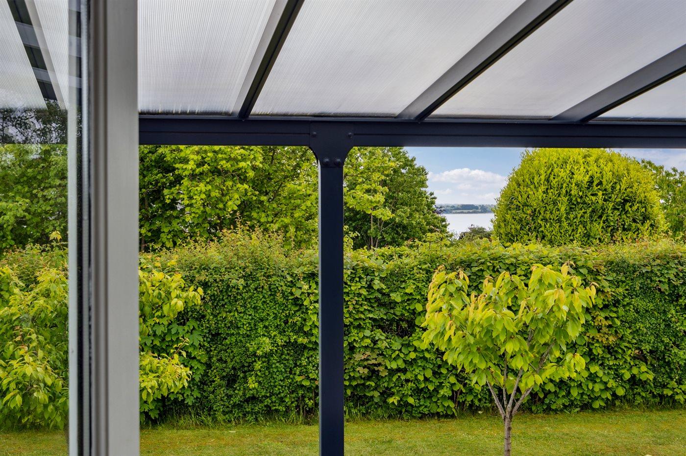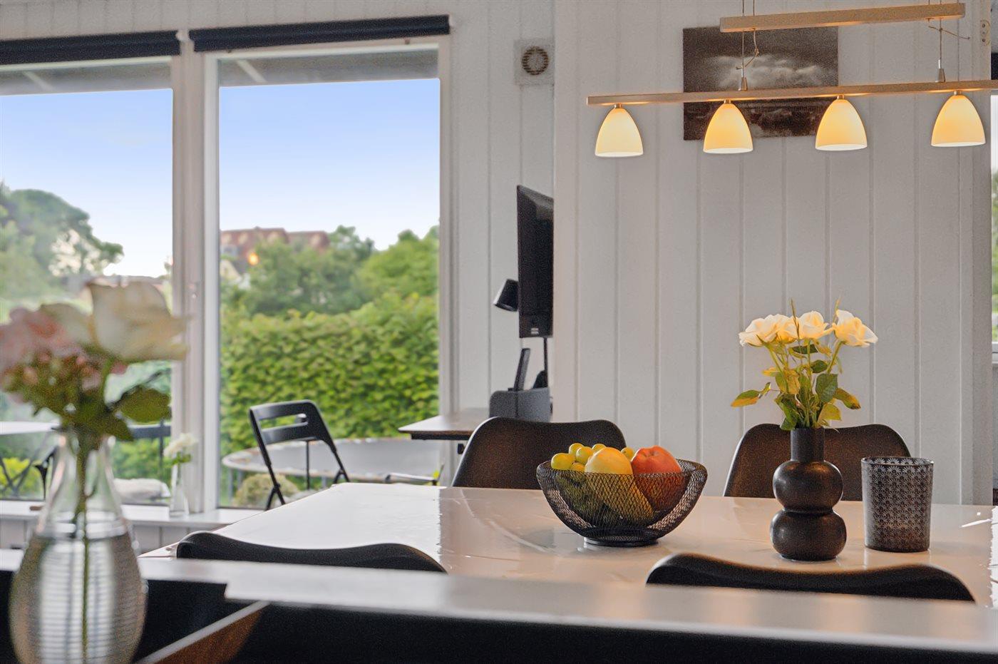 De store vinduespartier giver en storslået udsigt over det omkringliggende landskab og fjorden i baggrunden