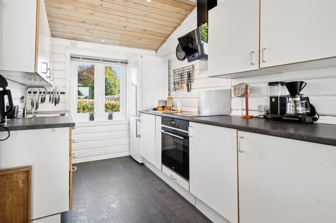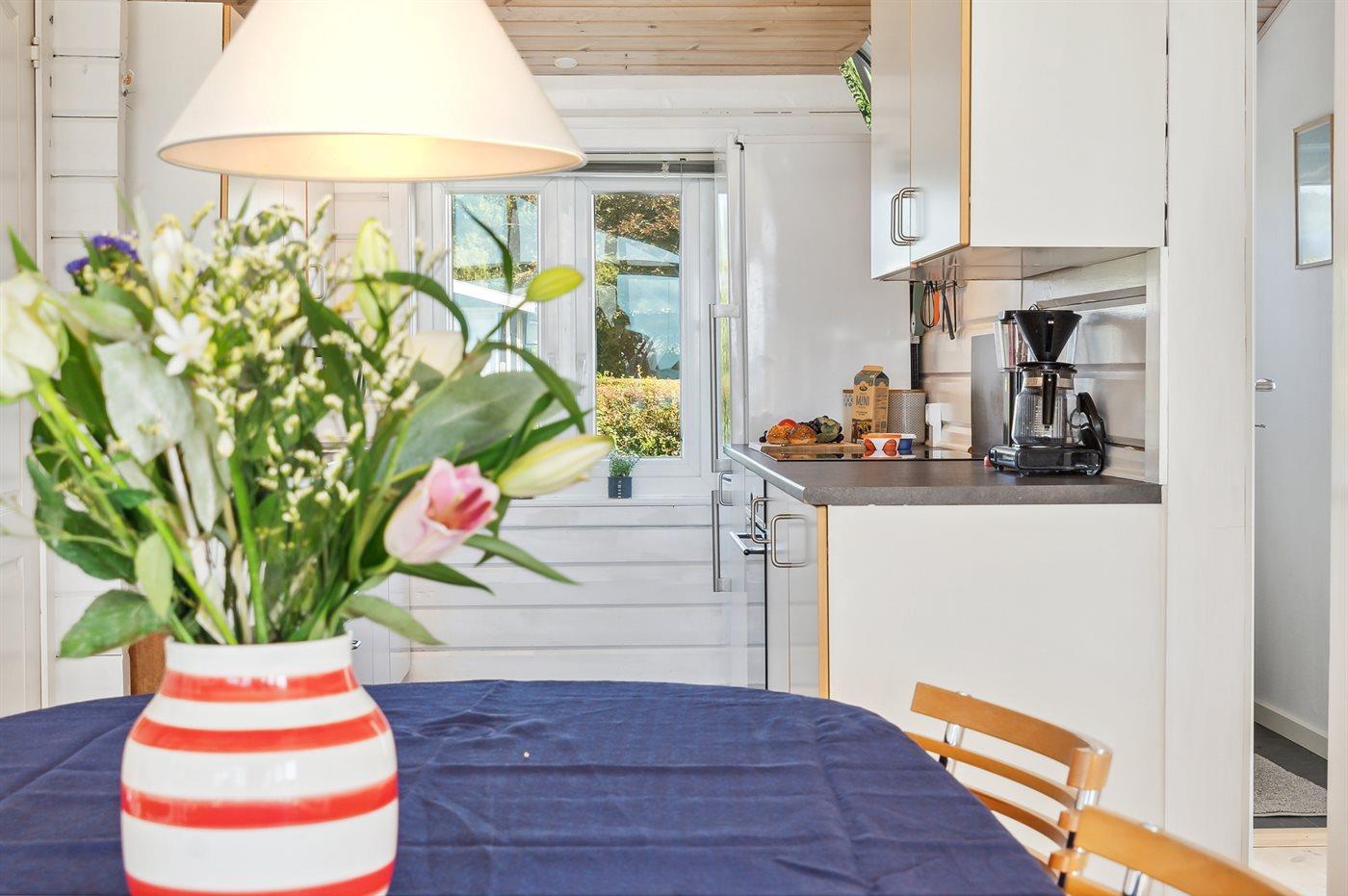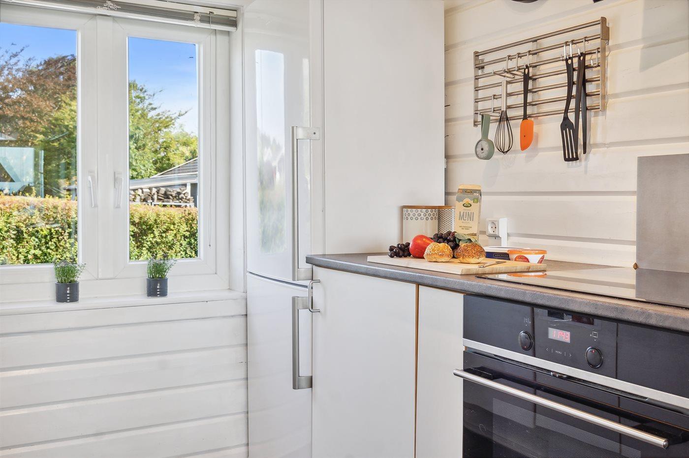 Køkkenet er udstyret med 1 køleskab. Der er 4 keramiske kogeplader, varmluftovn, mikrobølgeovn samt opvaskemaskine.