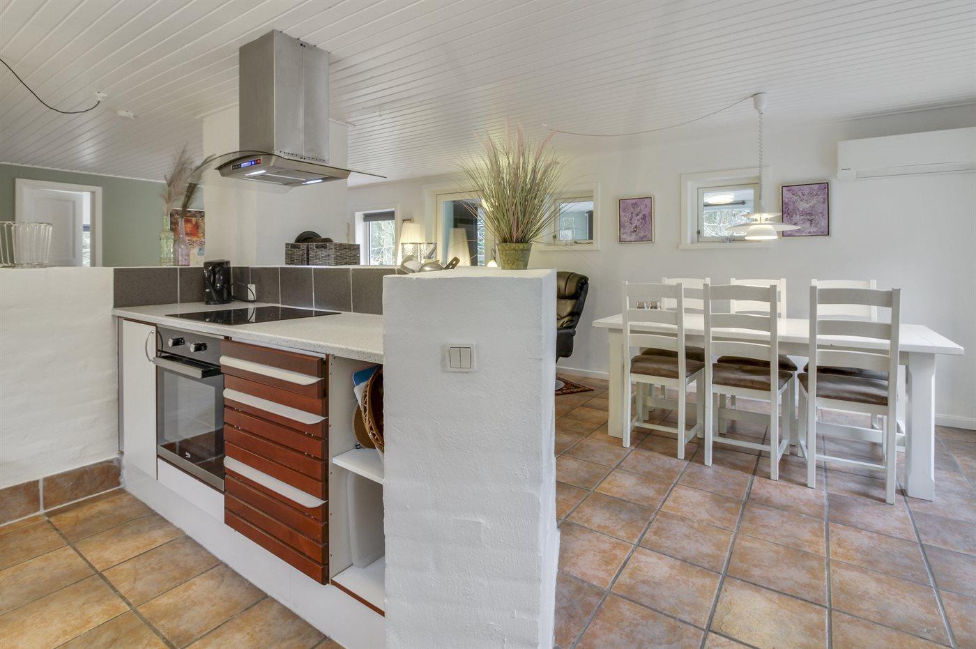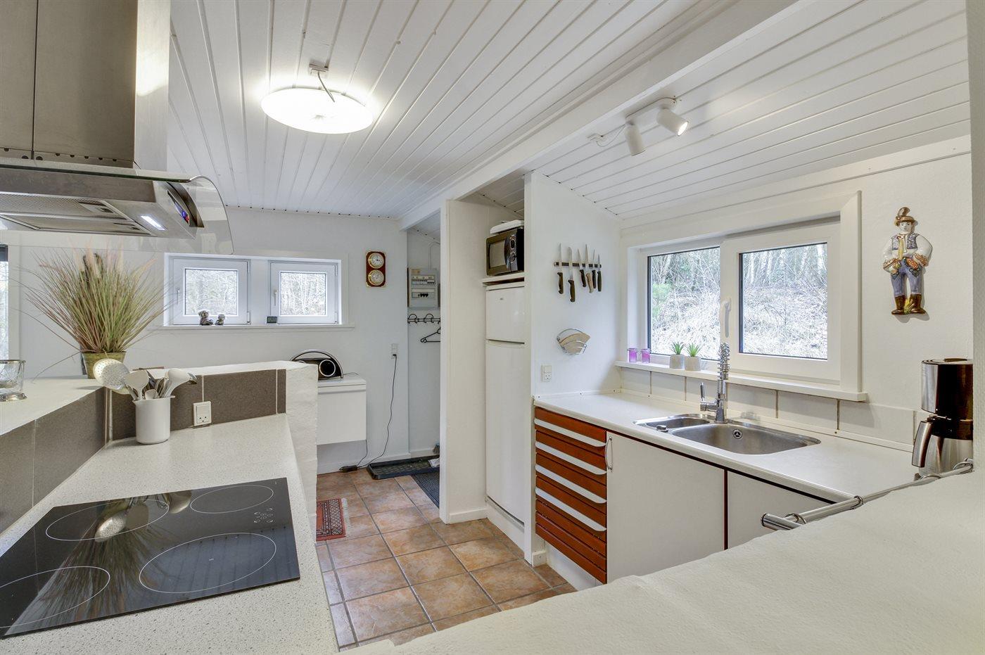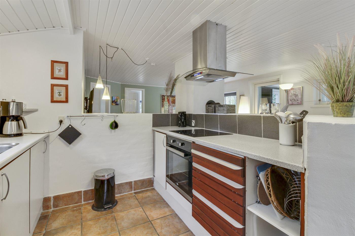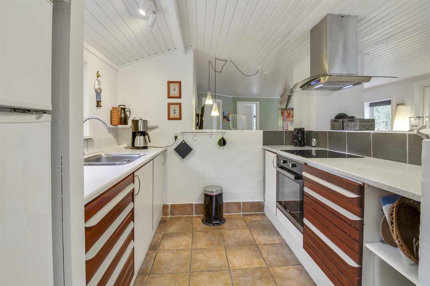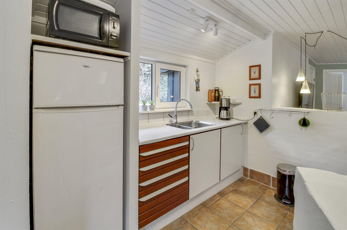 Køkkenet er udstyret med 1 køleskab. Der er 4 keramiske kogeplader, varmluftovn, mikrobølgeovn.
