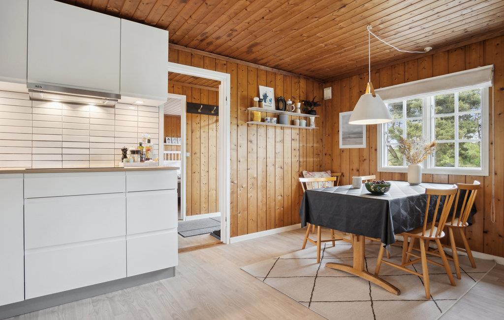 Dejlig stue i åben forbindelse med køkkenet og spisepladsen. Hyggelig indretning med masser af naturligt træ, dejlig brændeovn og forskellige stemningsfulde detaljer. Her findes desuden to gode soveværelser med plads til i alt fire personer samt et pænt badeværelse med gulvvarme. I huset er installeret en energivenlig varmepumpe som alternativ varmekilde.