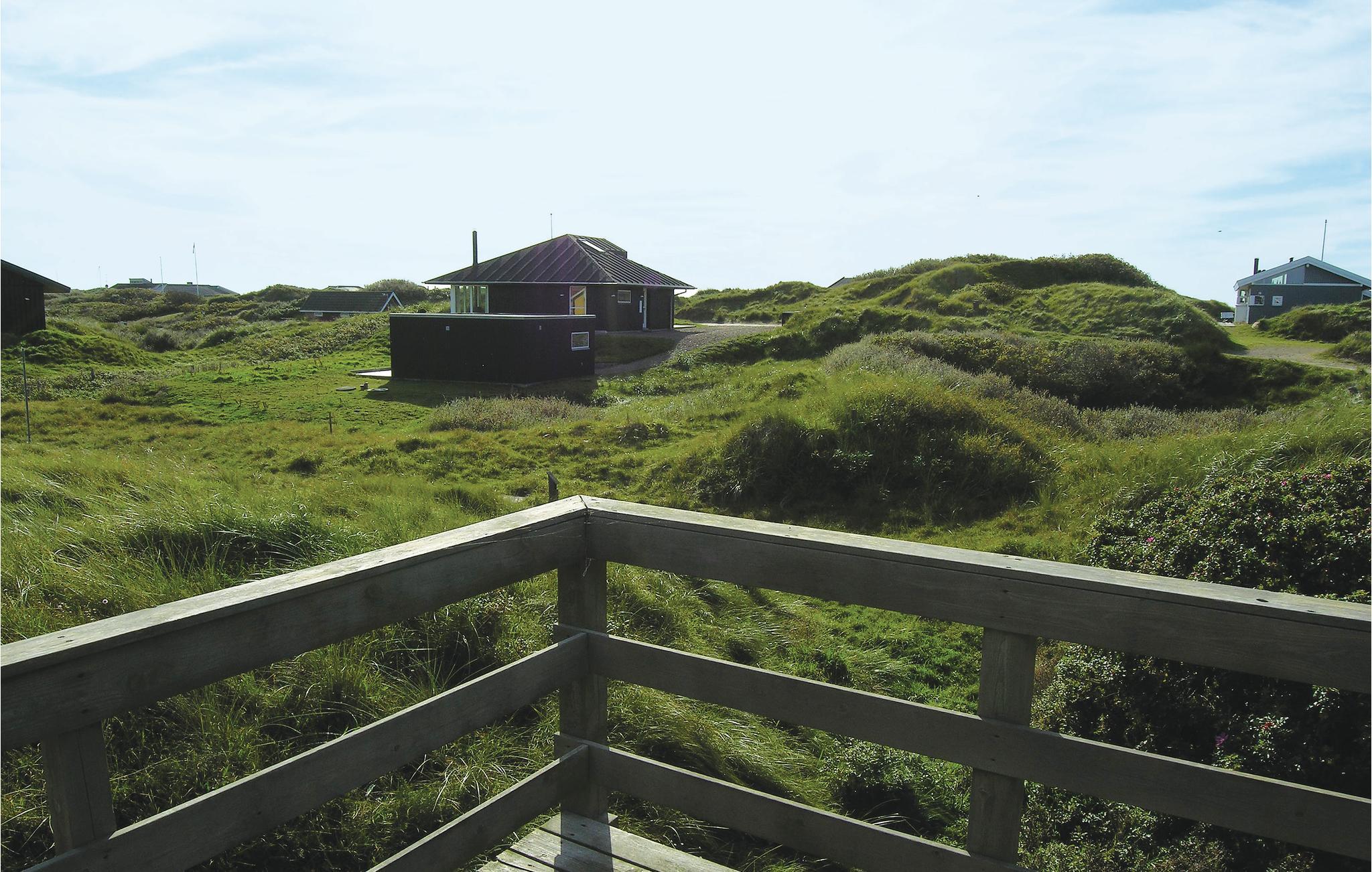 Flot og moderne feriehus i Rindby med terrasse og udsigt over klitlandskab.