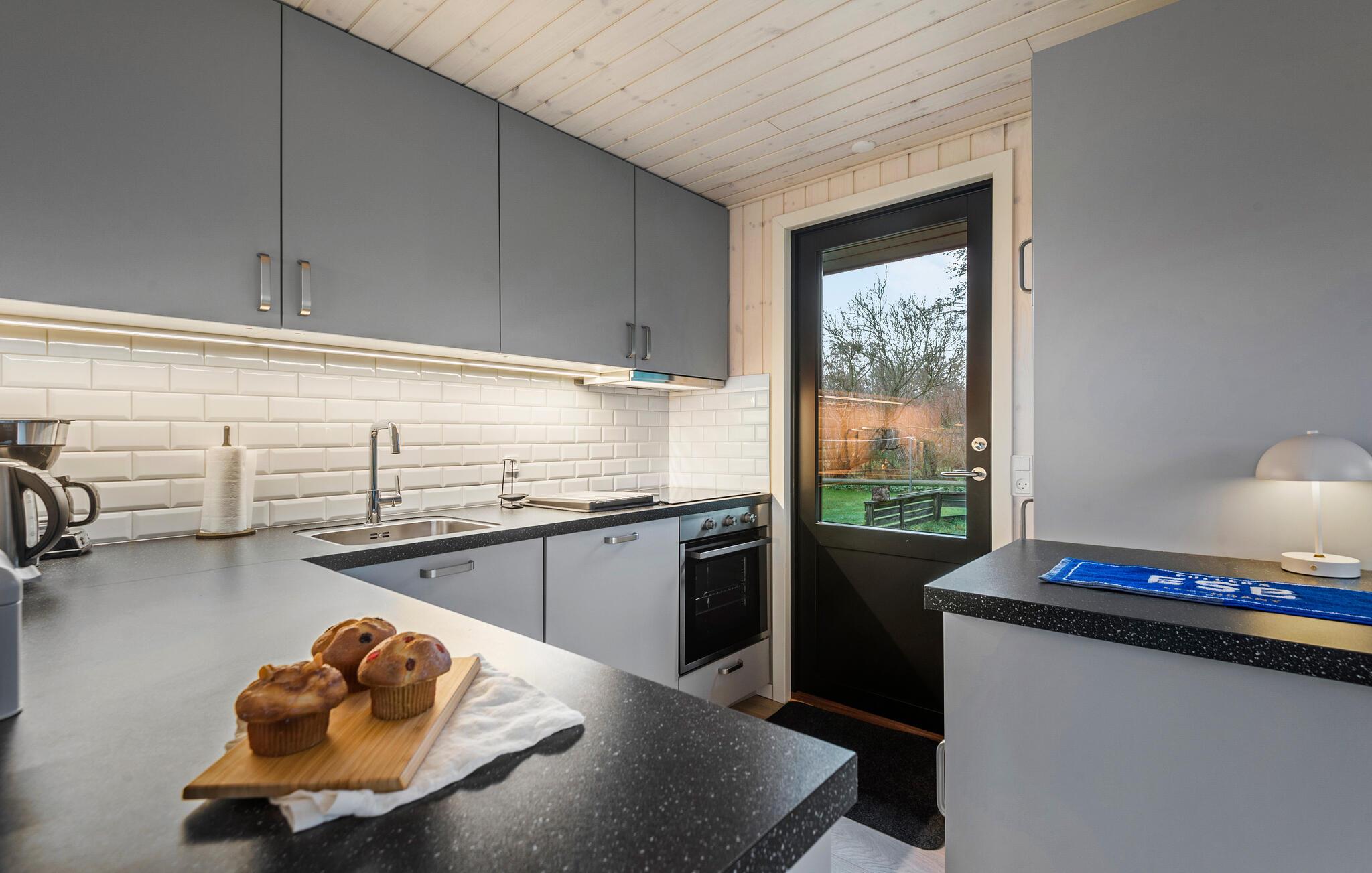 Perfekt for familier eller hundeejere, der gerne vil have plads til at boltre sig på og være tæt på naturen. Huset ligger for enden af en blind vej, så der kommer ingen biler kørende forbi, og den store græsplæne omkring huset er afgrænset af randbeplantning. Det skaber et hyggeligt og privat rum, som kun brydes af rådyrene, der af og til kommer forbi og nyder den rolige atmosfære. Den store grund har desuden legeredskaber samt en adskilt frugthave med en bænk. Yderligere bænke rundt om huset giver rig mulighed for at finde læ og sol i bl.a. husets solgård og på terrassen. To udestuer, der indfanger henholdsvis morgen- og eftermiddagssolen, forlænger desuden sæsonen i dette hus.