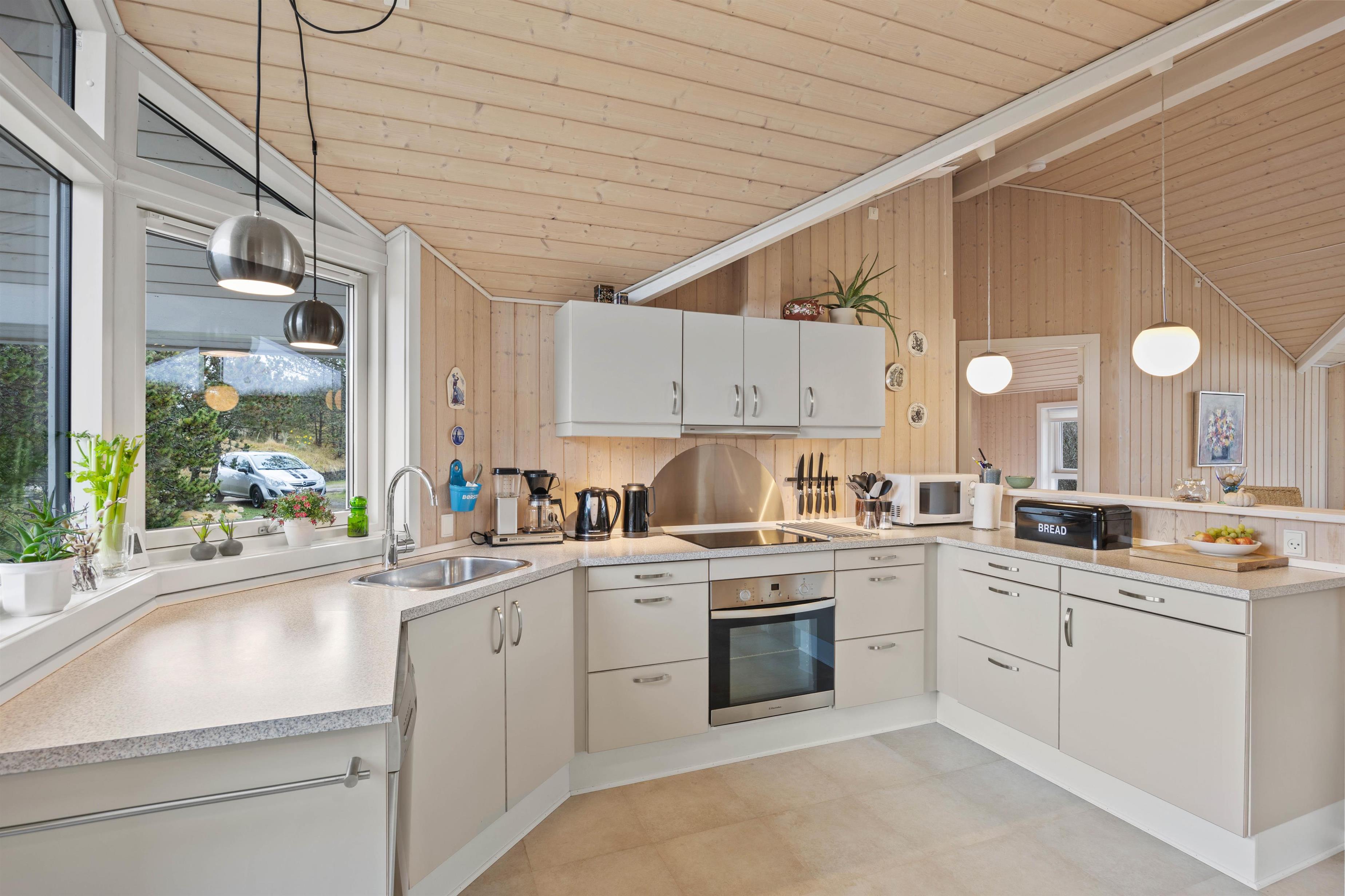 Det åbne opholdsrum med køkken og spiseplads indbyder til samvær, hvor den lyse og lette indretning fuldender ferieatmosfæren. Det veludstyrede køkken med opvaskemaskine og induktionskomfur gør madlavningen til en leg. Måske I kunne starte dagen med duften af friskbrygget kaffe og friskbagte kanelsnegle?