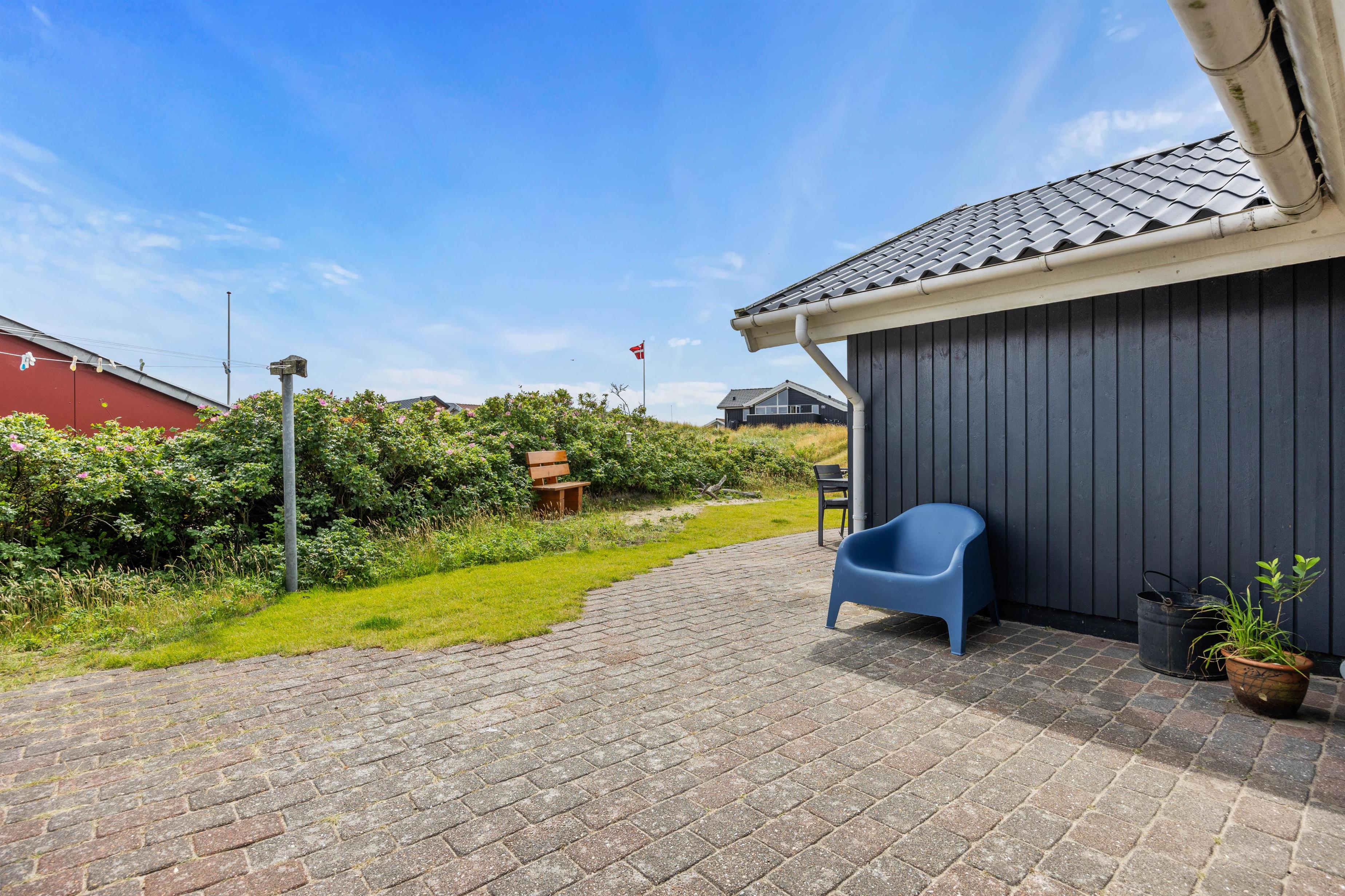Udendørs venter en dejlig åben terrasse og et grønt område, hvor I kan nyde solen hele dagen. Måske kigger en fasan forbi, mens I slapper af i havemøblerne eller tilbereder aftensmaden på grillen. Det er oplagt at afslutte dagen med et glas vin under åben himmel og nyde roen.