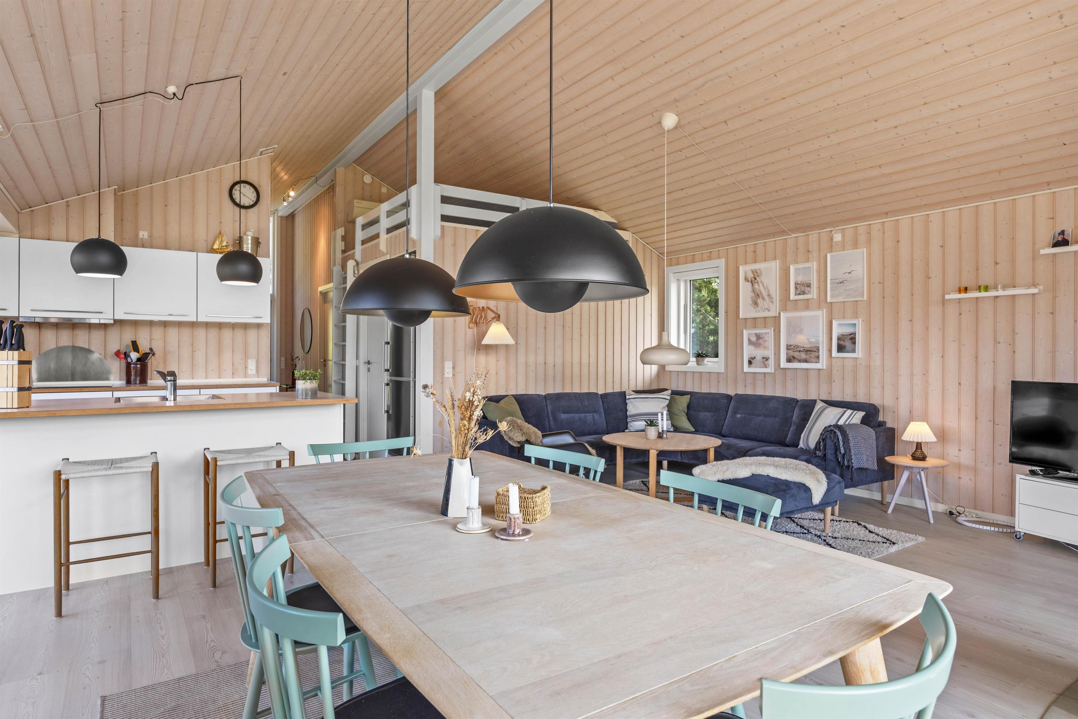 Her er der god plads til hele familien, og I kan nyde mange gode stunder sammen – uanset om I alle skal slappe af i sofaen, eller mens andre laver dejlig mad i det veludstyrede køkken. Mulighederne er mange. Som prikket over i´et sørger brændeovnen for den rette feriestemning på de køligere aftner, og med husets varmepumpe er I sikret et komfortabelt indeklima året rundt.