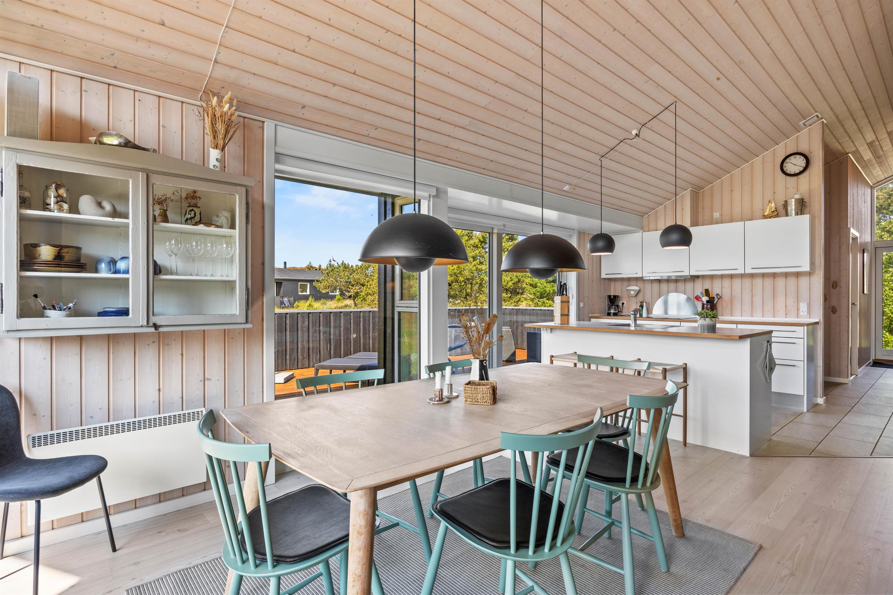Sommerhuset på Klittoften 5 er hyggeligt indrettet, her er højt til loftet og store vinduespartier, som inviterer dagslyset indenfor i stuen. Stue og køkken er i åben forbindelse og fungerer som feriehusets hjerte.