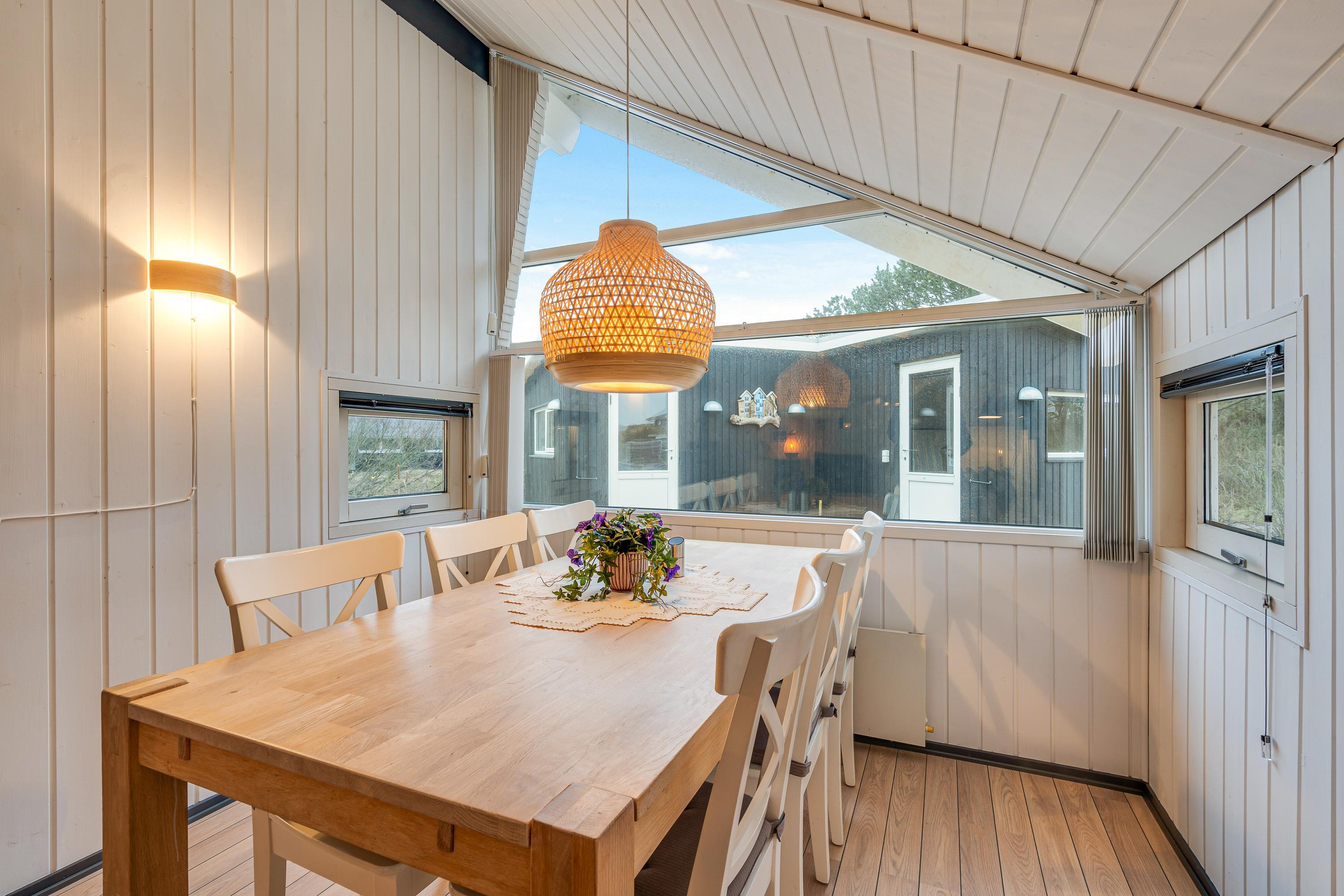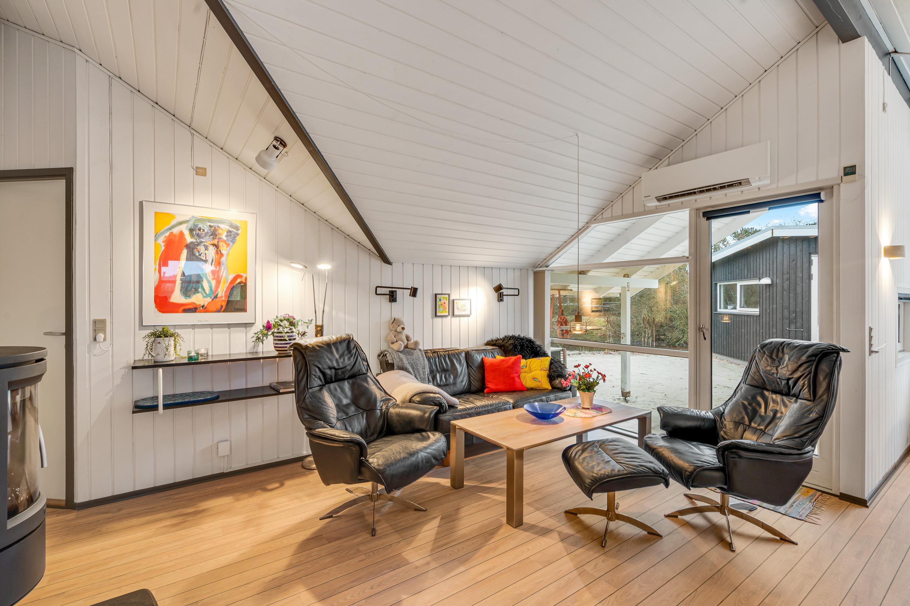 Hjertet af feriehuset er det veludnyttede køkken-alrum, hvor familien samlet kan tilbringe mange hyggelige timer sammen. Her kan familiens kok tilberede lækre måltider, mens resten af familien spiller et spil ved spisebordet eller hygger i den komfortable sofa med brændeovnens knitren i baggrunden.