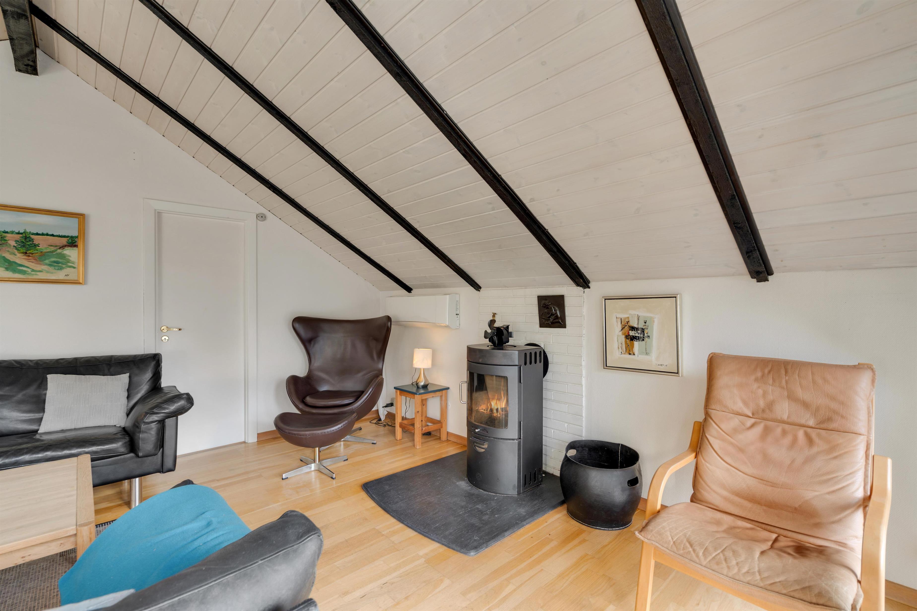 I stuen kan der hygges med en bog eller et brætspil foran den knitrende brændeovn eller med en god film på tv’et. En varmepumpe sørger for energivenlig varme.