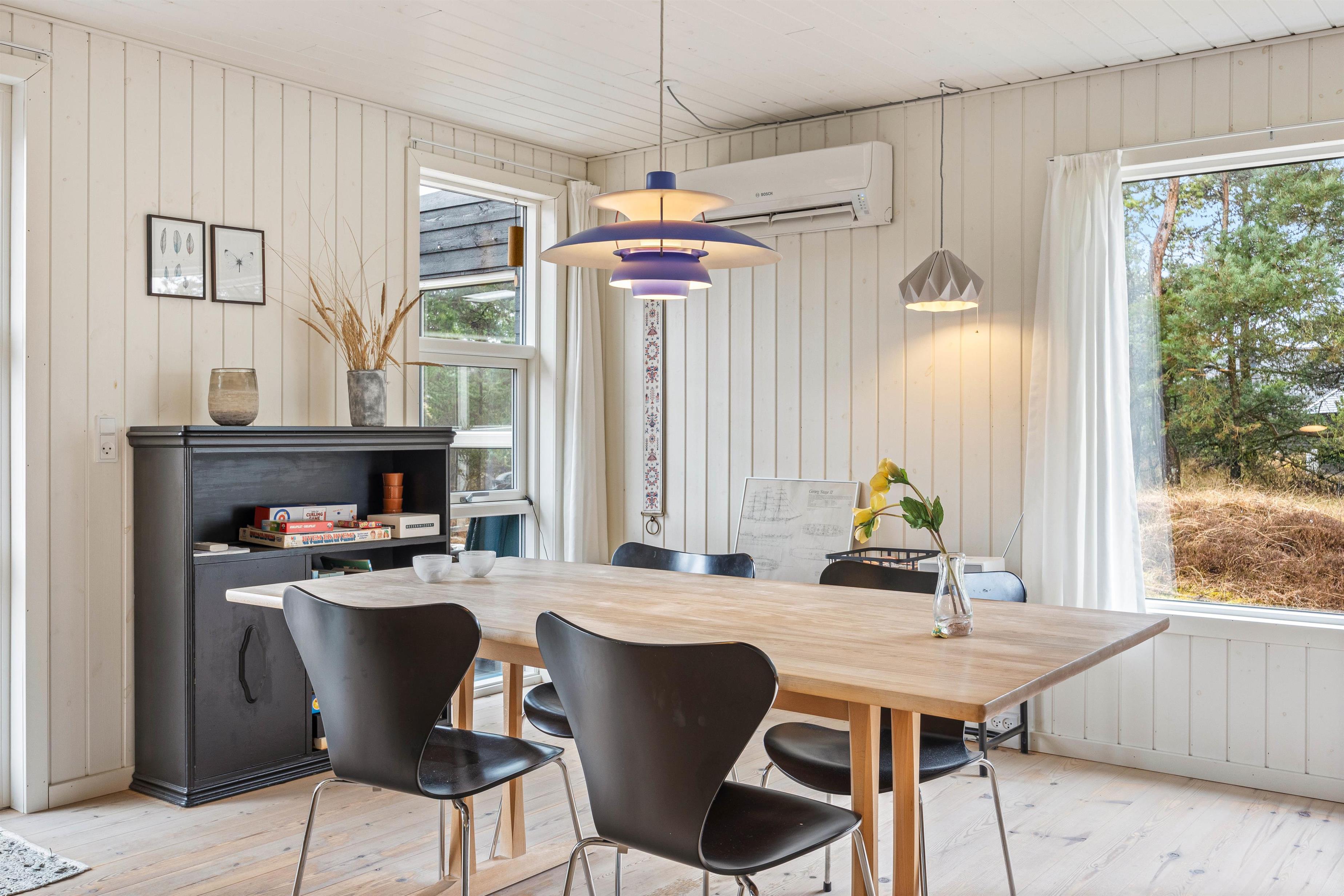 I køkken og alrum er der rig mulighed for at slappe af i den enkleog indbydende indretning, der ligger op til masser af hyggeligt samvær, hvad enten I nu vil slænge i sofaen med en god bog eller i hjørnet med de behagelige hvilestole. Man kan også bare være en del af samværet ved at spille brætspil omkring spisebordet.