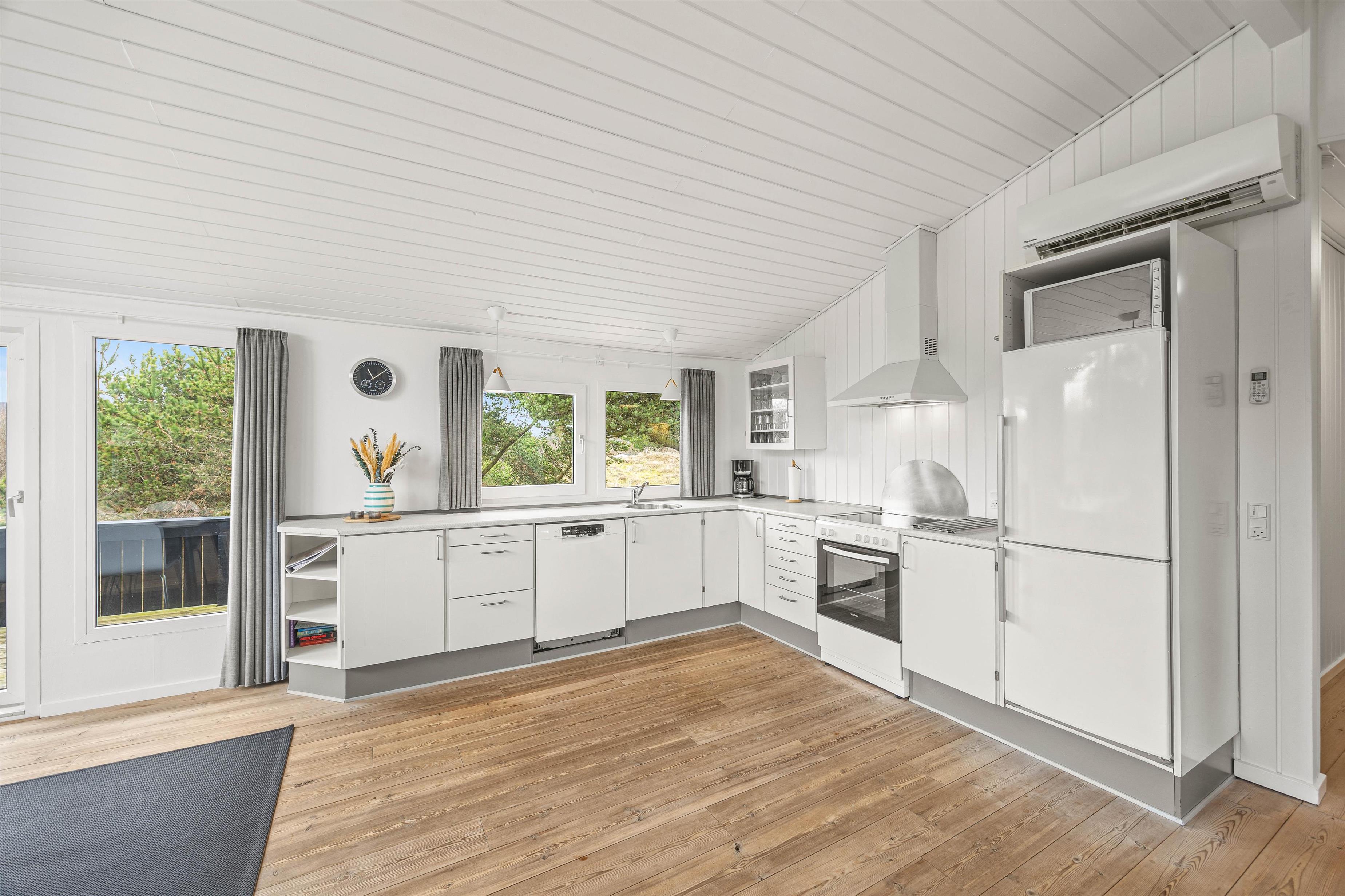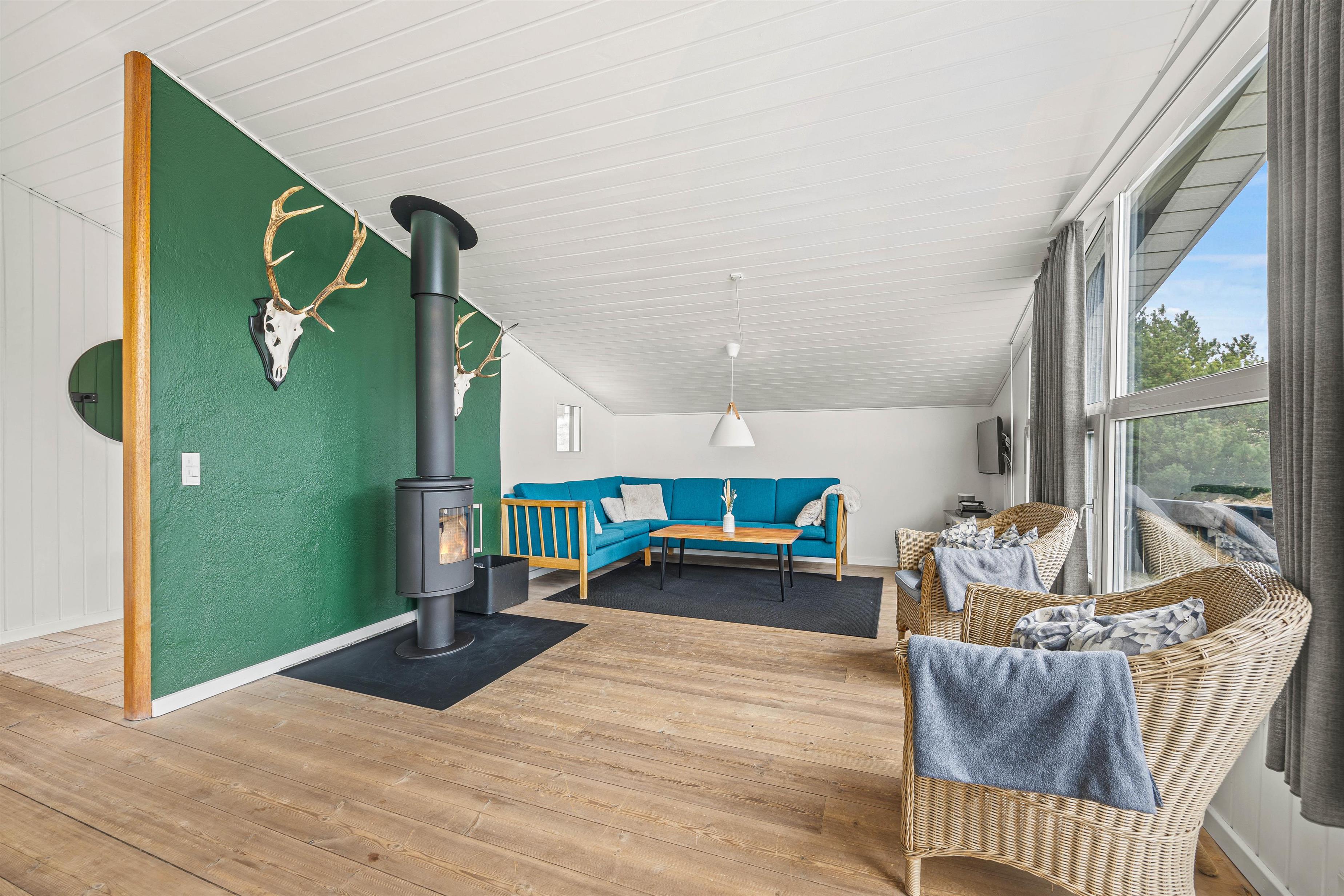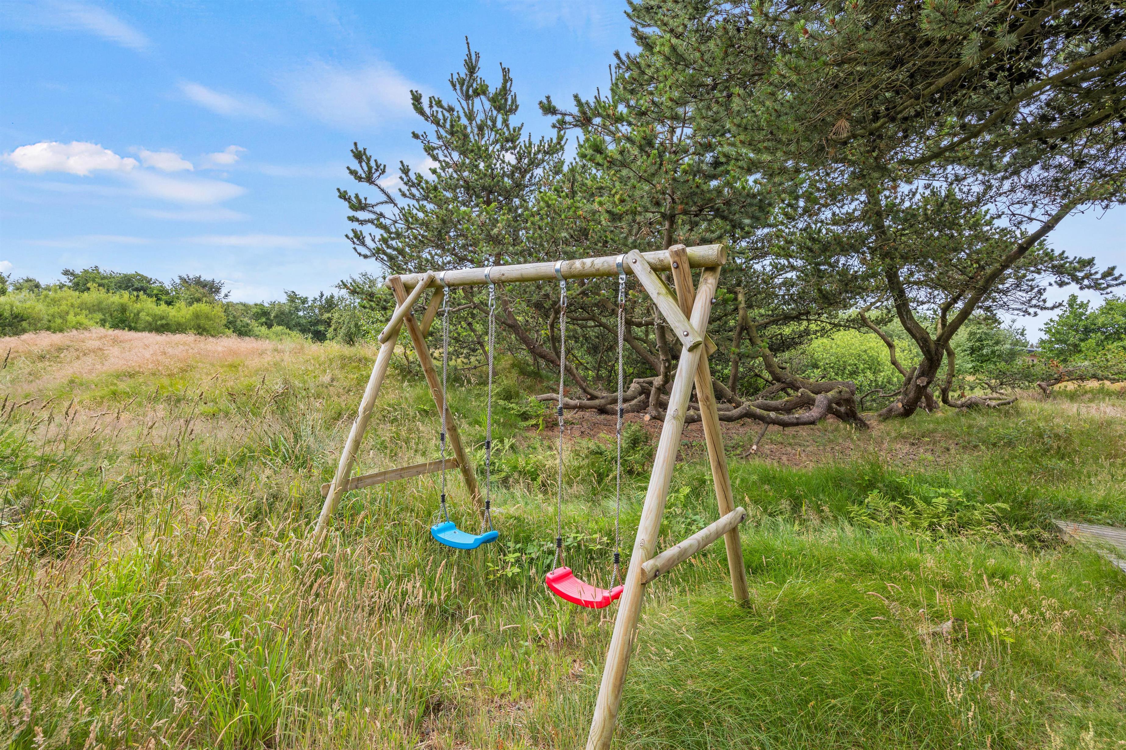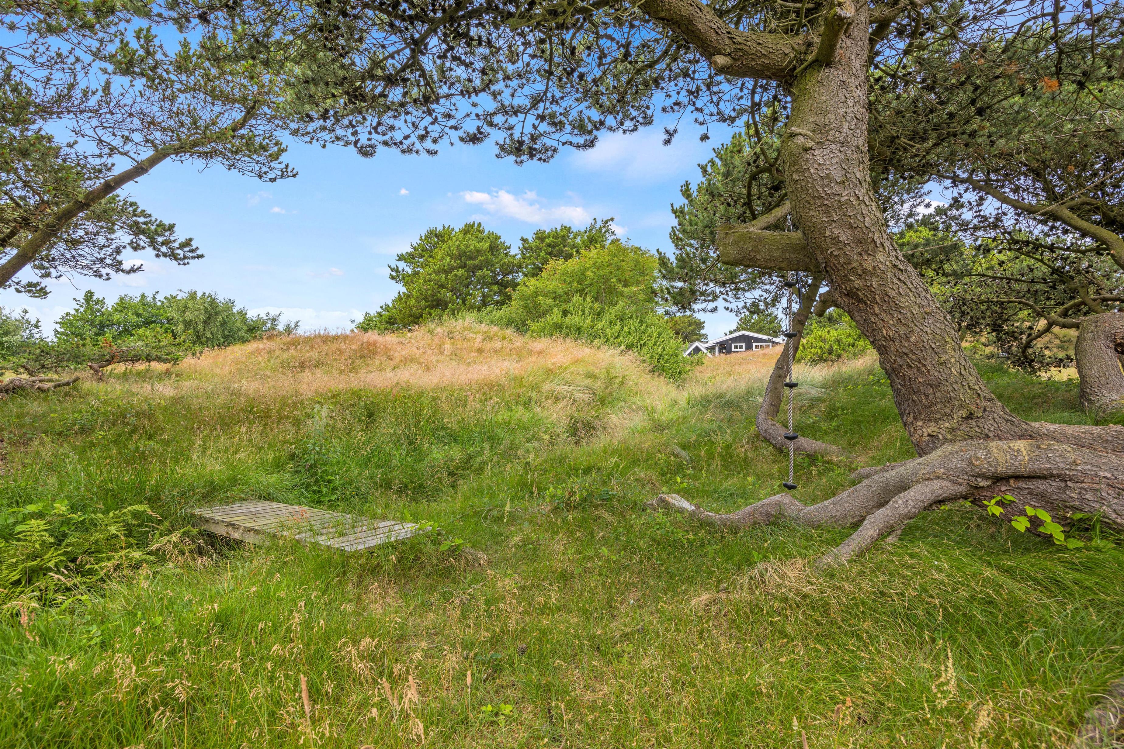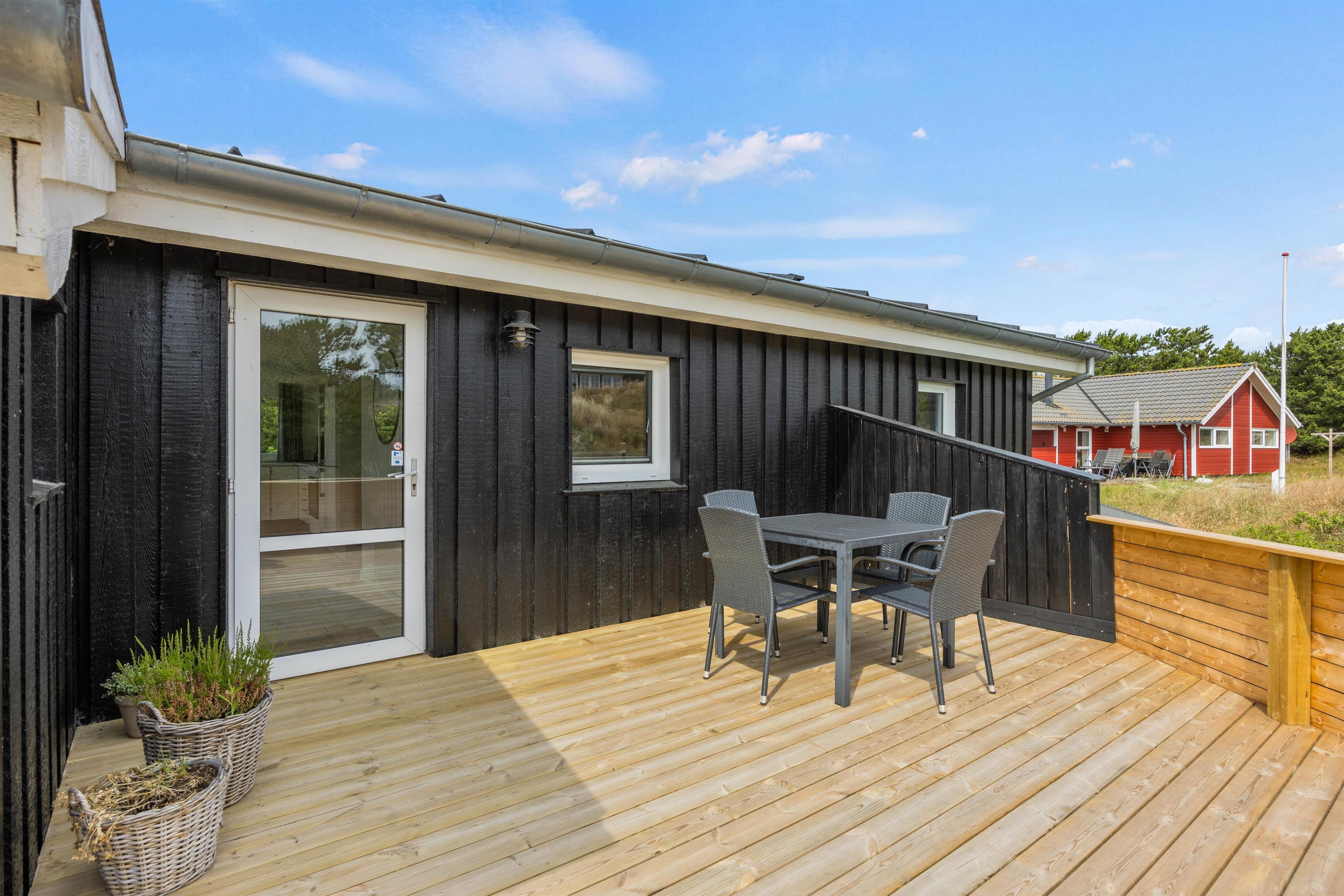 Den åbne terrasse, der går omkring feriehuset, giver mulighed for at opholde sig udendørs i al slags vejr. Her vil altid være en krog med læ, hvor man kan trække sig tilbage med en kop te. Tag solbad i liggestolene eller træk jer tilbage i havemøblerne med en kølig drink. Til børnene er der gyngestativ og sandkasse, og så har de også rig lejlighed til at gå på opdagelse på naturgrunden. Tænd op i grillen til aften og nyd et lækkert grillmåltid sammen, imens skyggerne bliver lange. Har I energi og lyst, kan I nå en dejlig vandretur på under 1 km til Vesterhavsstranden. En solnedgang ved Vesterhavet bliver man aldrig træt af.