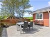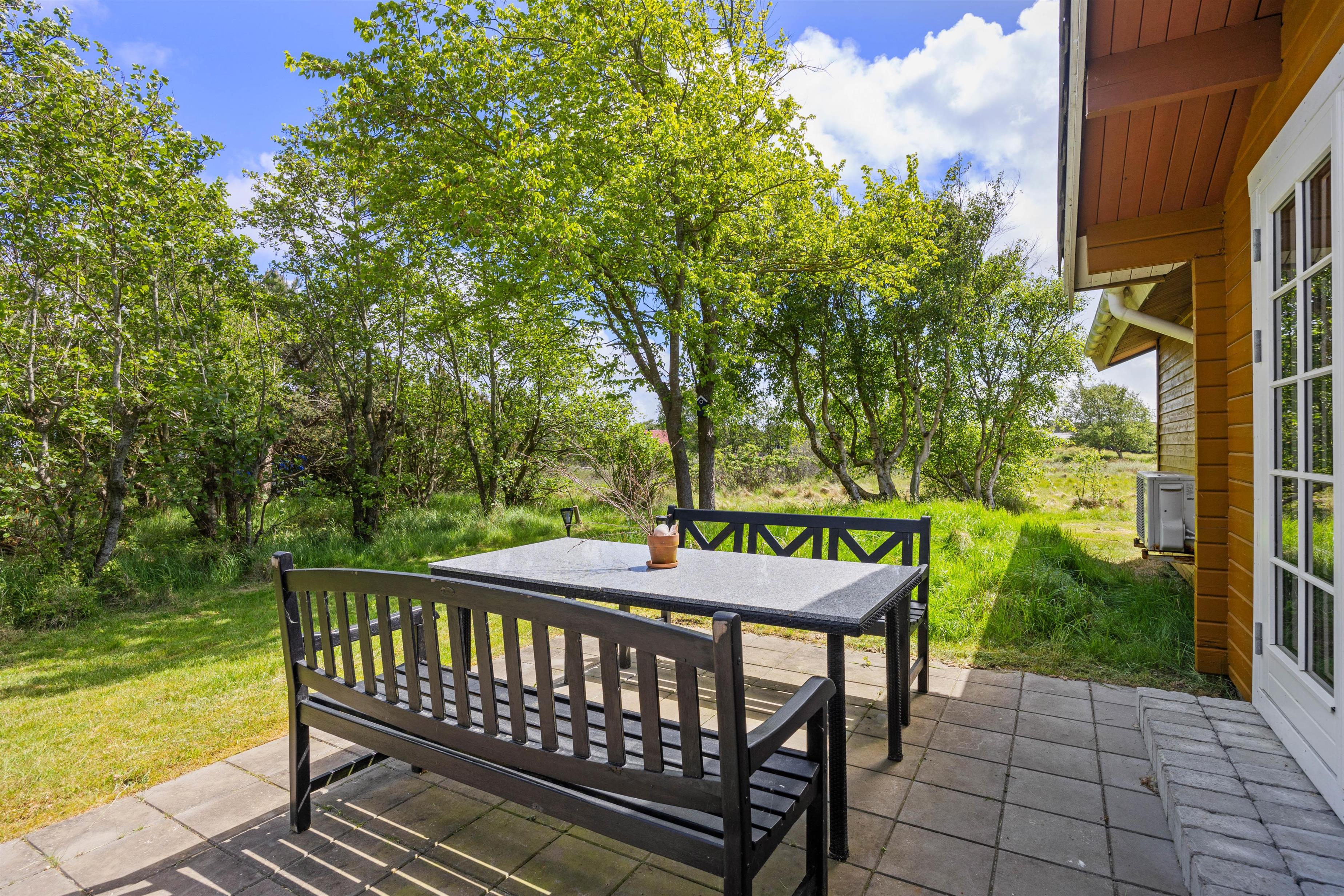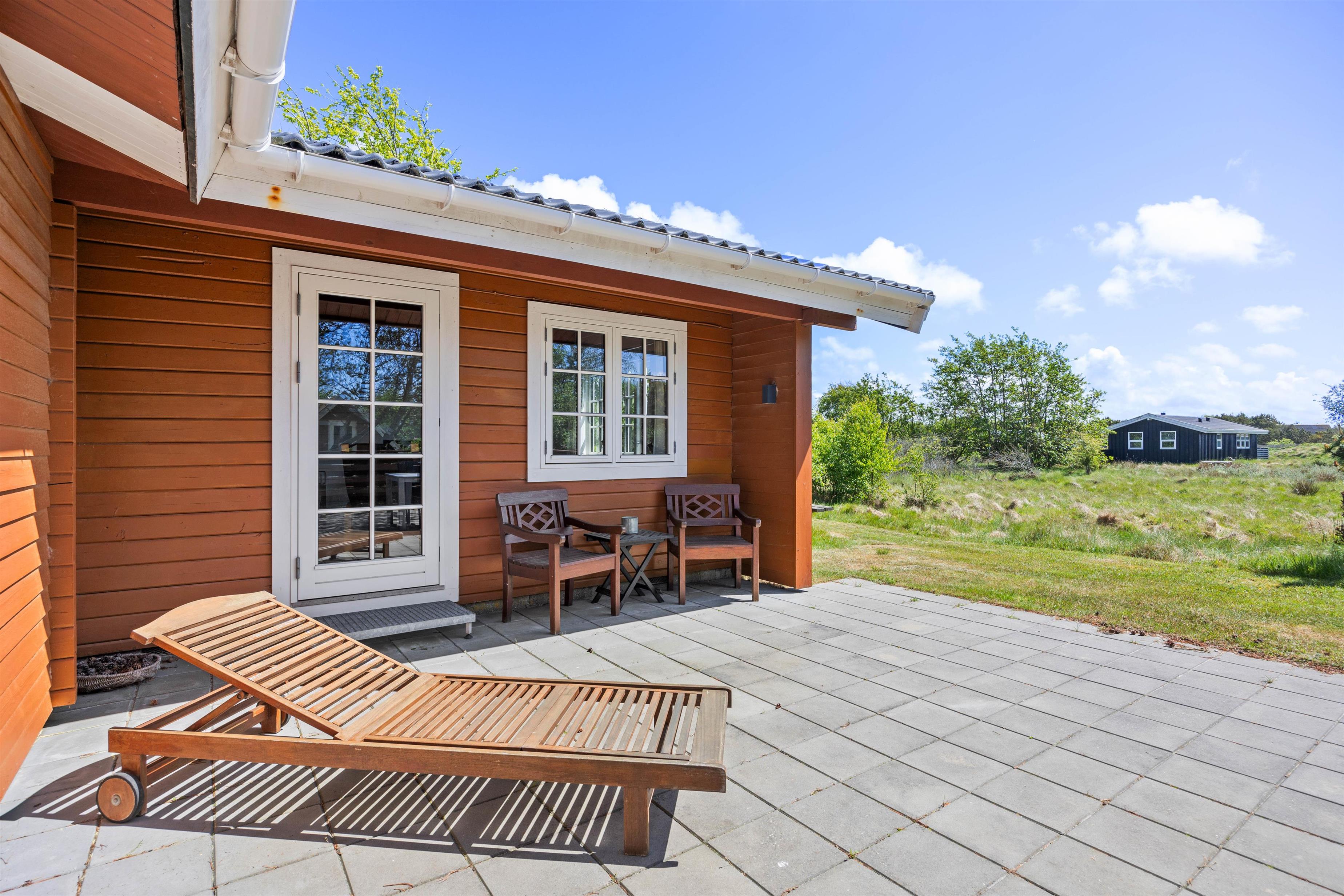 Fra stuen er der direkte adgang til sommerhusets delvist afskærmede terrasse, som indbyder til afslappende stunder i den friske havluft. Her kan I nyde morgenkaffen, slappe af i havemøblerne eller samle familien til fælles måltider under åben himmel. Til de lune sommeraftener står grillen klar – perfekt til hyggelige grillaftener med venner og familie.