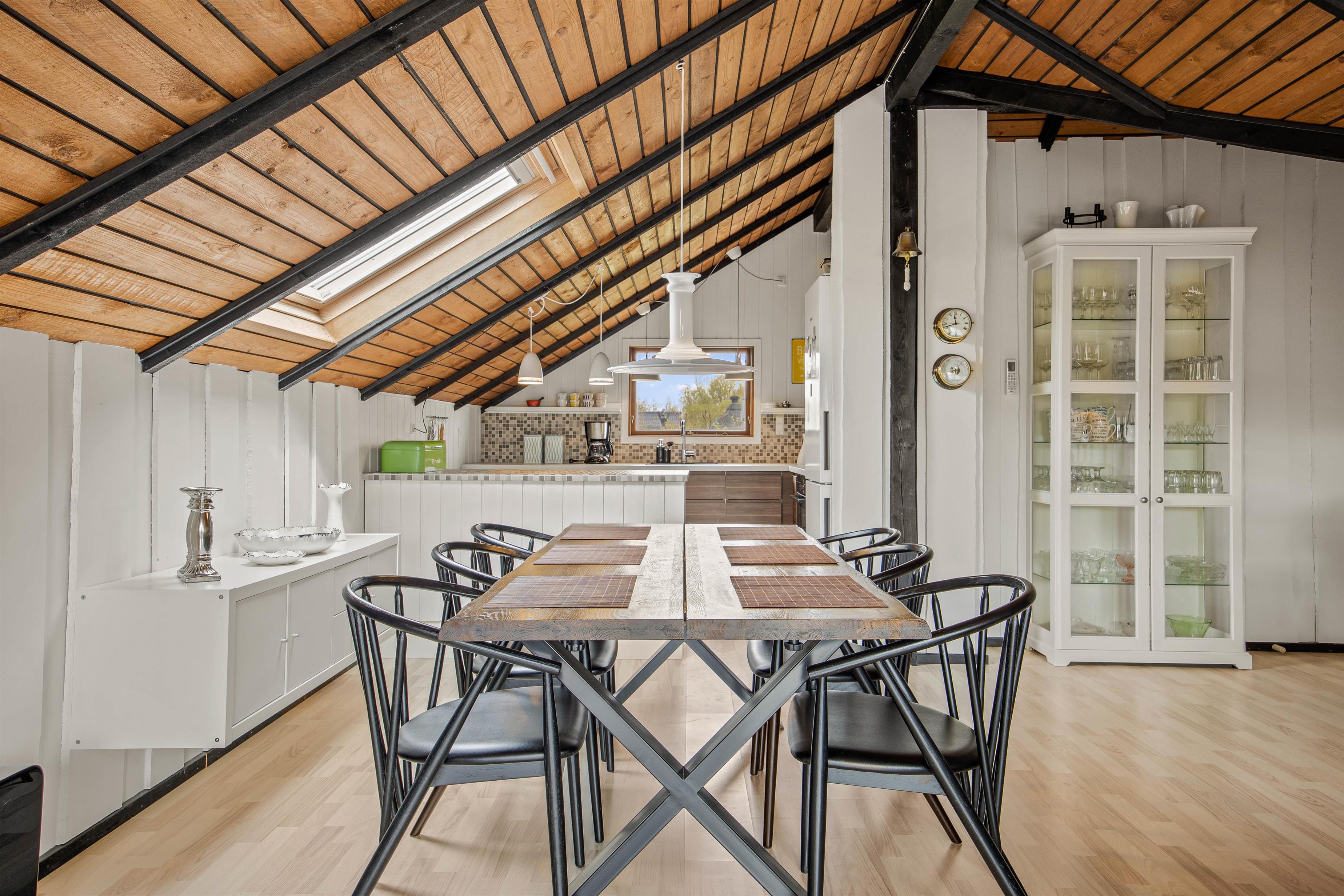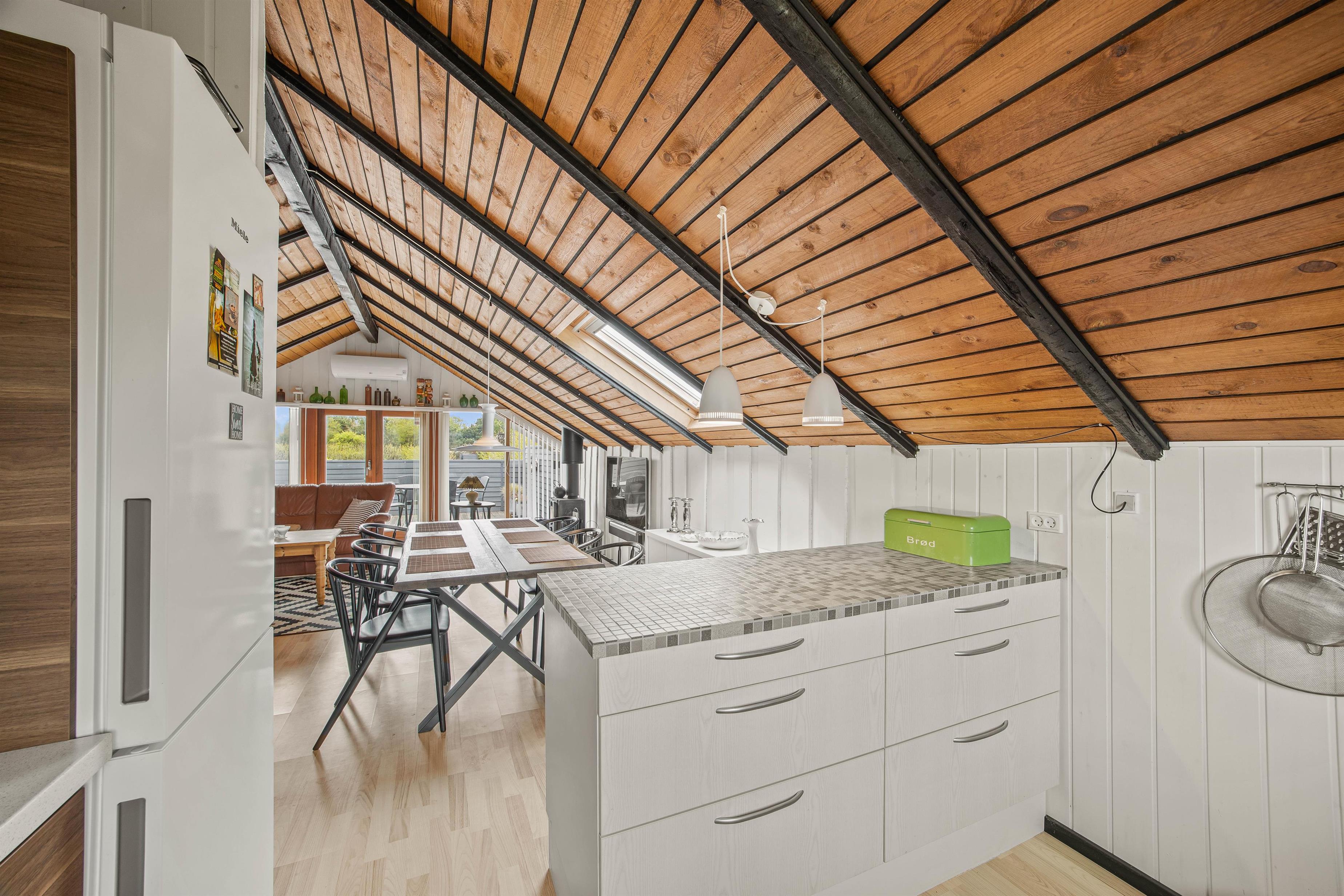 Ferien er godt begyndt i dette autentiske feriehus med klassiske trævægge og lofter, hvor I kan samles i det skønne køkken og alrum, der er indrettet med med moderne, komfortable møbler. Her er der plads til godt samvær med hyggefaktor i form af brændeovn. Her er nemlig god plads til, at alle kan være sammen og stadig lave vidt forskellige ting i samme rum, om det er madlavning, et brætspil, læse en god bog eller bare se en spændende film på tv. Her kan det hele lade sig gøre, alt imens brændeovnen fuldender stemningen med sin behagelig varme og lystige knitren.