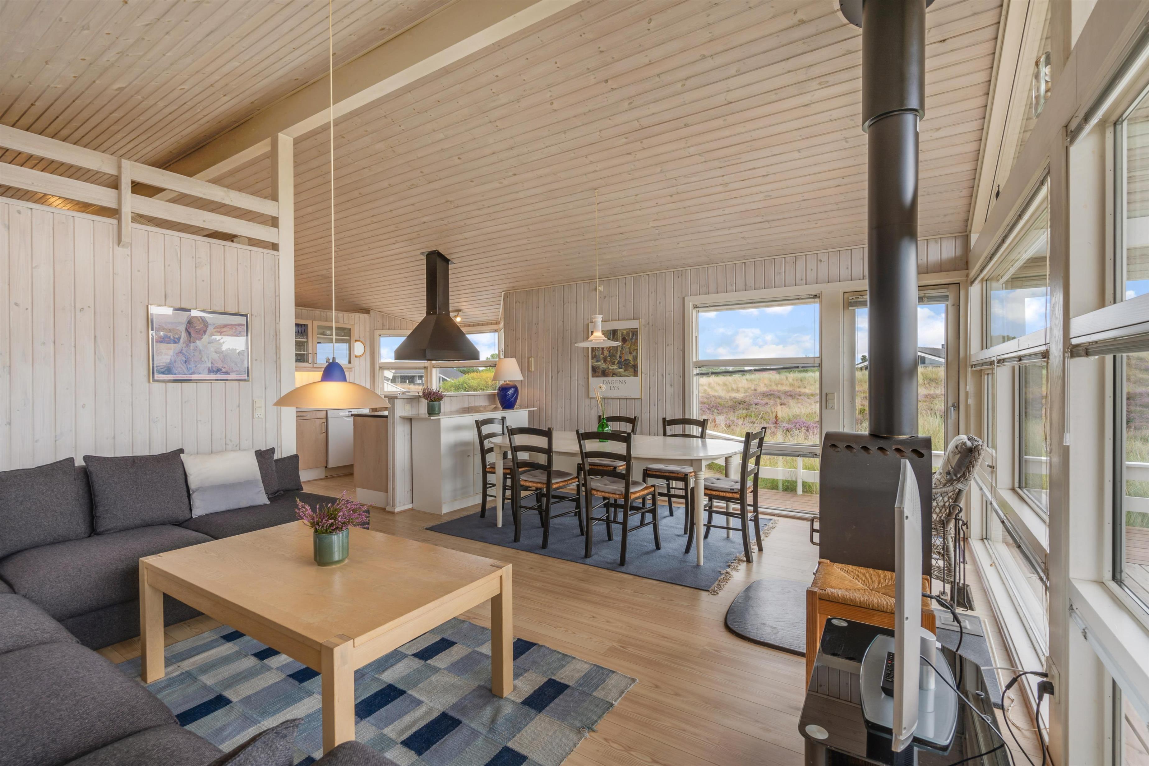 Kernen i det 78 m2 store feriehus er det åbne køkkenalrum med spiseplads og gode komfortable møbler. Lad familiens kok fremtrylle lækkerier i køkkenet, mens familiens mindste hygger omkring spisebordet med et brætspil eller ser en god film i TV'et. Om aftenen kan I tænde op i brændeovnen og nyde flammernes dans, mens den beroligende knitren fylder rummet. Alternativt kan I benytte varmepumpen, som sørger for hurtig og energibesparende opvarmning af feriehuset.