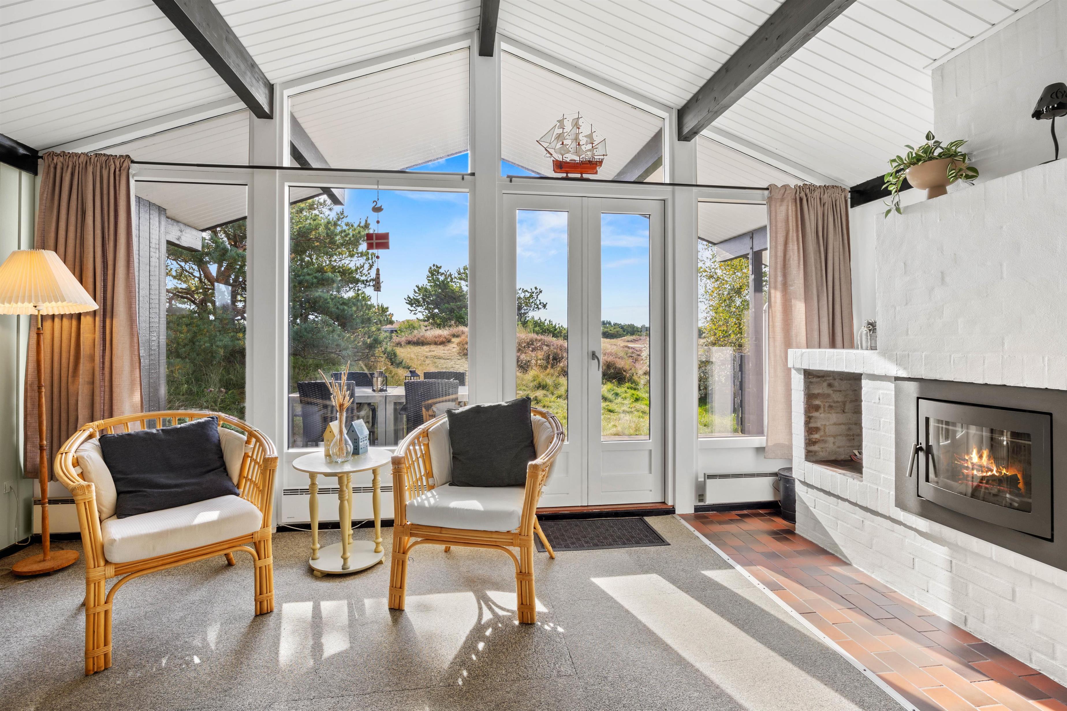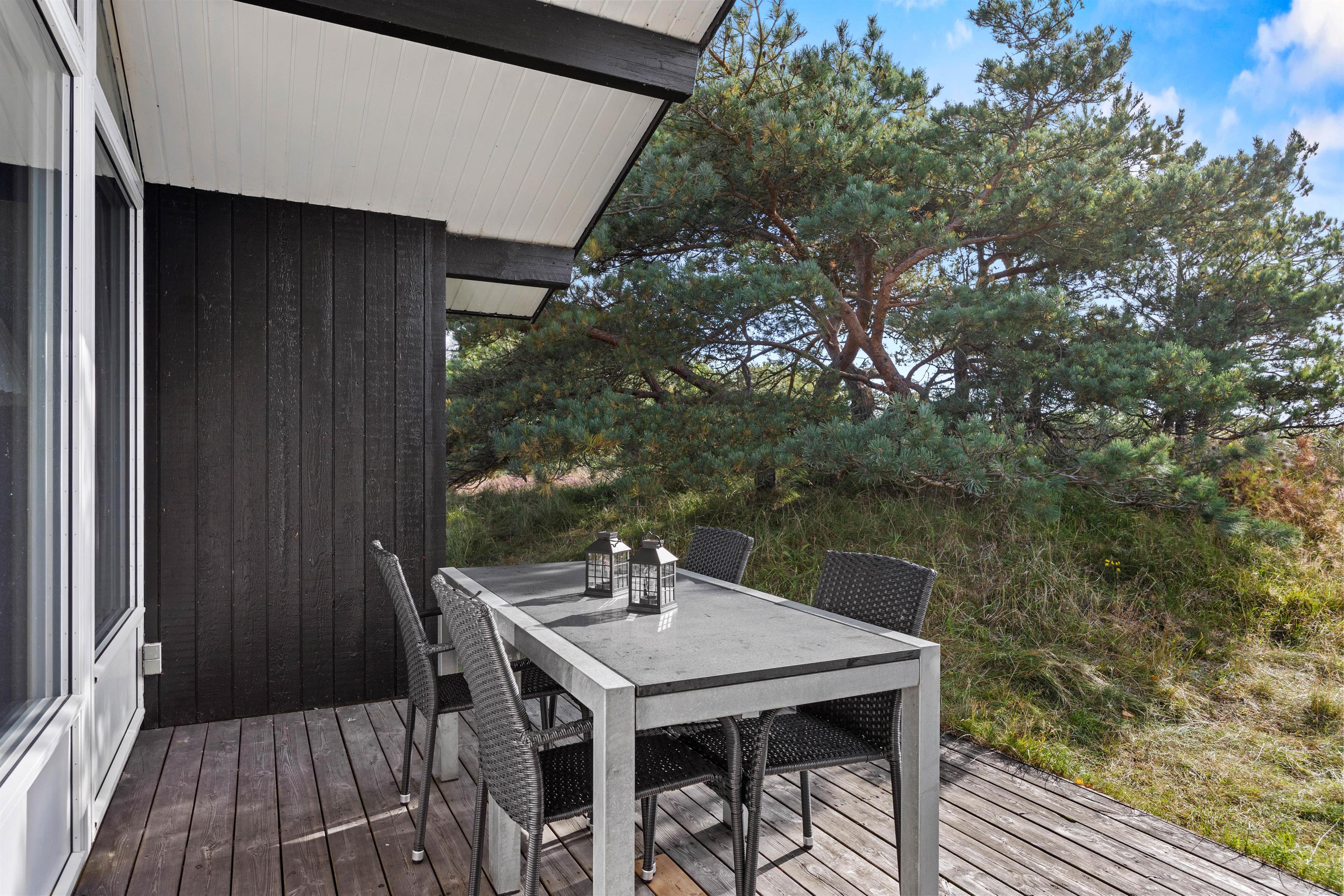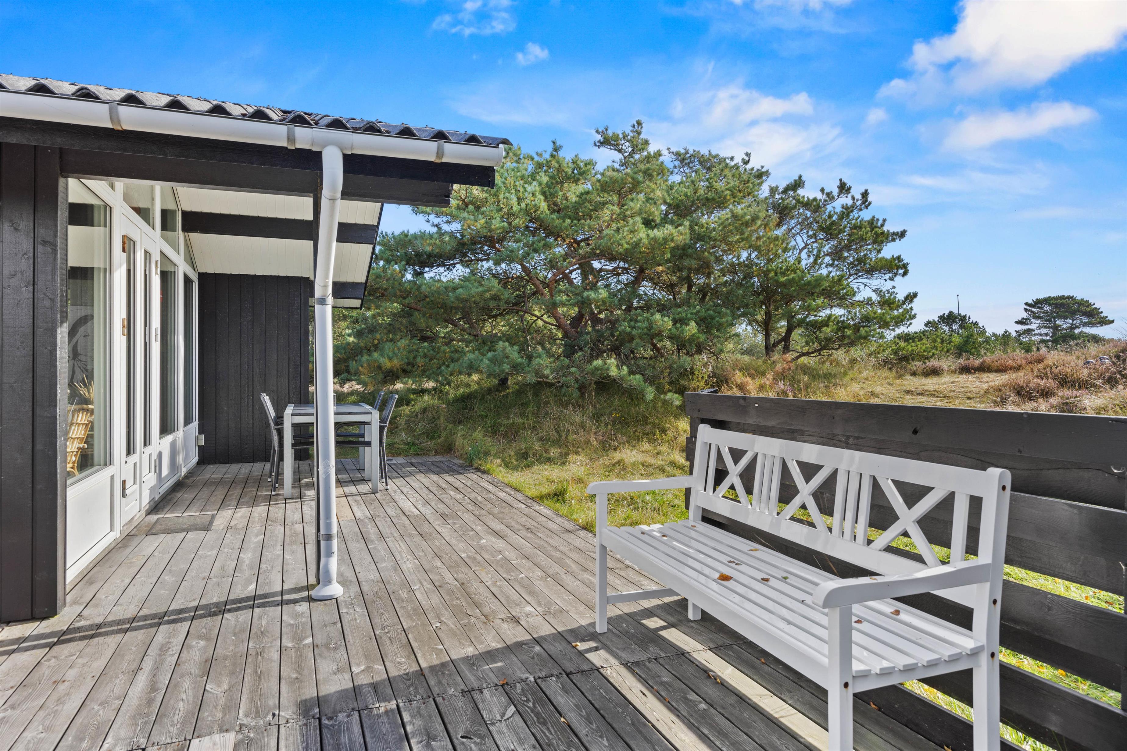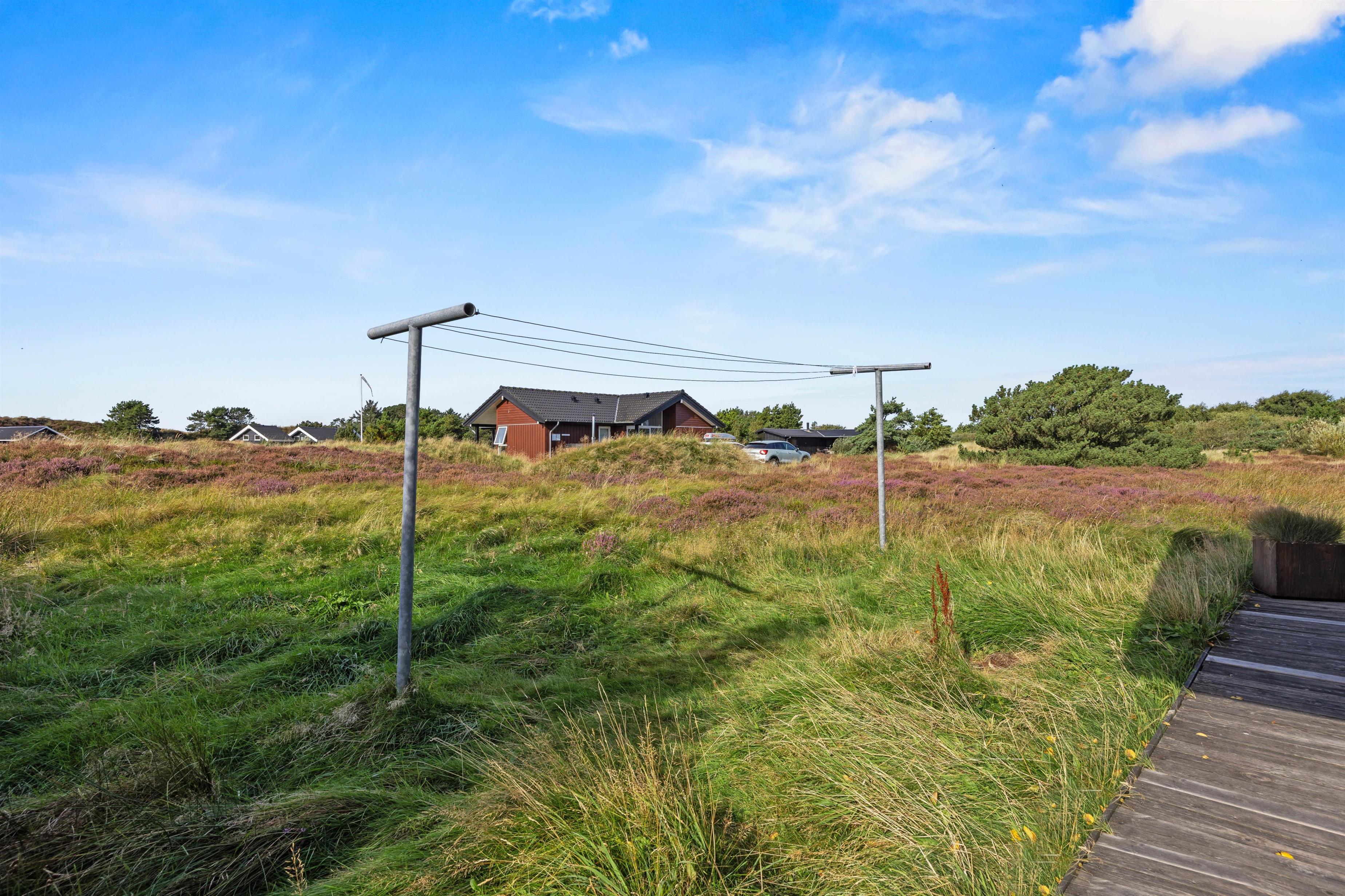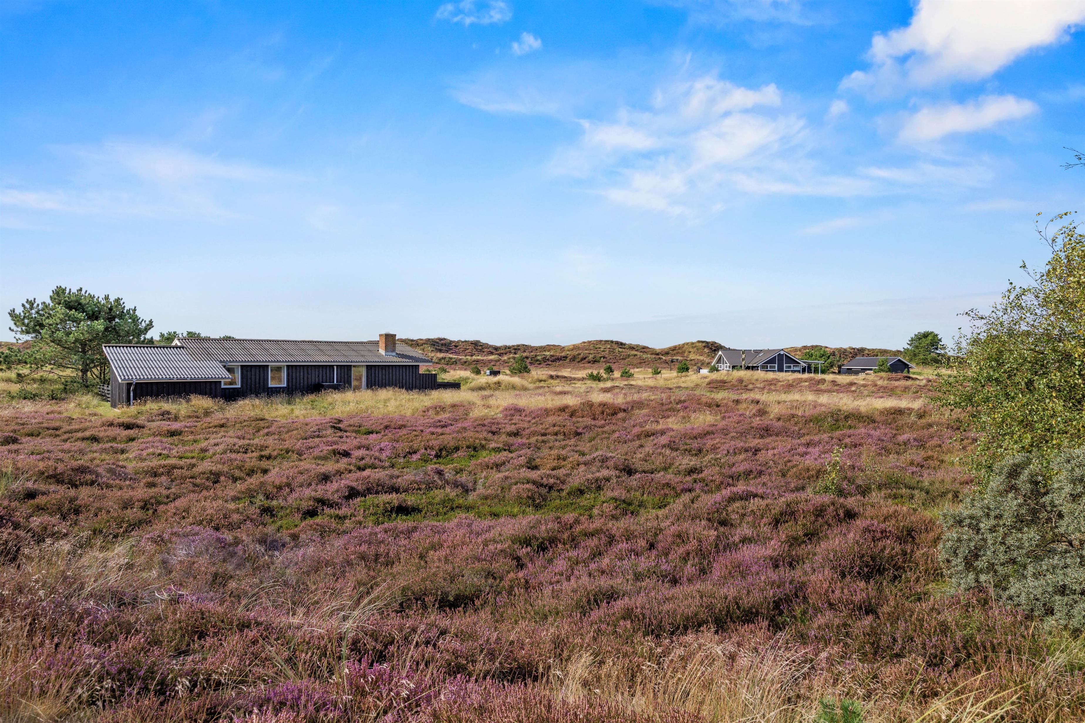 Sommerhuset ligger idyllisk på den godt 2500 m² store naturgrund omgivet af hede og klitter. Der er forskellige terrasseområder med havemøbler og liggestole omkring feriehuset. Afhængigt af solens position og vindens retning kan du altid finde en rolig plet, hvor du kan slappe af.