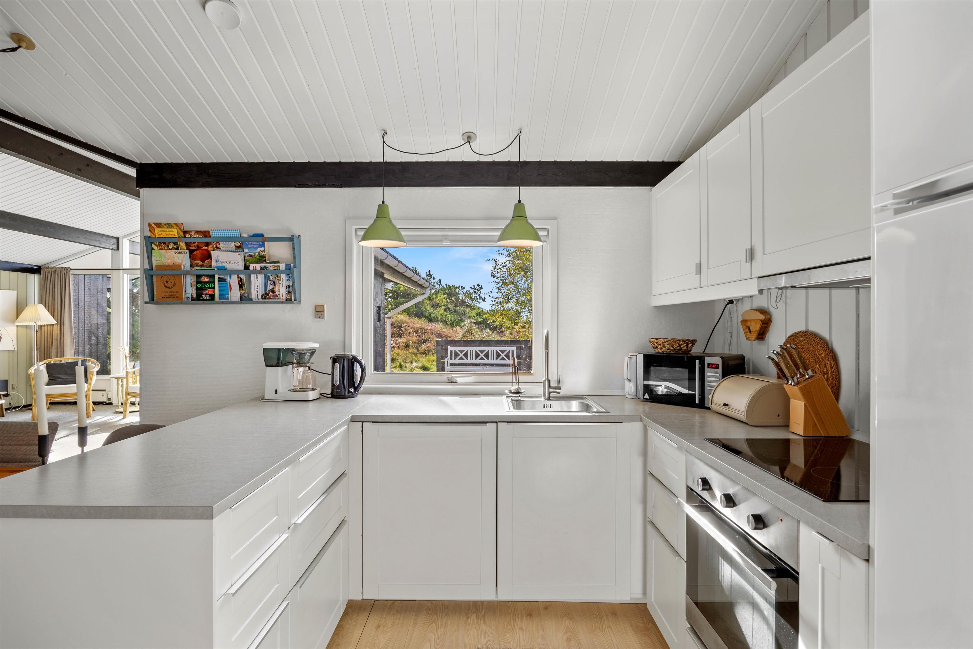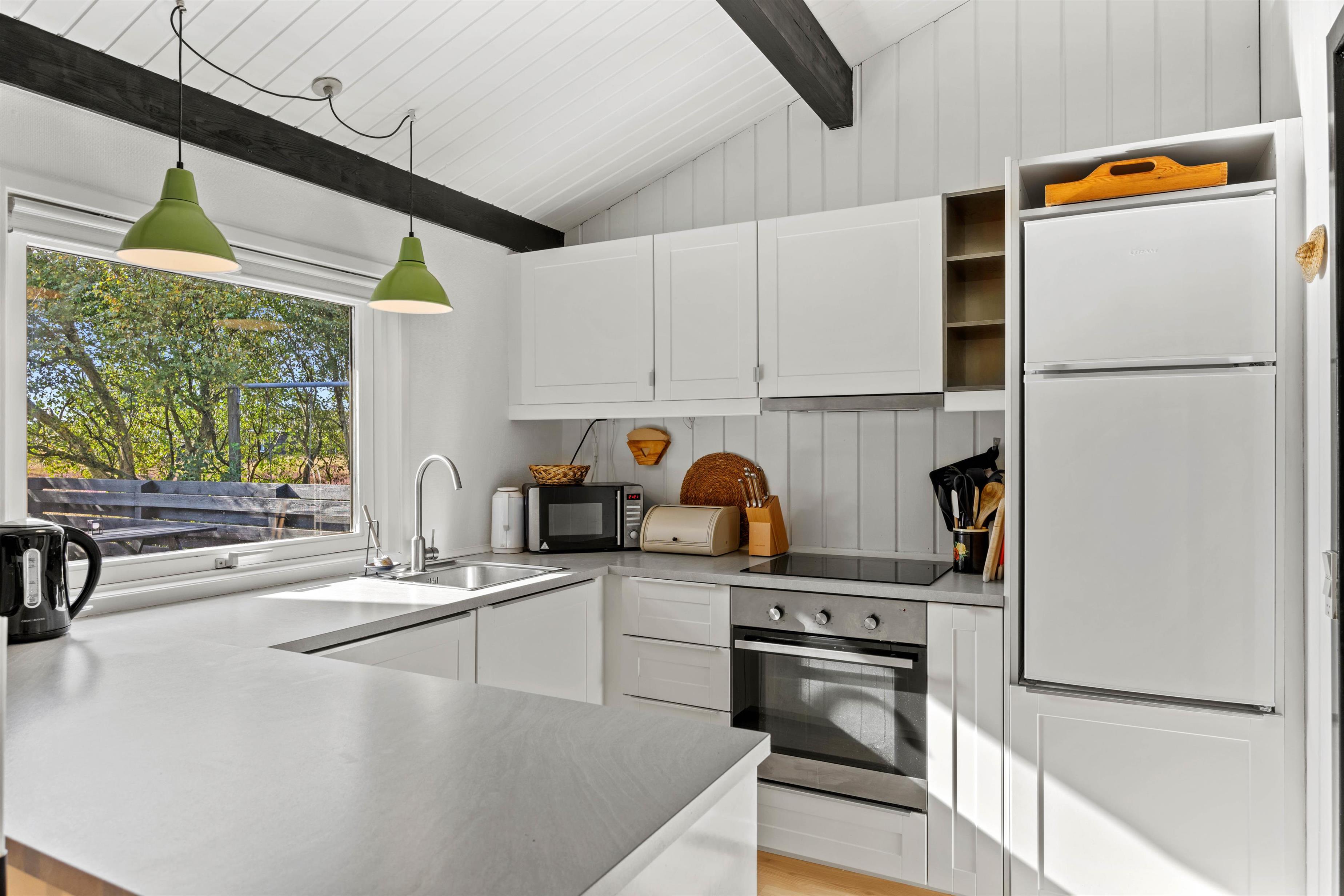 Det åbne køkken er veludstyret og indeholder opvaskemaskine, induktionskogeplade og køleskab med fryserum. Der er en barneseng og en høj stol til de små. I det lyse badeværelse med bruser og gulvvarme finder du også vaskemaskine og tørretumbler, så du kan friske tøj og håndklæder op i løbet af ferien.