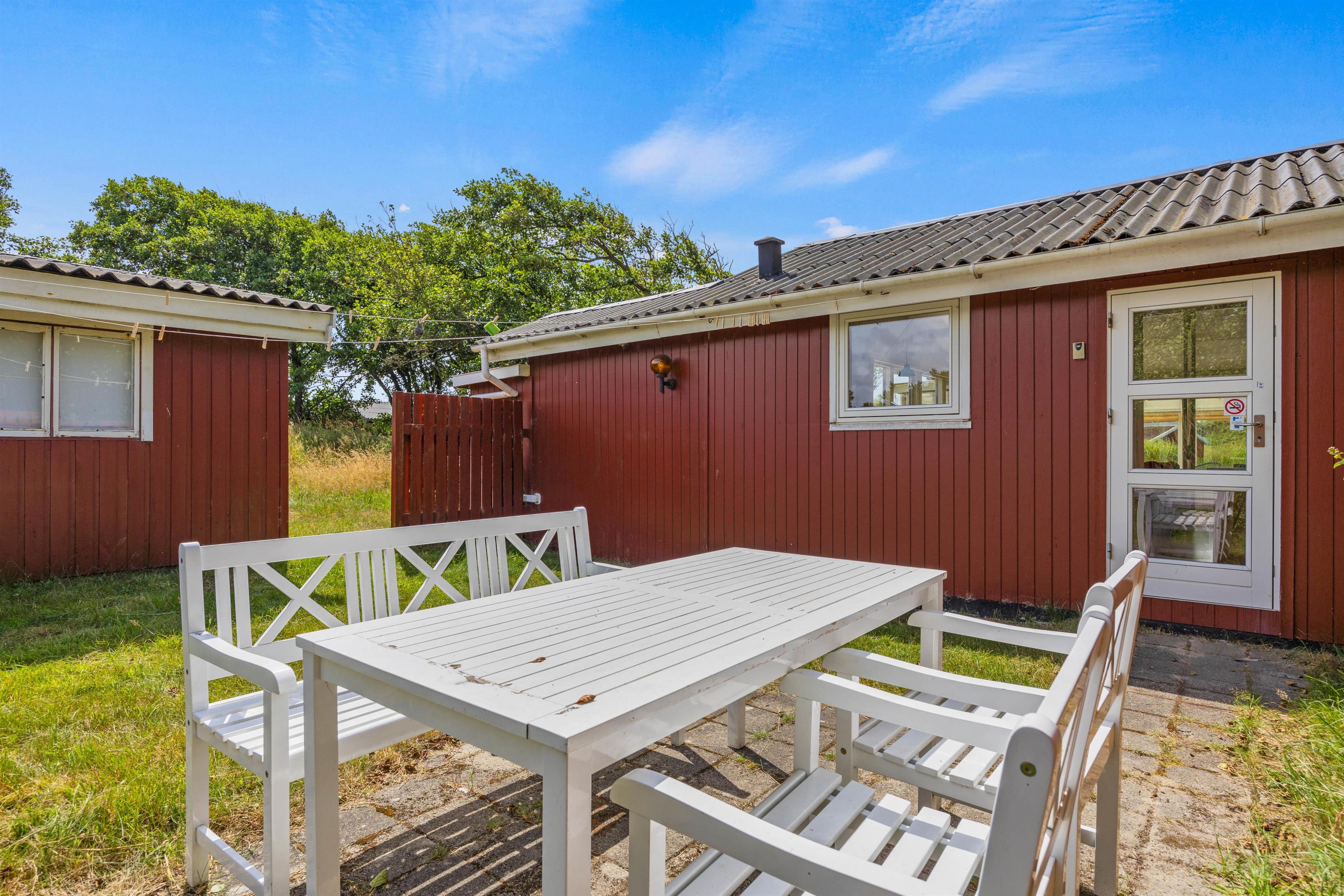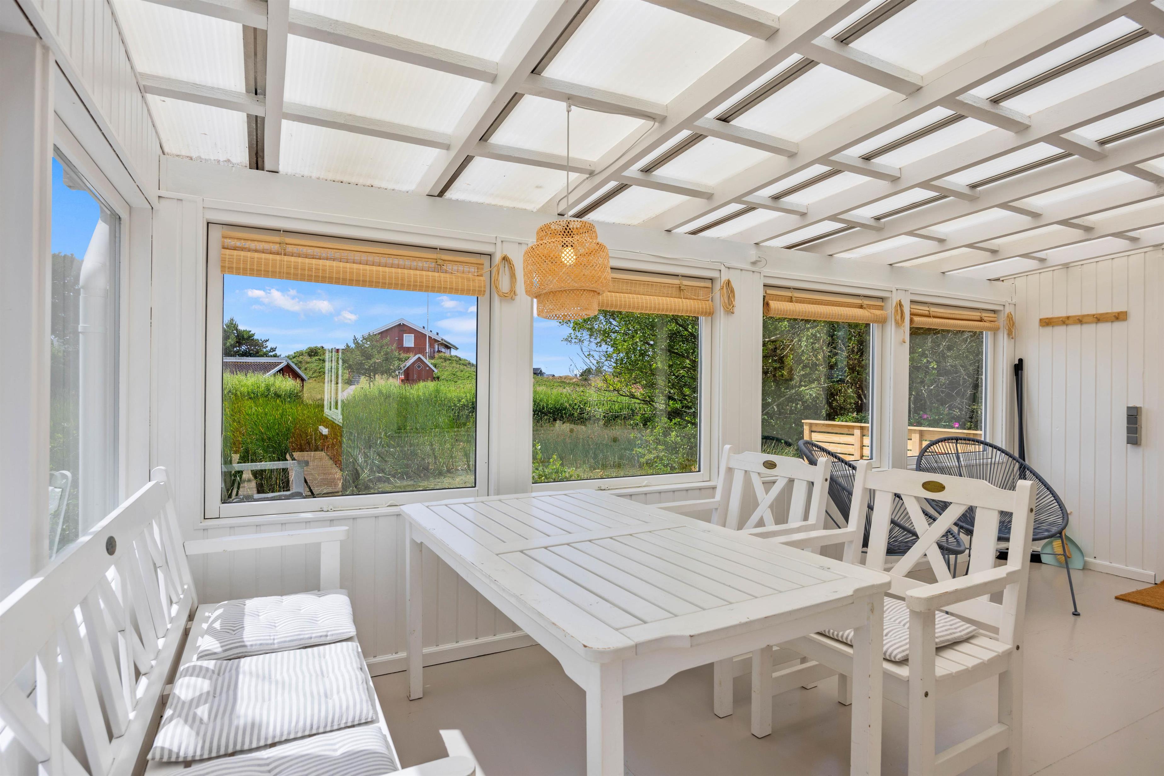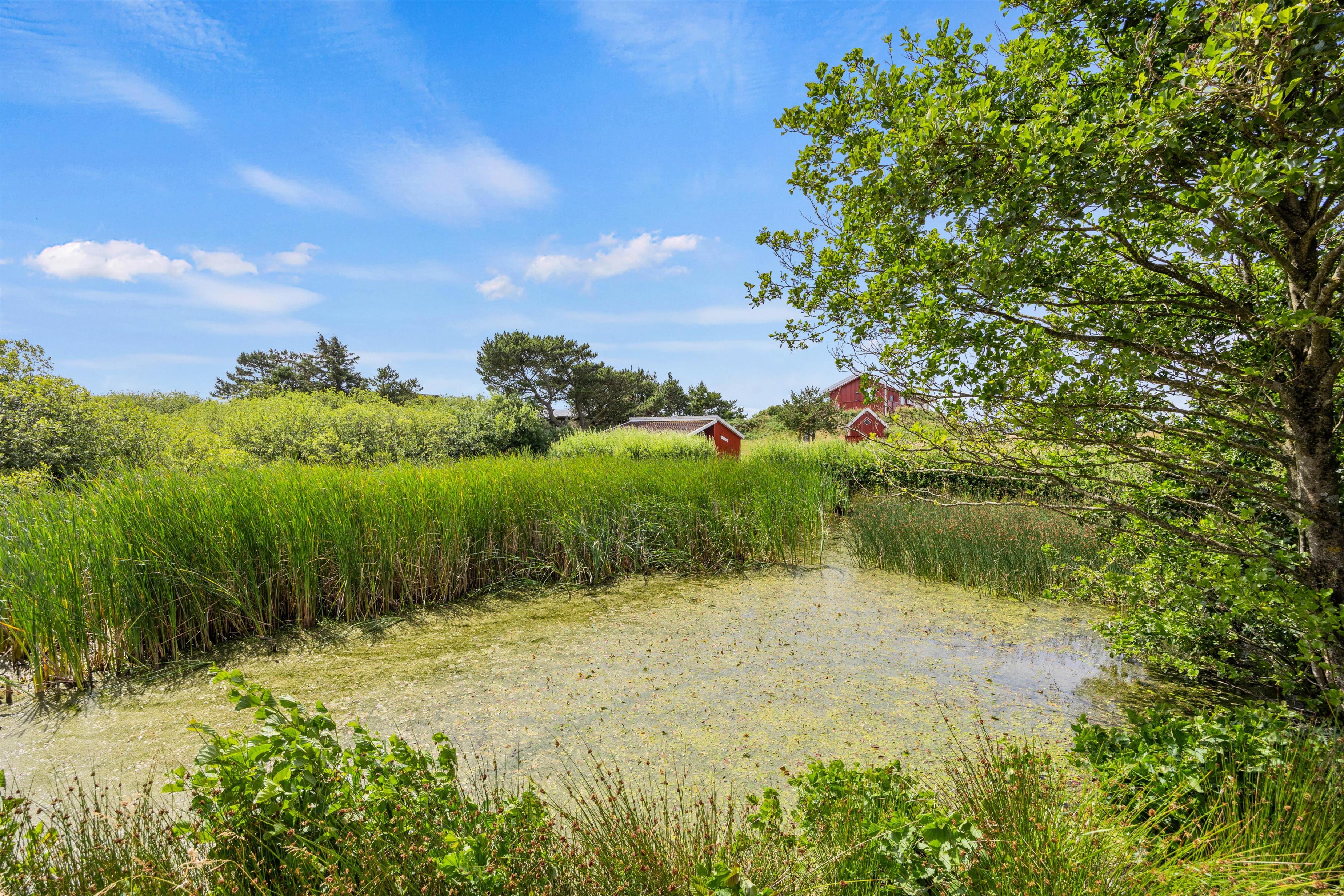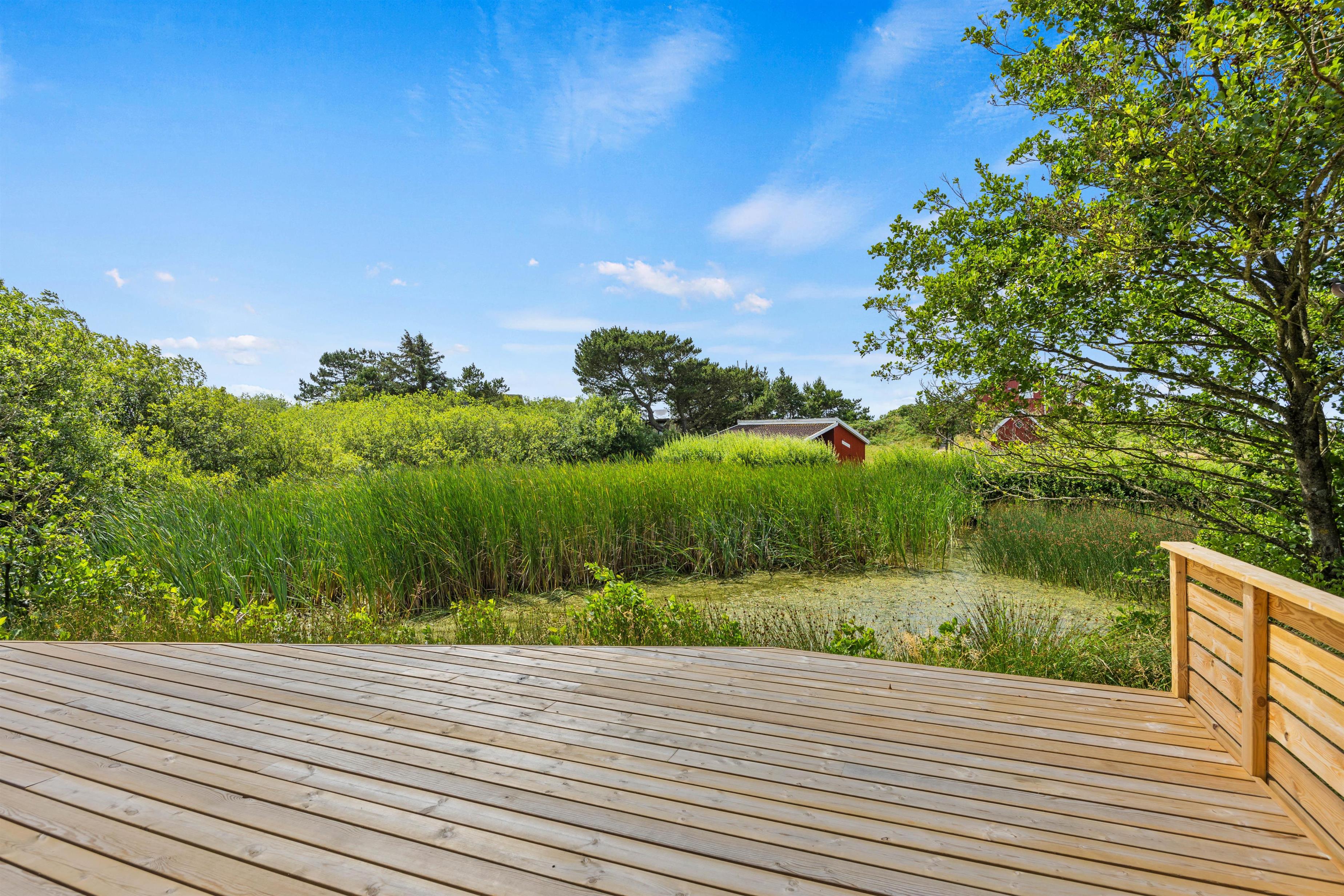 Fra den åbne terrasse har I den dejligste udsigt over både søen og naturgrunden. Her kan I solbade i liggestolene eller trække jer tilbage i havemøblerne med en drink eller en kop kaffe. Med kun 600 m til Vesterhavet vil en daglig gåtur dertil hurtigt blive et tilbagevendende punkt på ferie-dagsordenen. Her er skønt ved både ebbe og flod. Tænd op i grillen til aften, og nyd et lækkert grillmåltid sammen, imens skyggerne bliver lange. Her I mere energi, og lyst til endnu en ferieoplevelse, kan I bagefter gå til stranden og opleve solnedgangen i Vesterhavet som afslutning på dagen.