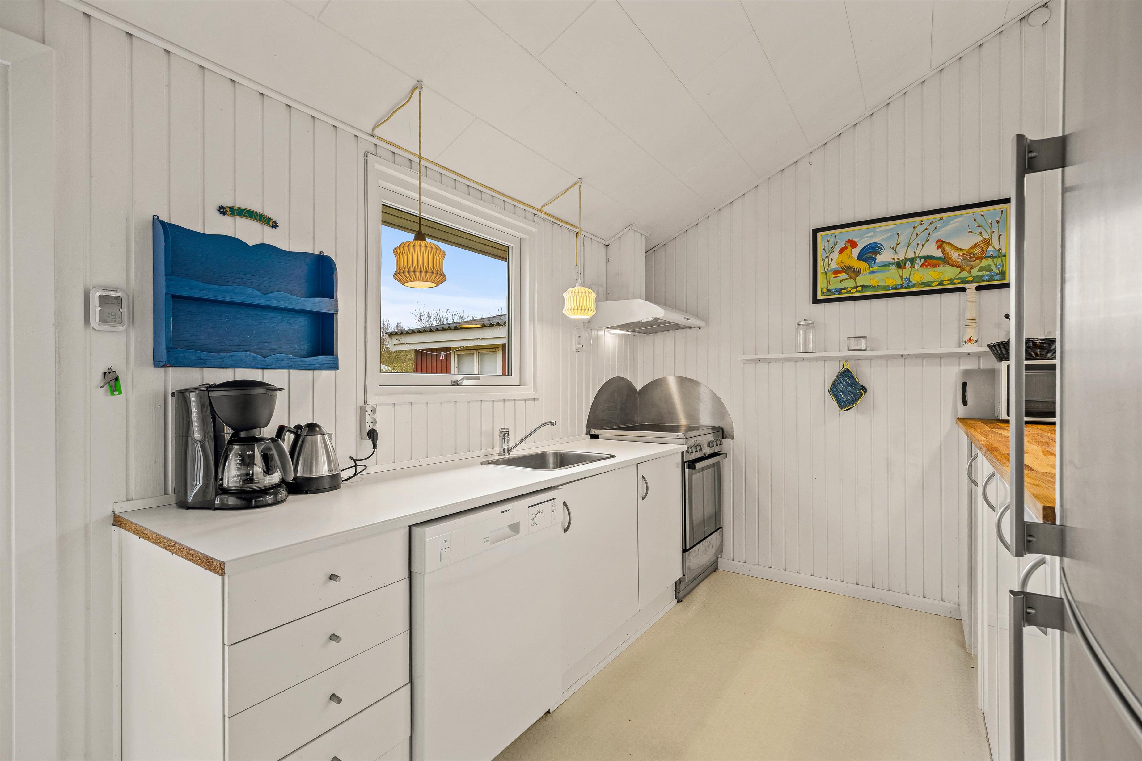 Man føler sig hjemme straks, man træder ind ad døren til Strandgårdsvej 7. De lyse gulve med trælaminat og hvidmalede vægge og lofter giver et dejligt lyst og let miljø. Her kan I hygge jer sammen i stuen eller i bænkekrogen ved spisebordet med ild i brændeovnen. Er det overskyet en dag, kan I forlænge dagen i udestuen, hvor I har den skønneste udsigt over søen. Der er et specielt fint lysindfald gennem de brede vinduespartier, så I kan nyde den skønne beliggenhed på naturgrunden. Det åbne køkken med morgenmads-bar indeholder alt, hvad I behøver for at forkæle hinanden med hjemmelavede retter. Den omkostnings- og energibesparende varmepumpe sørger for behagelige temperaturer i feriehuset.
