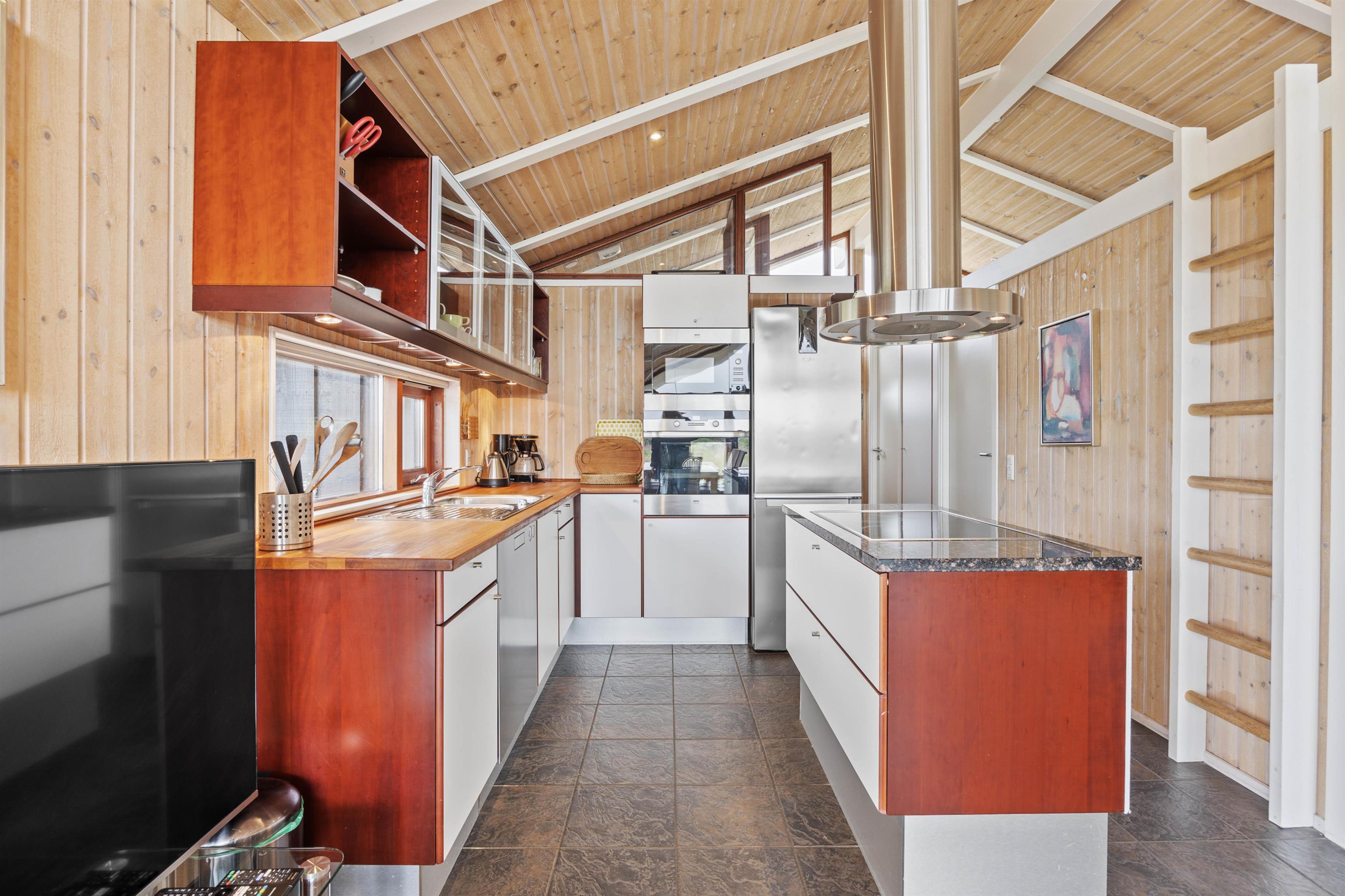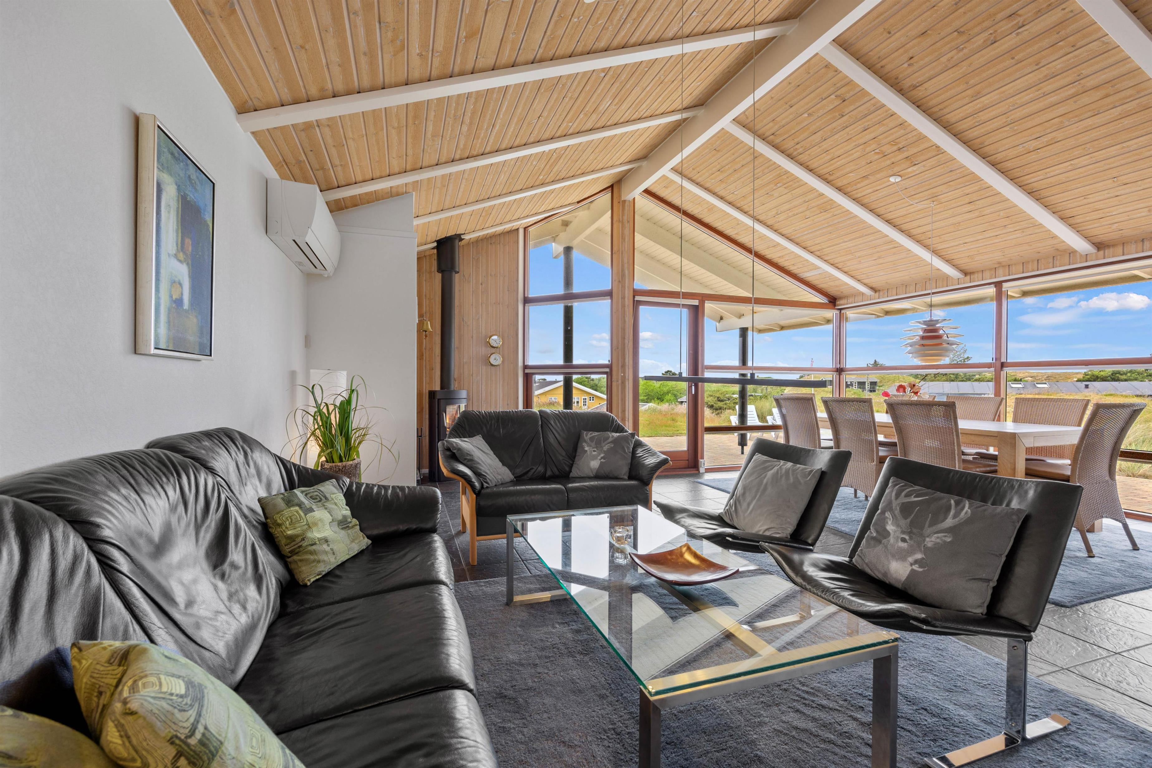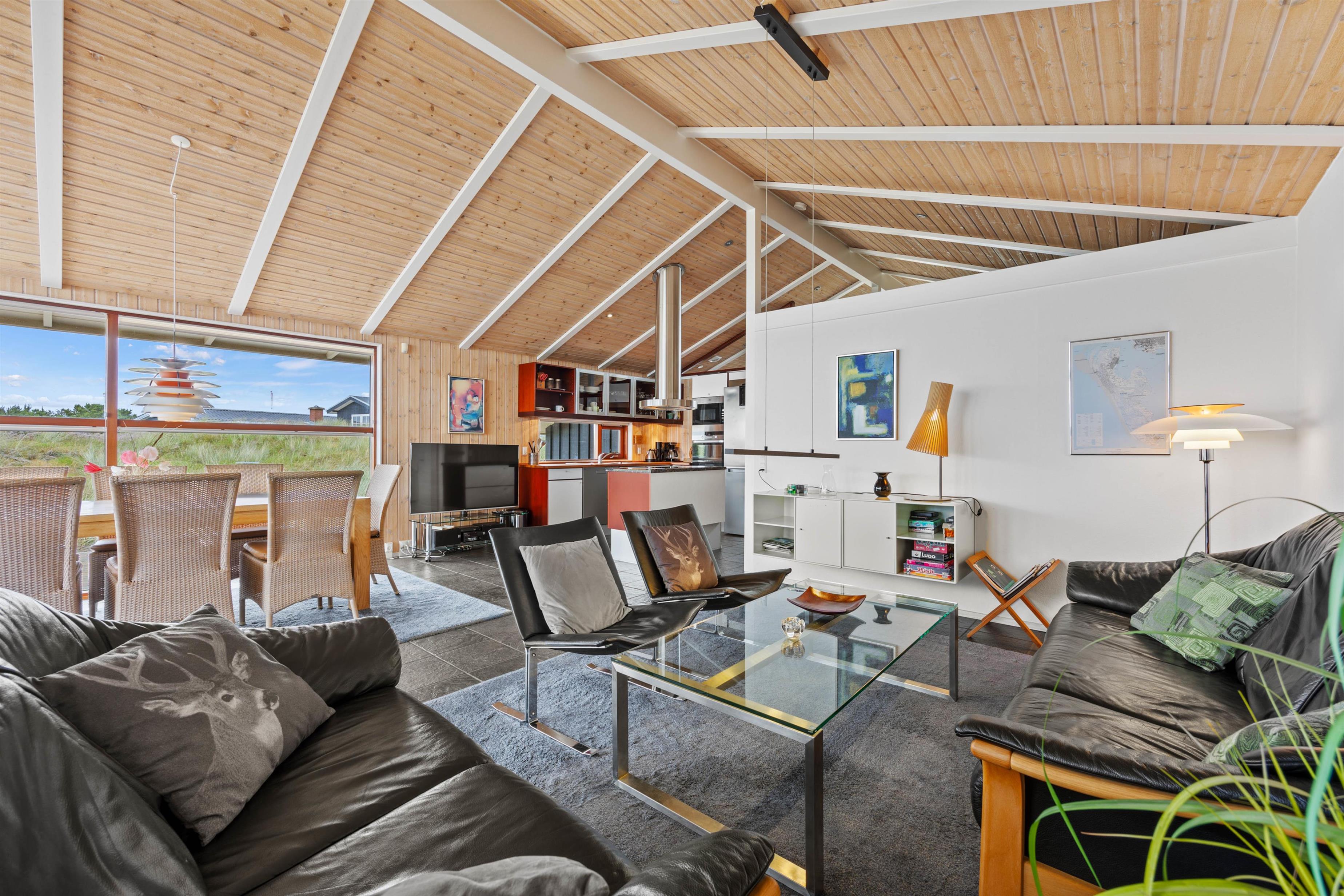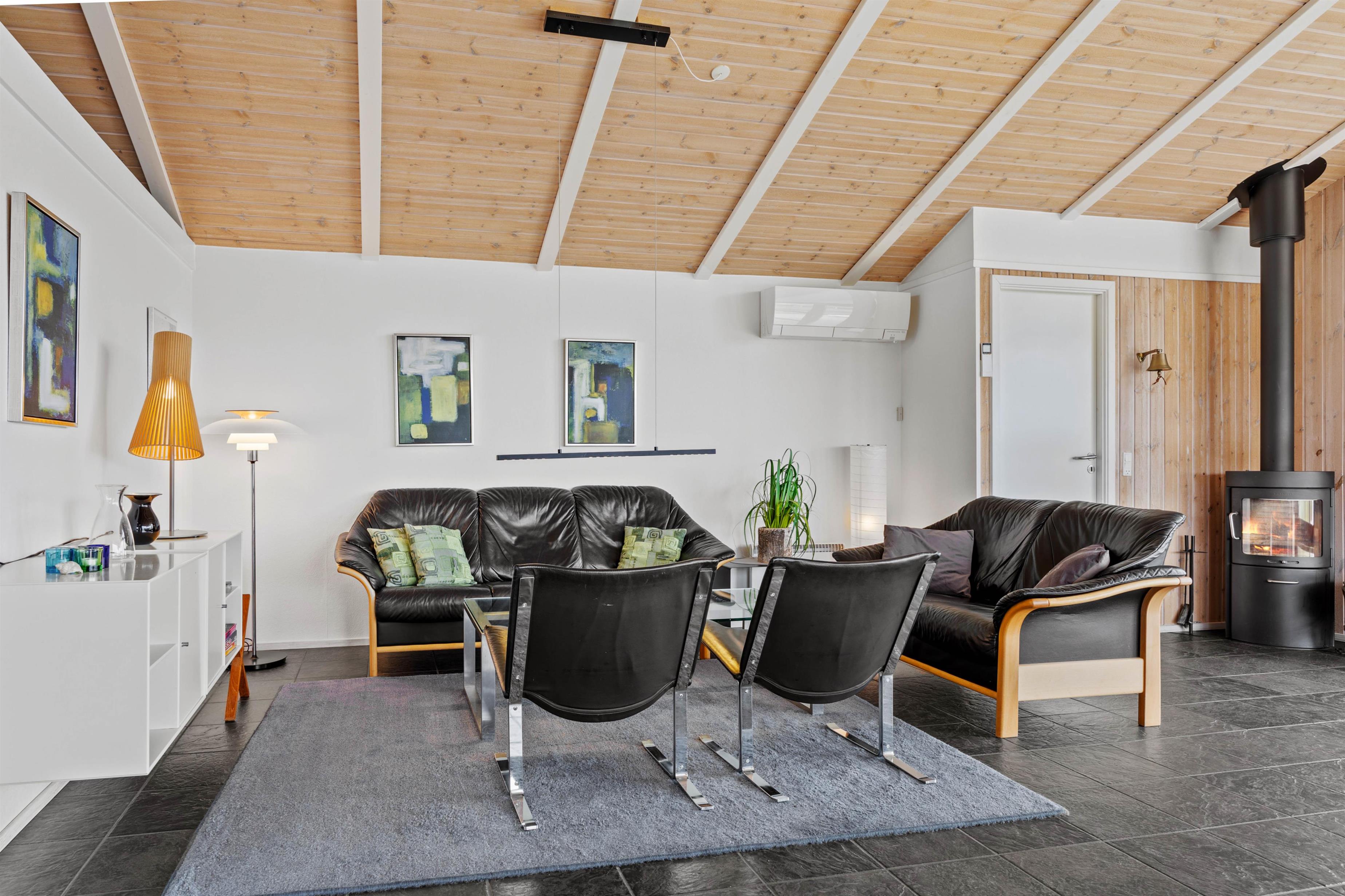 I opholdsrummet forenes stue, køkken og spiseplads i ét. Her er god plads og en behagelig afslappende atmosfære. Her kan I se film, holde brætspilsaftner og lave dejlig mad i det veludstyrede køkken. Den energivenlige varmepumpe sørger for et behageligt indeklima, mens den knitrende brændeovn spreder ekstra hygge i stuen. Her kan I få varmen og nyde ferien, evt. med en god bog og en kop kaffe.