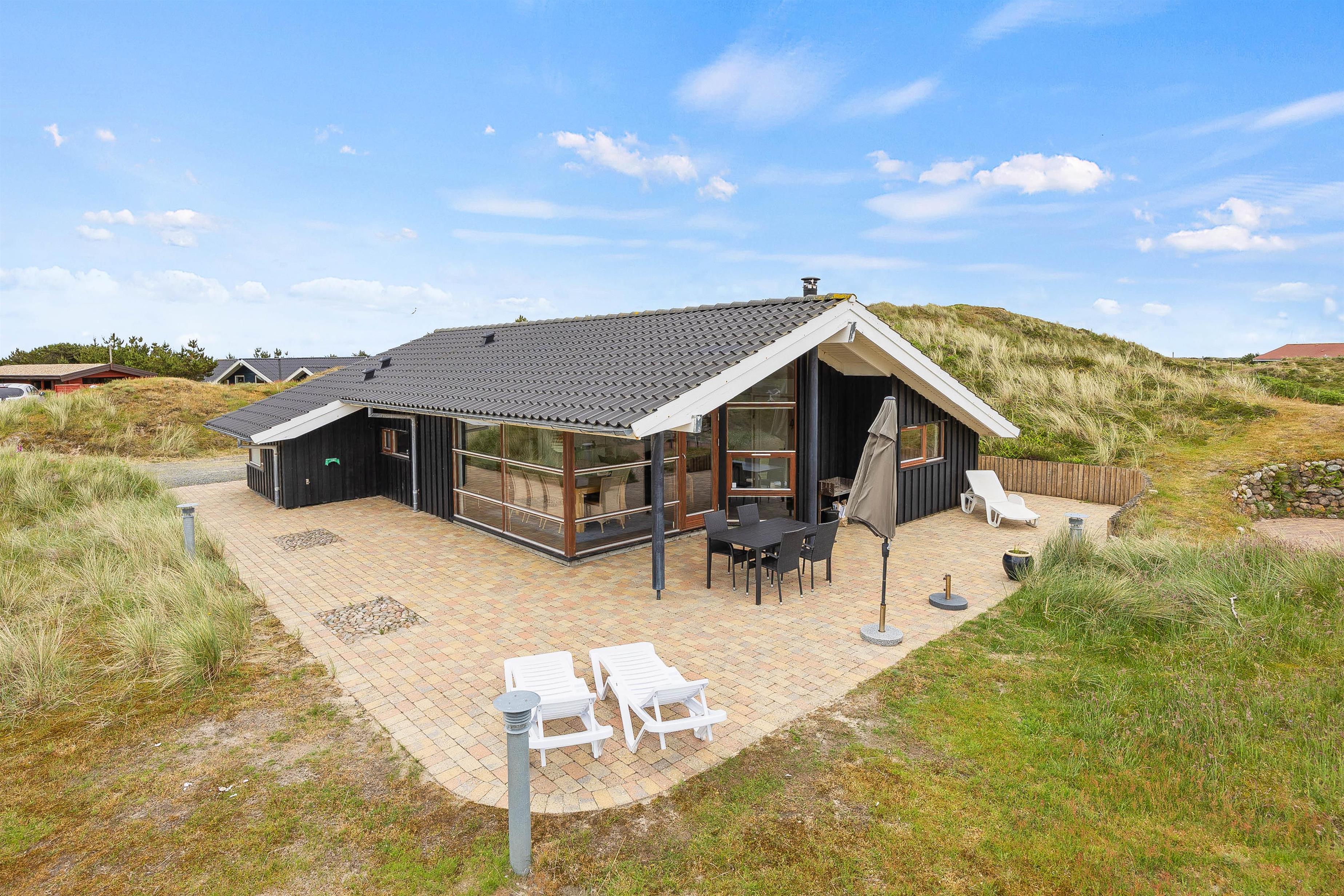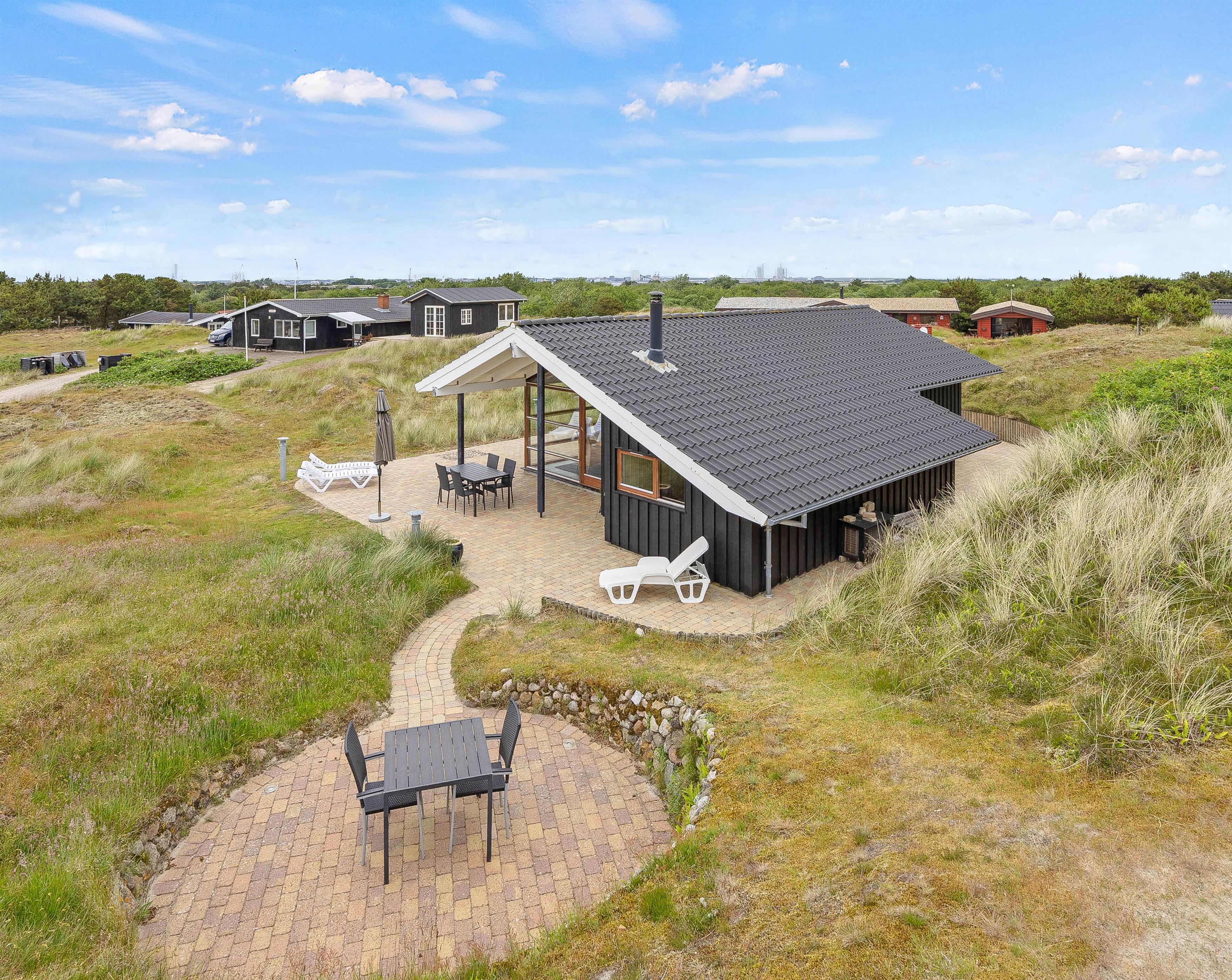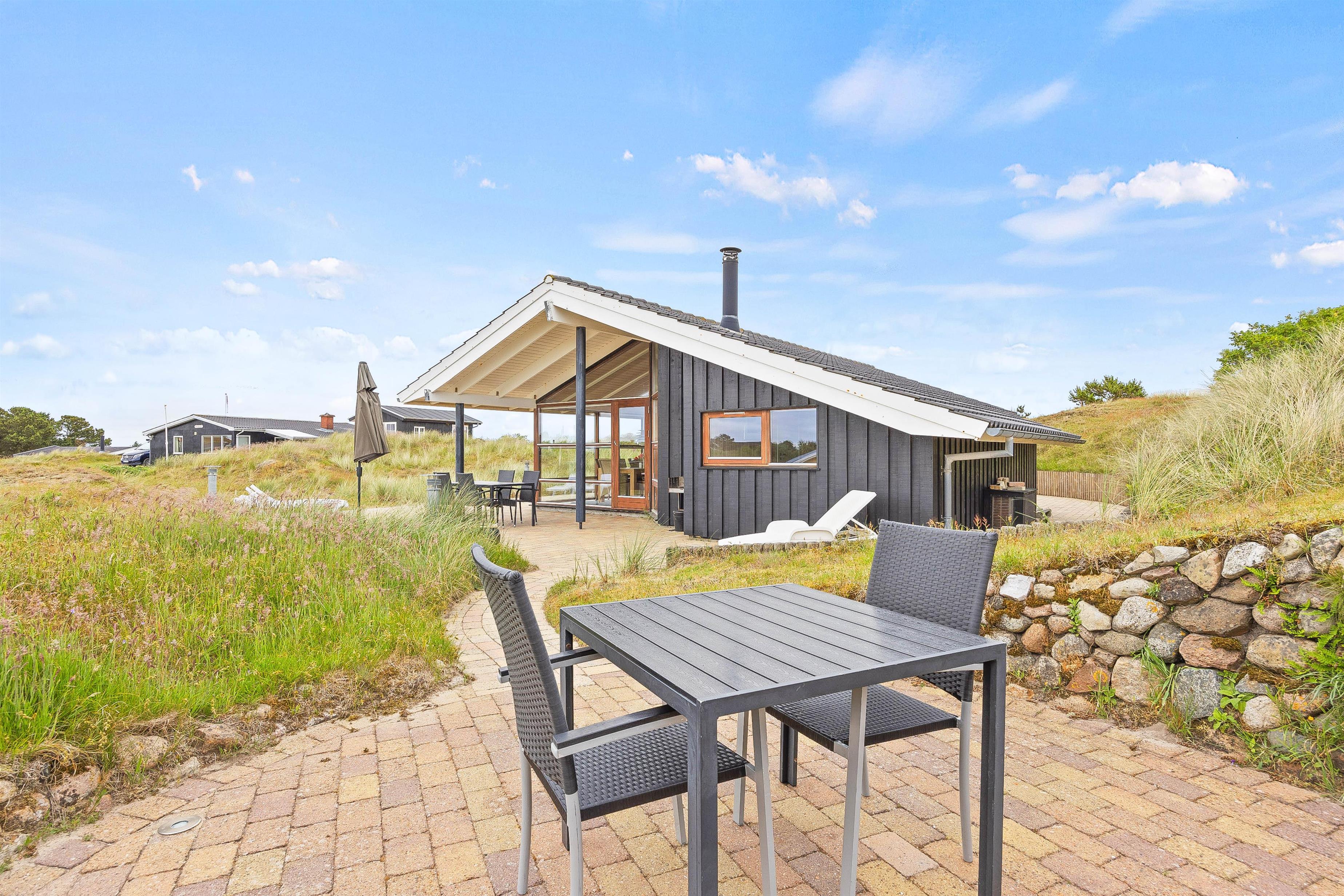 Sommerhuset er beliggende på en smuk naturgrund, og udenfor er der anlagt flere hyggelige terrassehjørner. Her kan I altid finde et behageligt spot, både i solen og i skyggen. Start dagen med en dejlig morgenmad på den overdækkede terrasse, imens I planlægger dagens program. På Fanø er der både mulighed for at både at tage på opdagelse, dase ved Vesterhavet eller også kan I blot nyde vejret på terrassen.