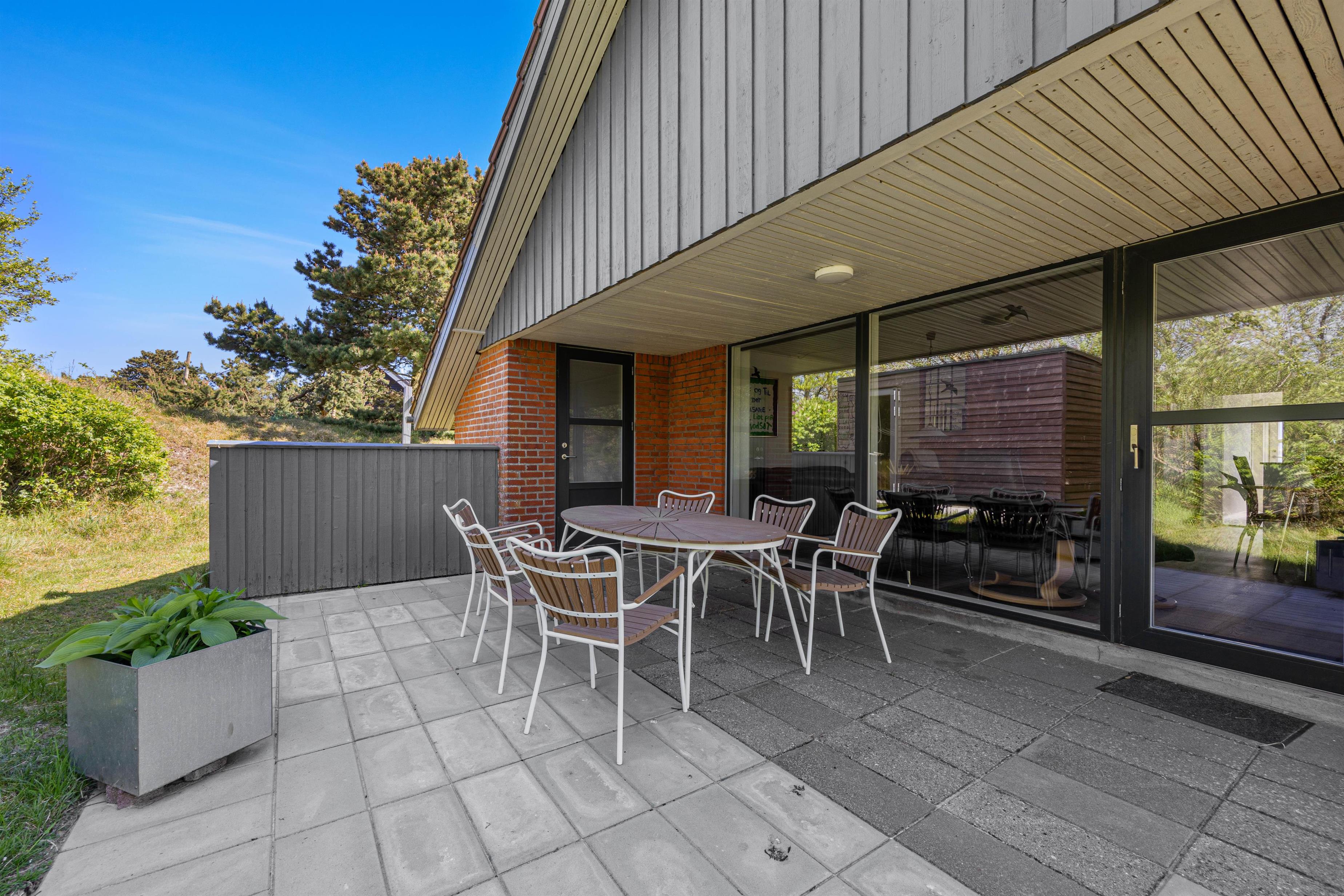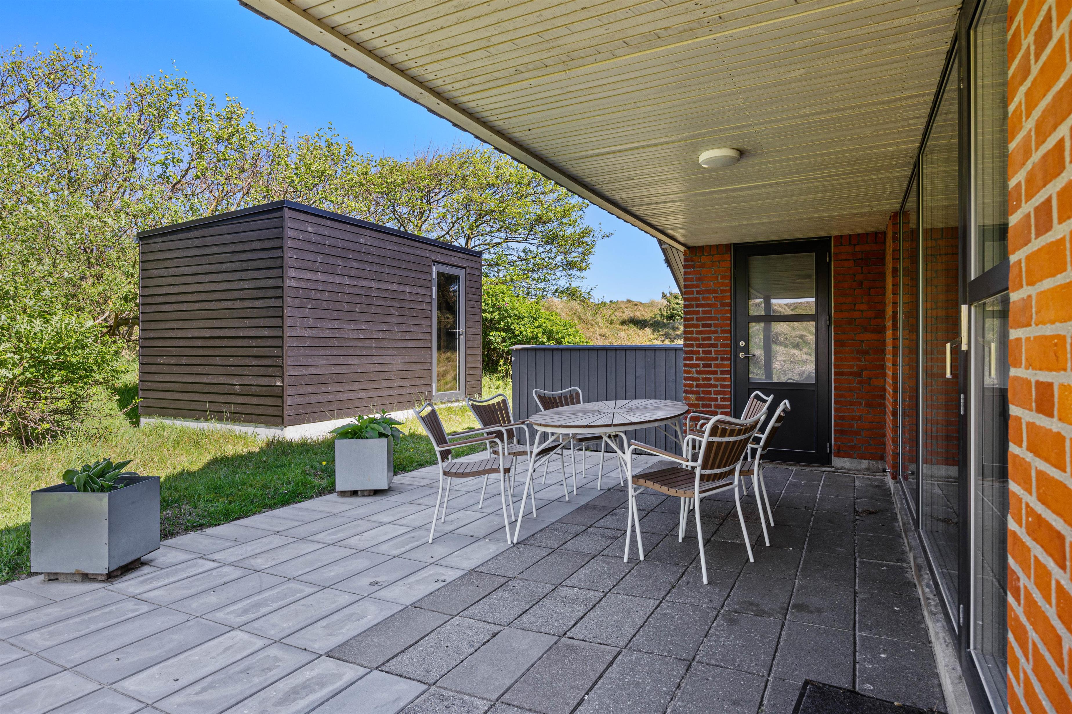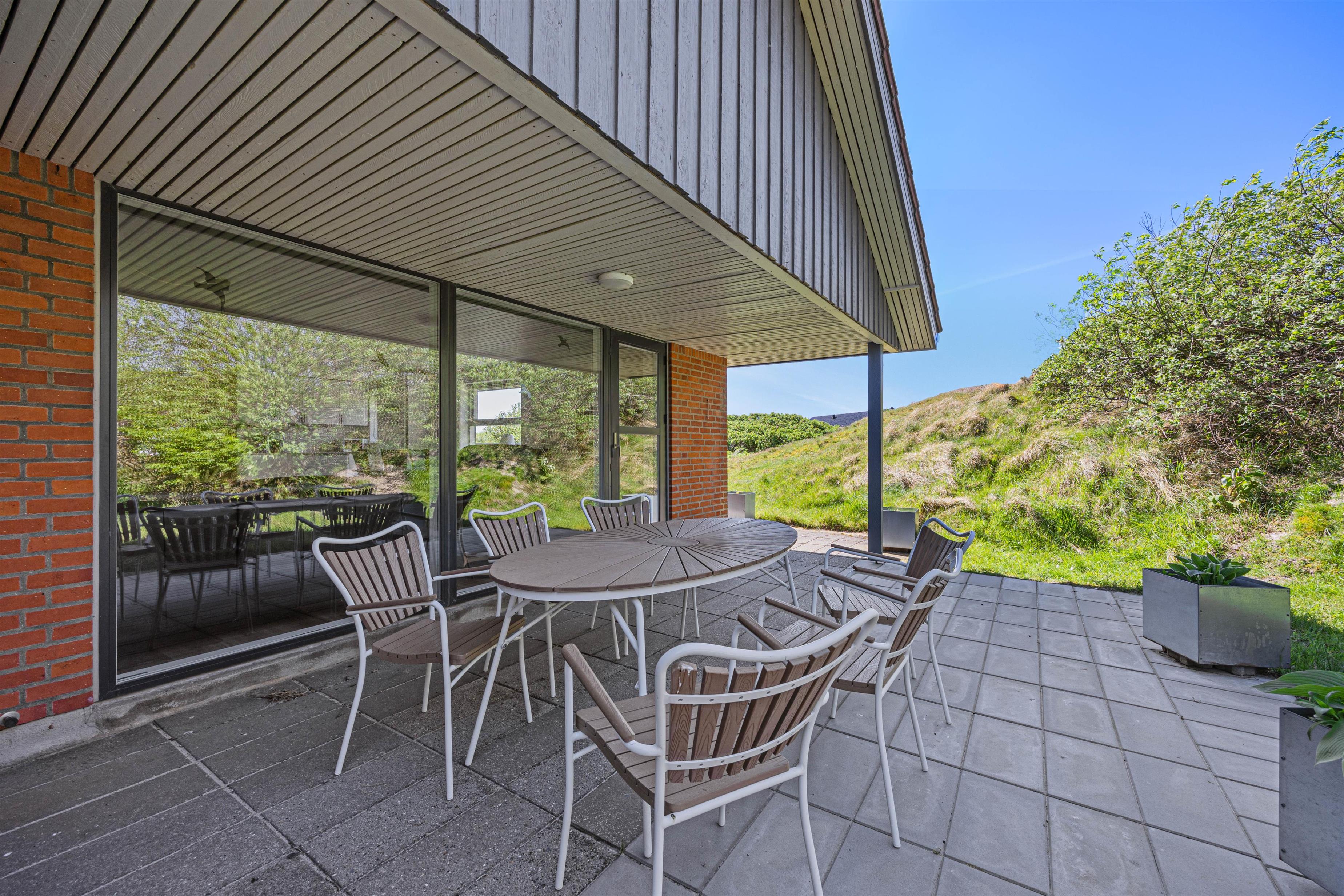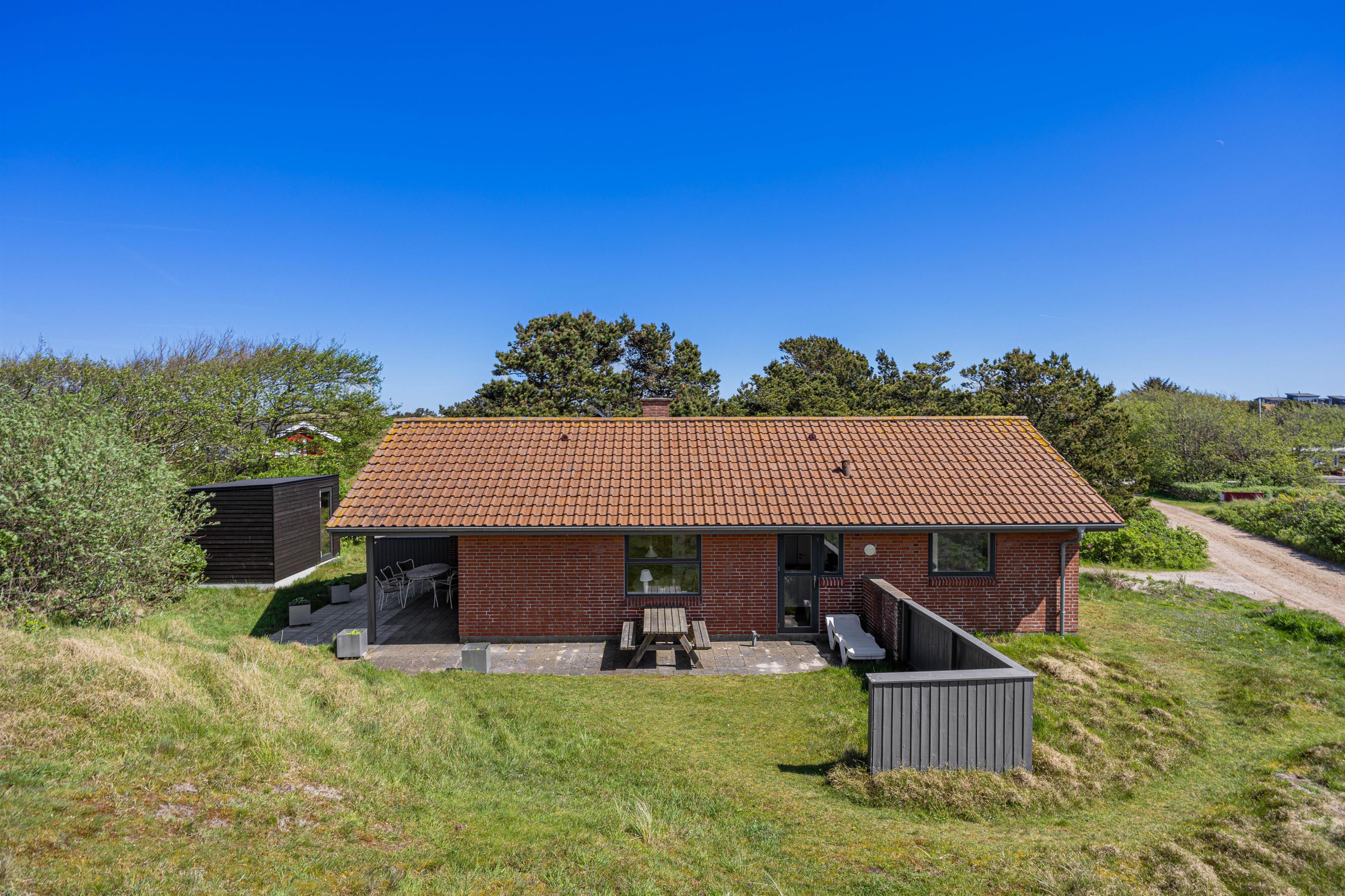 På den skønne 703m2 store naturgrund, der ligger godt i læ bag en stor klit, kan I hygge og dase i havemøblerne på den delvist åbne og overdækkede terrasse, hvor der også er opsat læhegn. Så her er der mullighed for udeliv i forskelligt slags vejr - også når der skal grilles diverse lækkerier. Når solen skinner kan I sætte jer til rette i solvognene med en god bog, og bare lade følelsen af afslapning skylle ind over jer.