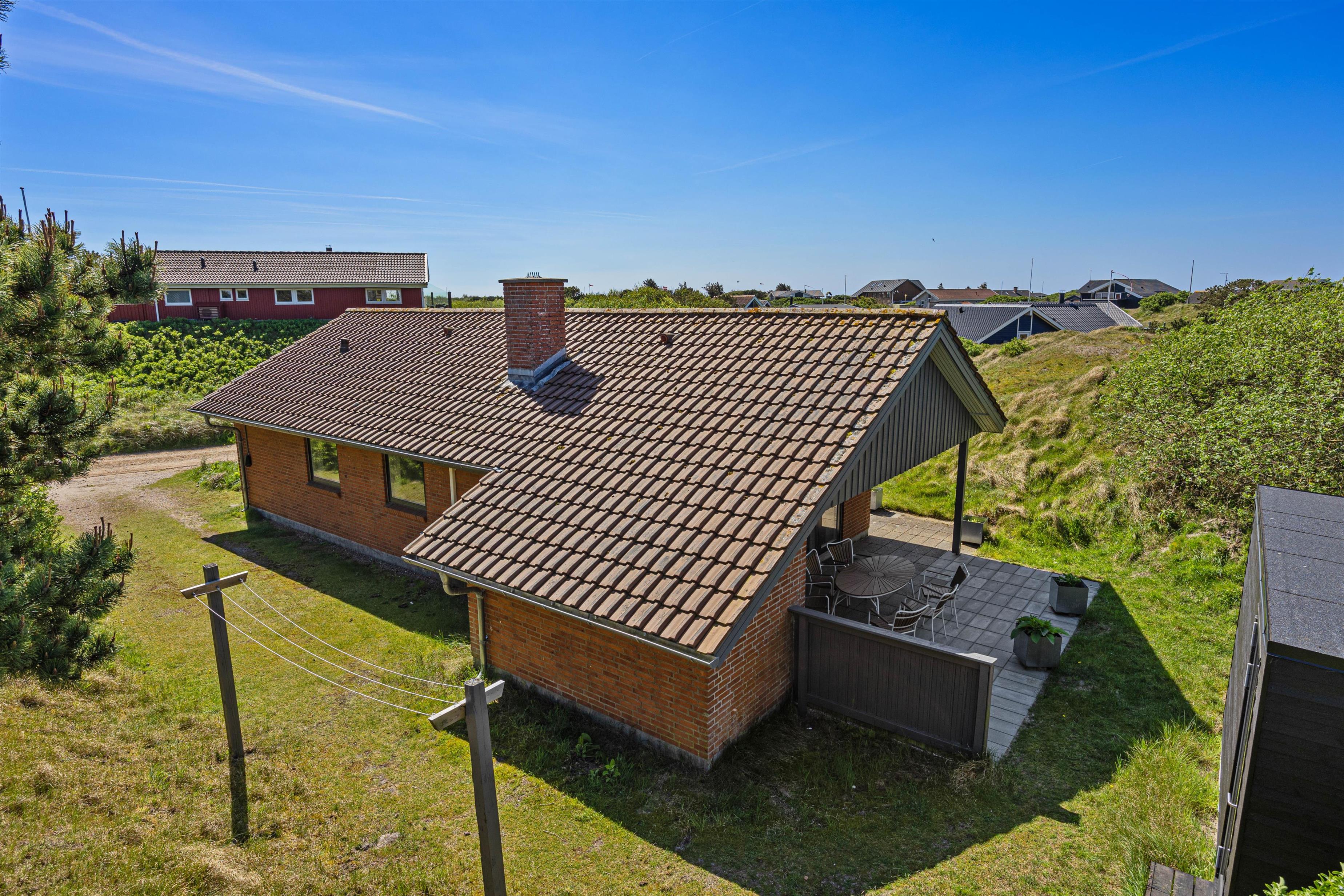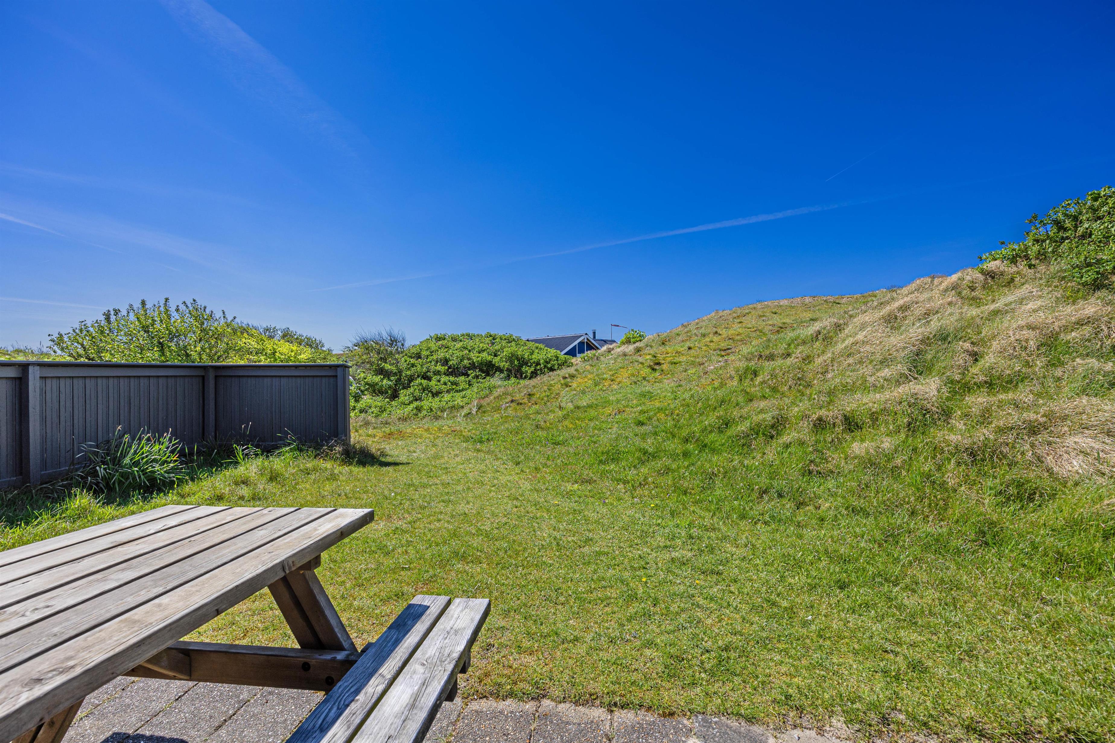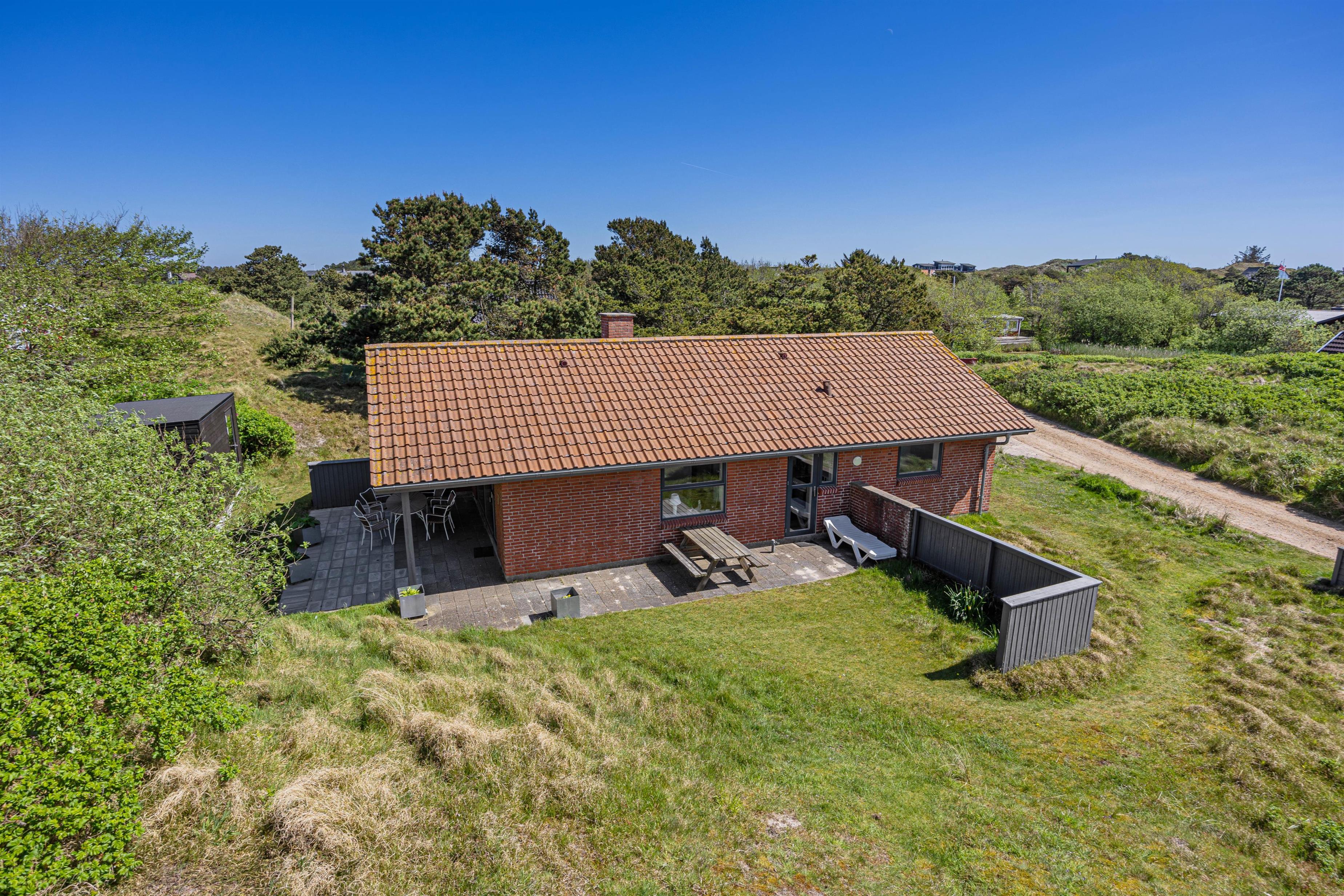 På den skønne 703m2 store naturgrund, der ligger godt i læ bag en stor klit, kan I hygge og dase i havemøblerne på den delvist åbne og overdækkede terrasse, hvor der også er opsat læhegn. Så her er der mullighed for udeliv i forskelligt slags vejr - også når der skal grilles diverse lækkerier. Når solen skinner kan I sætte jer til rette i solvognene med en god bog, og bare lade følelsen af afslapning skylle ind over jer.