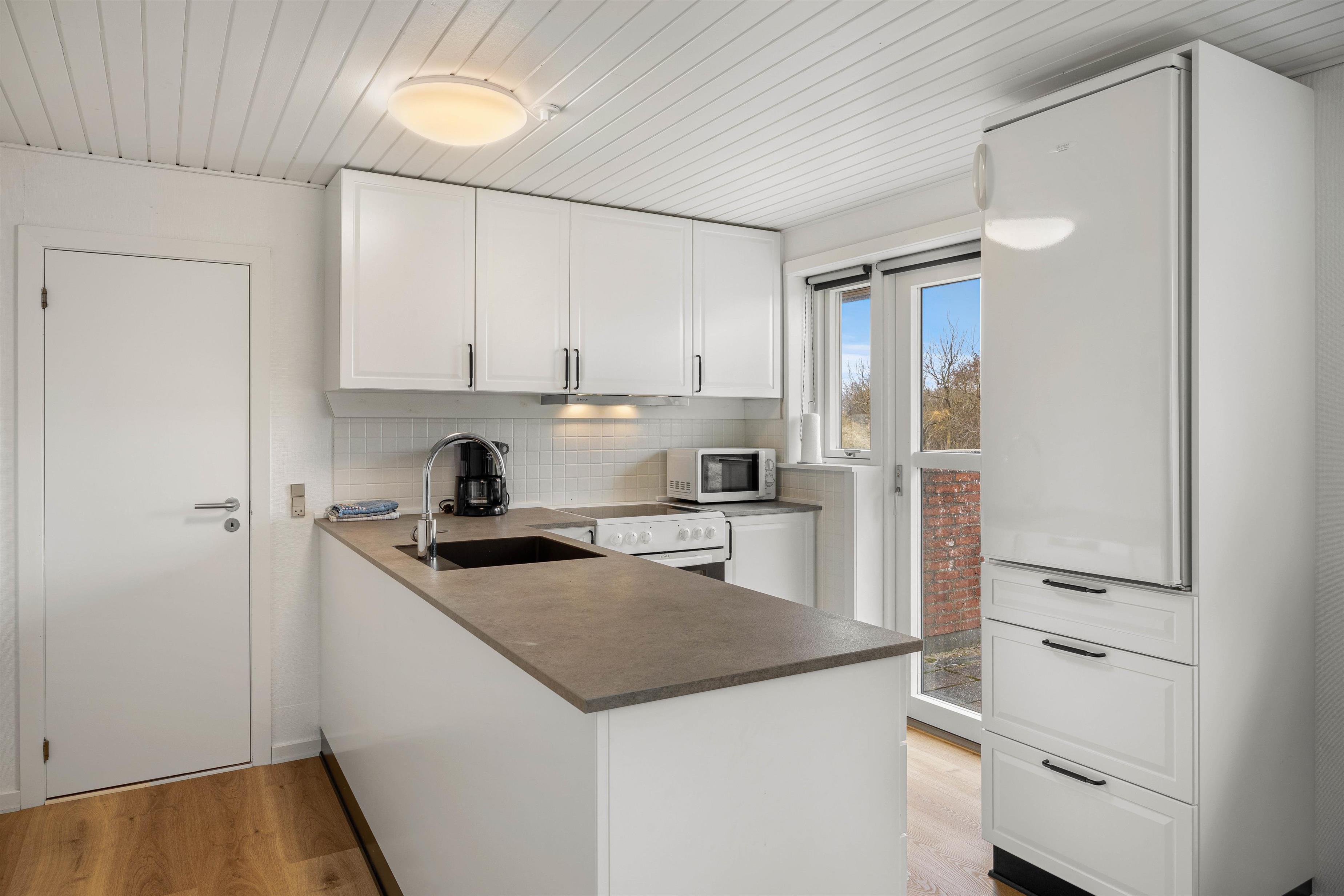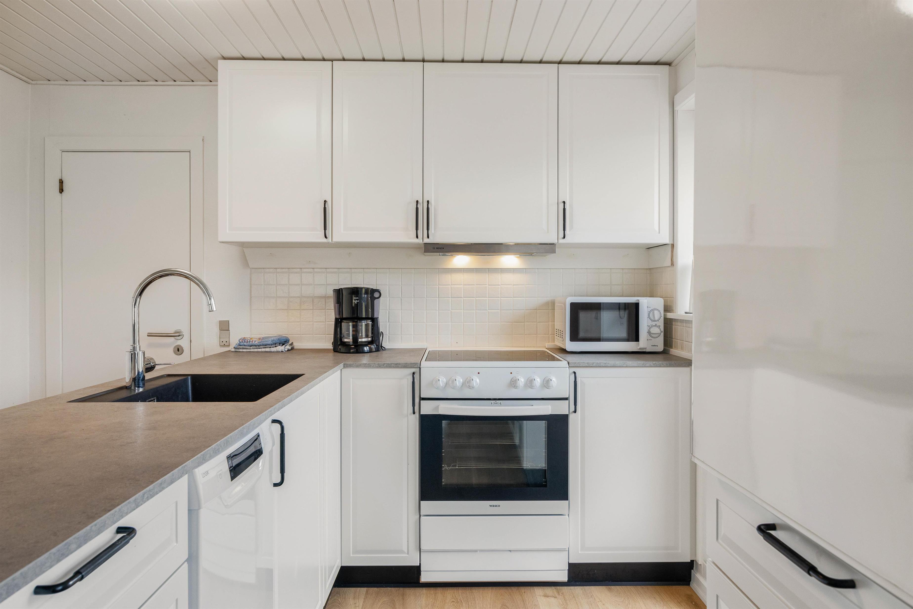 Køkken og alrum fremstår i en skøn forening. Det veludstyrede køkken er praktisk indrettet med blandt andet en opvaskemaskine samt en fryser til 40 liters opbevaring.