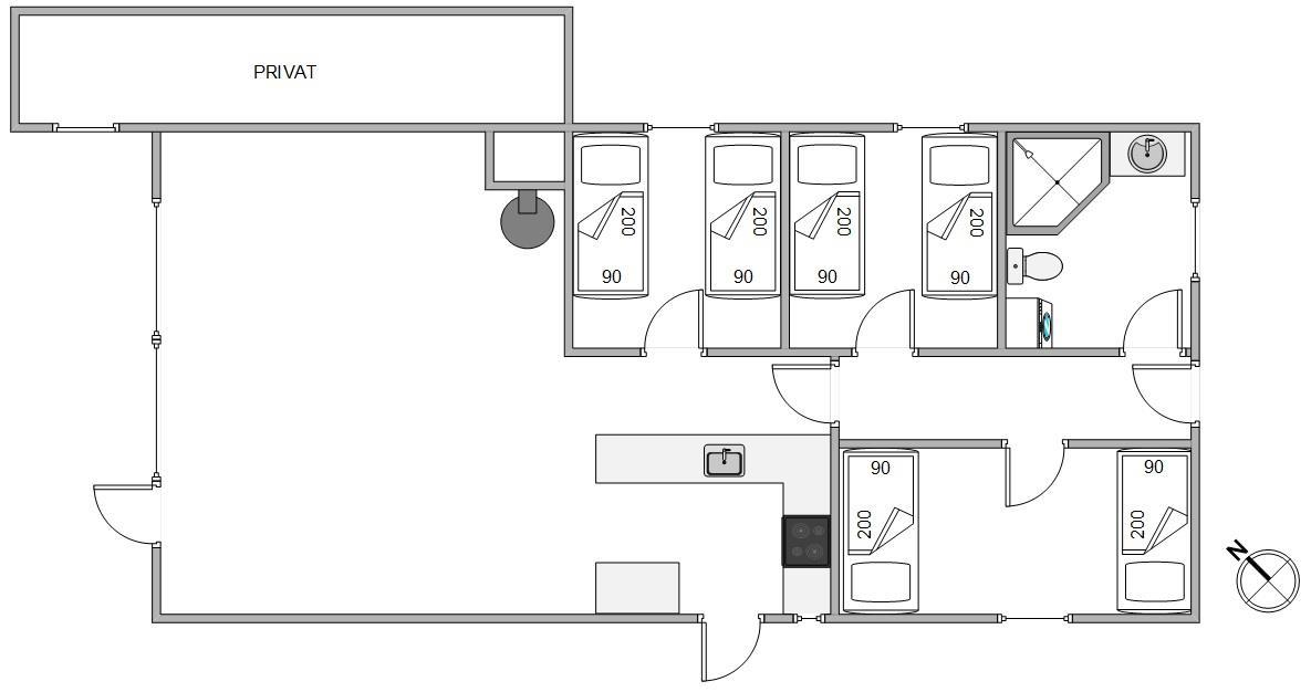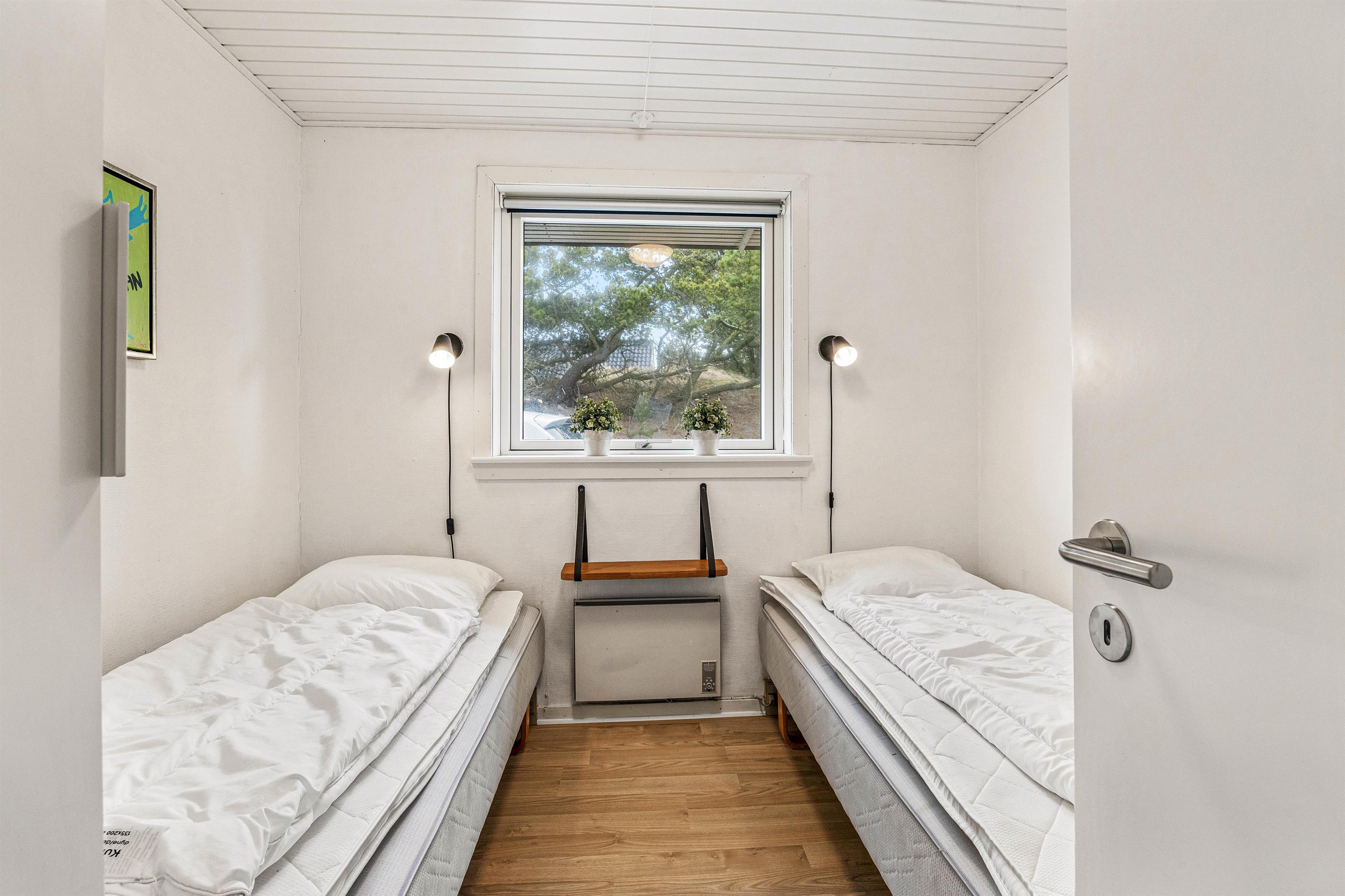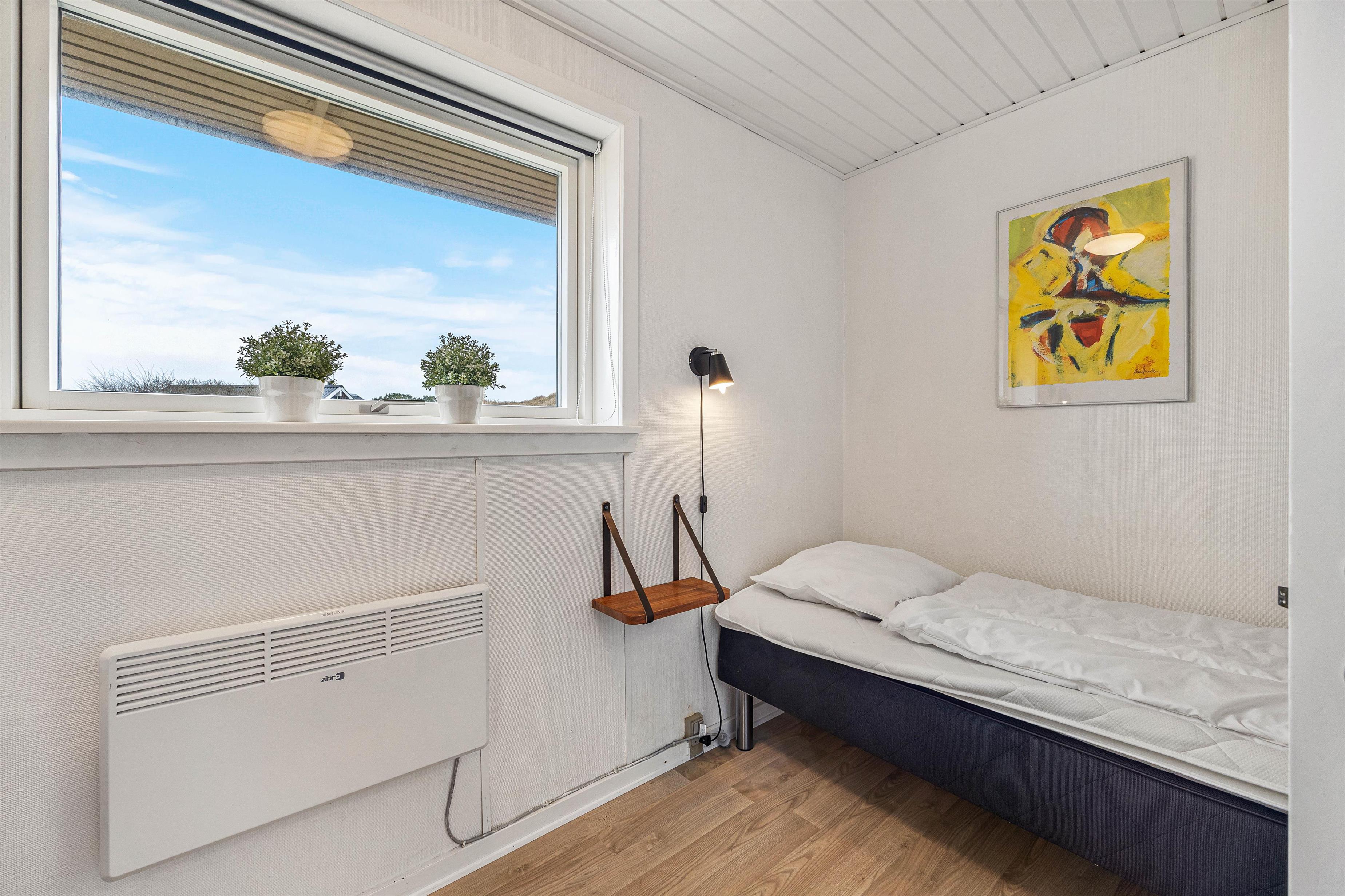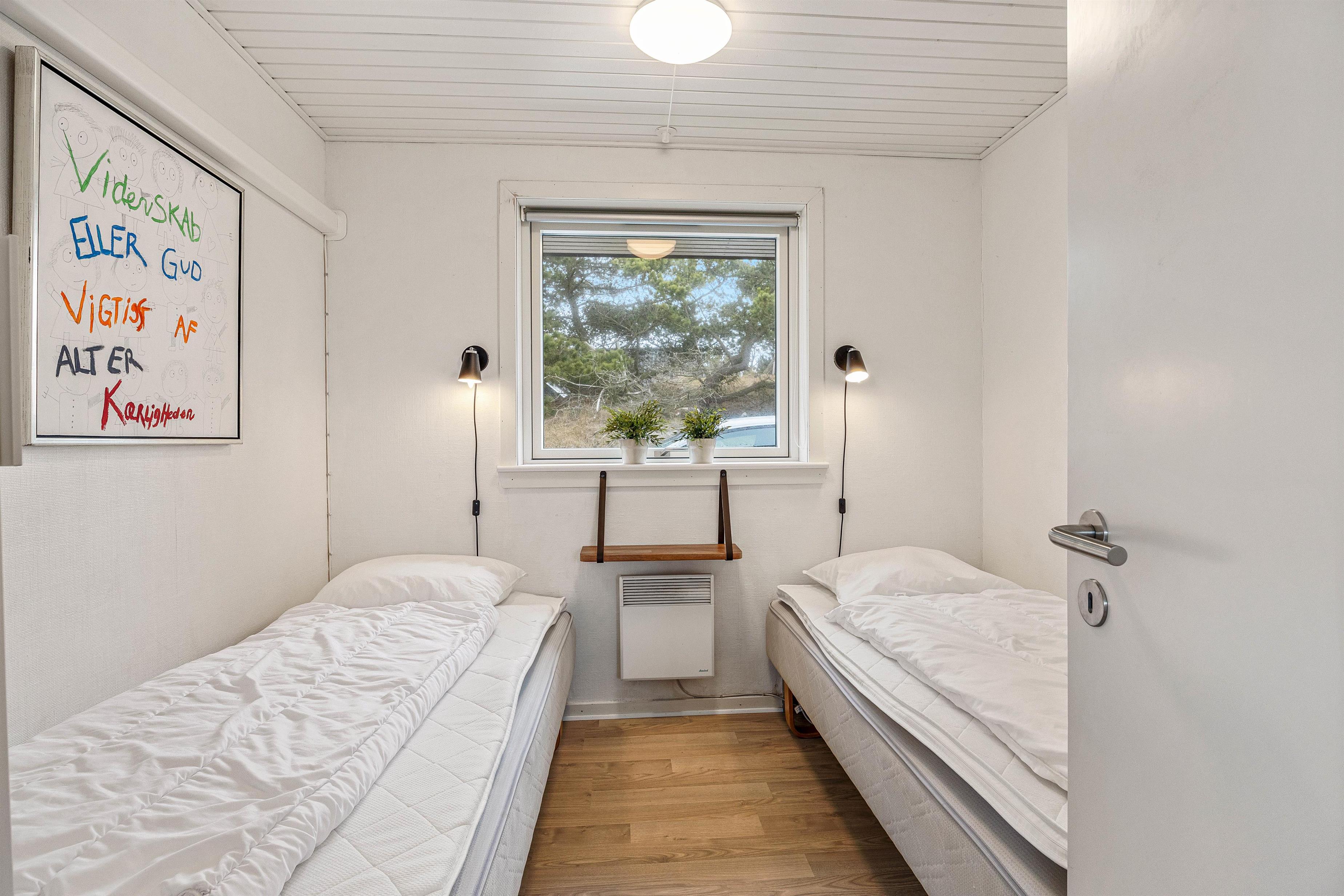 I feriehuset er der tre lyse soveværelser med hver 2 enkeltsenge, der måler 90x200cm . I det indbydende badeværelse er der bruseniche, hr står vaskemaskinen også. Her behøver I ikke at fryse om fødderne, da der er indlagt gulvvarme. En energisparende luft til luft varmepumpe er med til at sikre et energivenligt ophold i feriehuset og et godt indeklima.