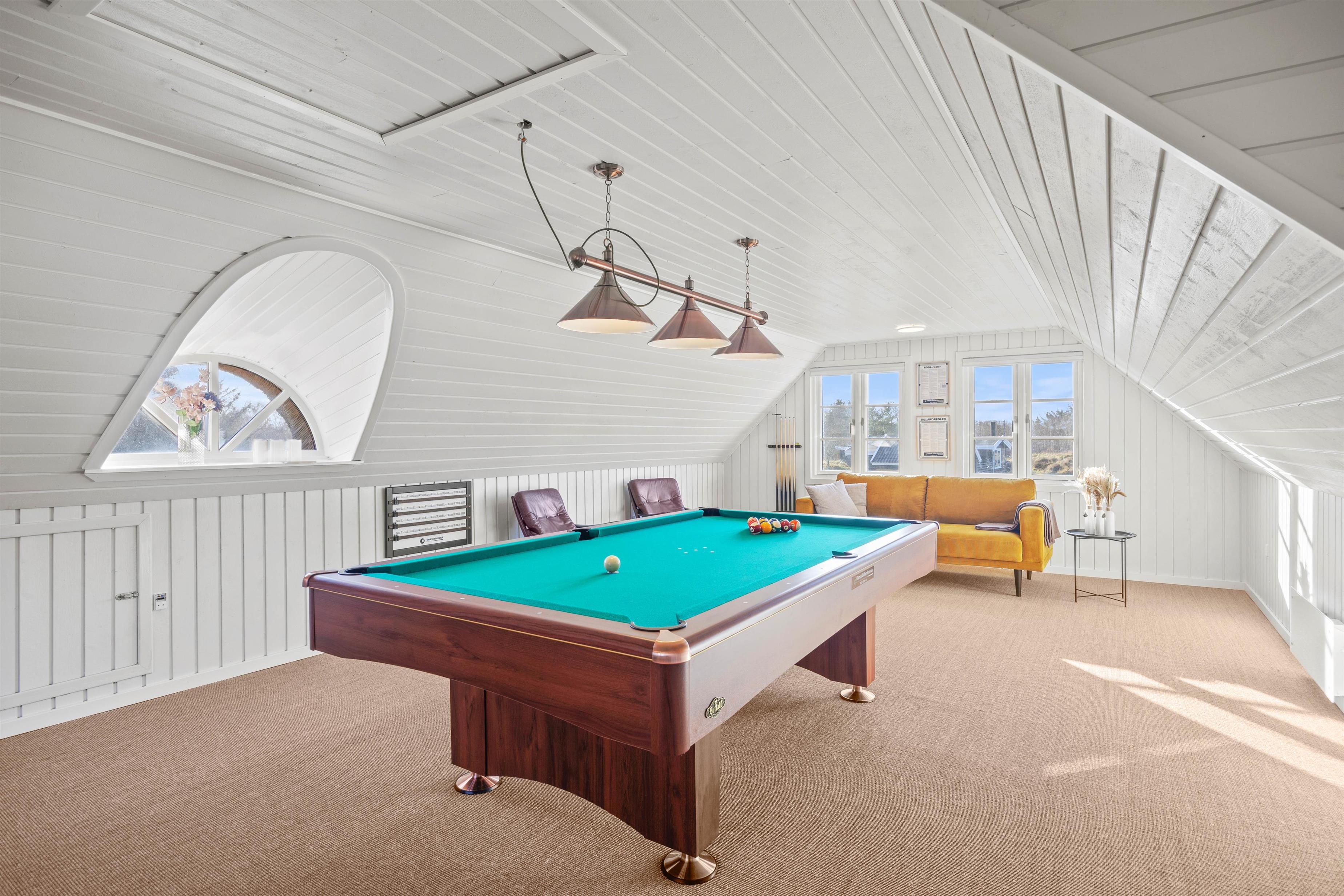 Feriehusets samlingspunkt er det store alrum, der forener køkken og stue. Her er en smagfuld indretning og afslappende atmosfære. I det funktionelle køkken, kan der tilberedes dejlig mad, som samler familien omkring det lange spisebord. Afslut aftenen med en hyggelig brætspilsaften, på sofaen eller måske med et spil pool i aktivitetsrummet? Med både billard- og bordtennis bord er I lovet mange timers sjov, mens I kan få glæde af saunaen efter en lang gåtur på stranden.