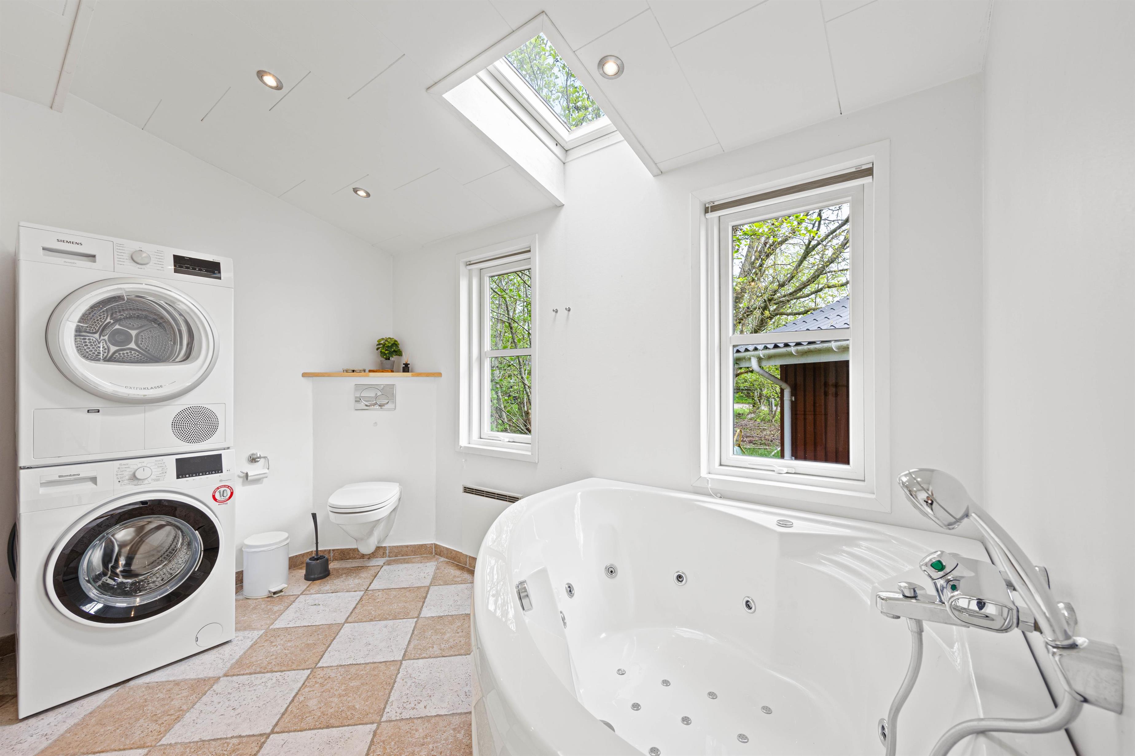 Vaskesøjlen med vaskemaskine og tørretumbler finder I på feriehusets badeværelse. Også her finder I spaen, hvor I kan komme helt ned i gear og nyde fridagene – også helt perfekt efter en lang dag med eventyr og oplevelser.